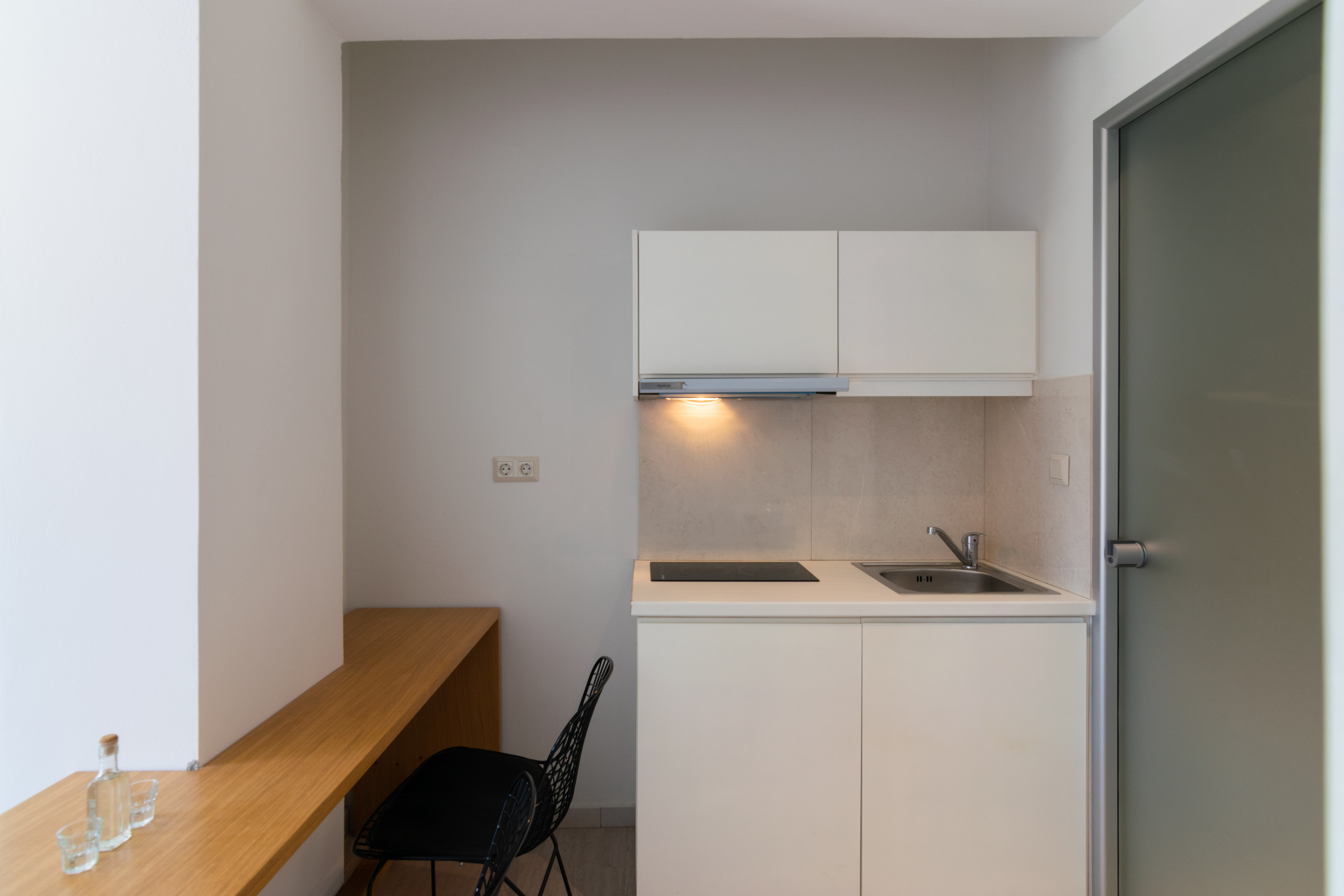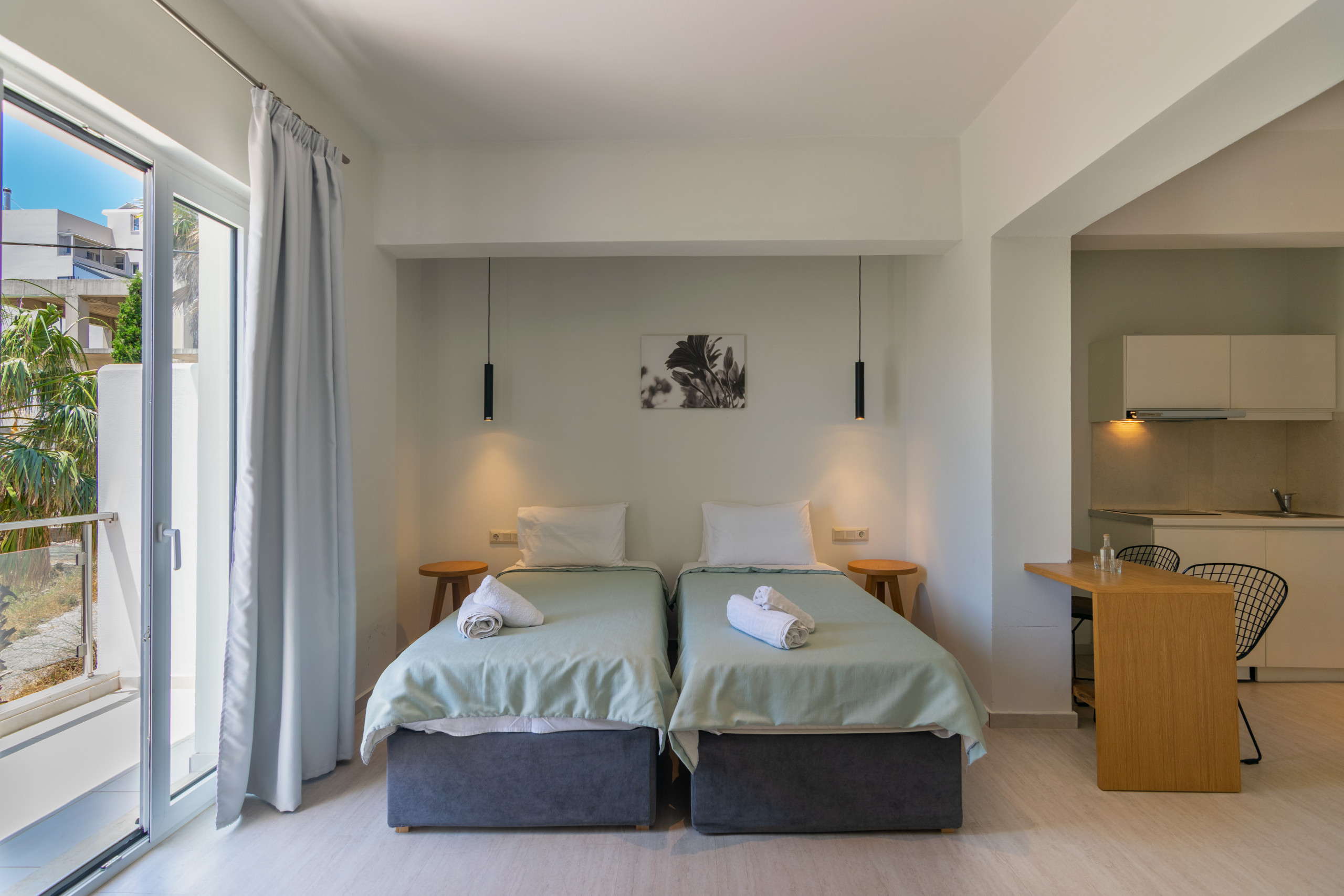 • Studio 14 (2–3 Gäste): Erstes Studio im Erdgeschoss mit Doppelbett und Schlafsofa, Küchenzeile (2 Kochplatten & Minibackofen), Dusche/WC und möbliertem Balkon.