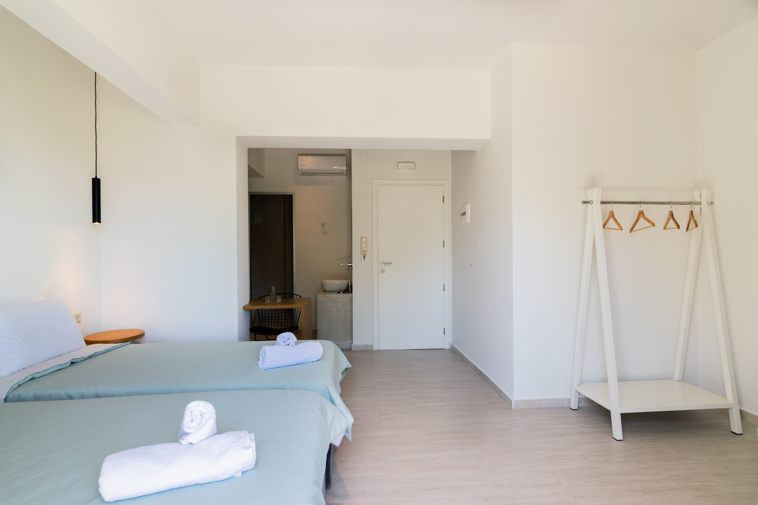 • Studio 12 (2–3 Gäste): Erstes Studio im Erdgeschoss mit Doppelbett und Schlafsofa, kleine Küchenzeile (2 Kochplatten & Minibackofen), Dusche/WC und möbliertem Balkon.