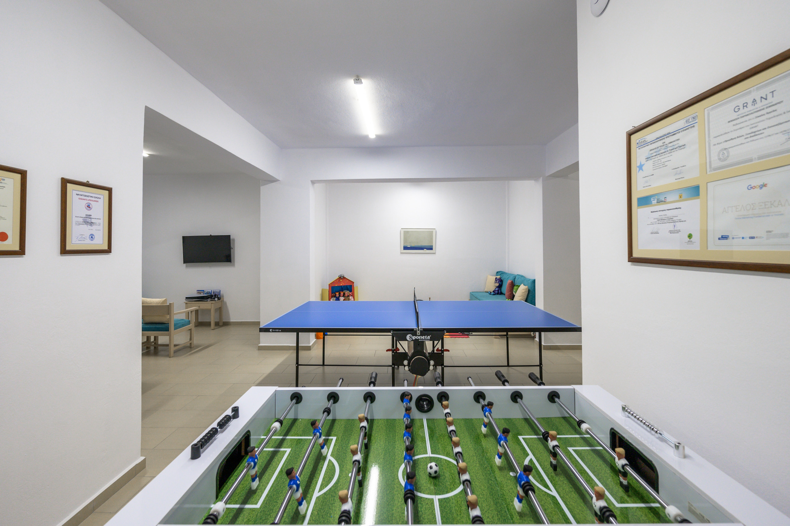 Der Keller der Villa ist ein speziell gestalteter Freizeitraum für alle Altersgruppen. Er verfügt über einen großen Fernseher mit einer PlayStation 5 und einer umfangreichen Spieleauswahl, einen Bluetooth-CD-Player, einen Tischtennistisch, Tischfußball, Brettspiele und eine Vielzahl von Spielzeugen, die sogar für Säuglinge geeignet sind. Zwei bequeme Sofas bieten einen gemütlichen Platz zum Entspannen oder können als zusätzliche Schlafgelegenheiten für den 9. und 10. Gast dienen. Für Fitness-Enthusiasten ist die Villa gut ausgestattet mit einem Mehrzweck-Heimtrainingsgerät, einem Familien-Heimtrainer und einer Trainingsbank im Keller, während auf der ersten Etage ein Crosstrainer verfügbar ist. Hochgeschwindigkeits-WLAN ist im gesamten Objekt zugänglich und gewährleistet eine nahtlose Konnektivität während Ihres Aufenthalts.