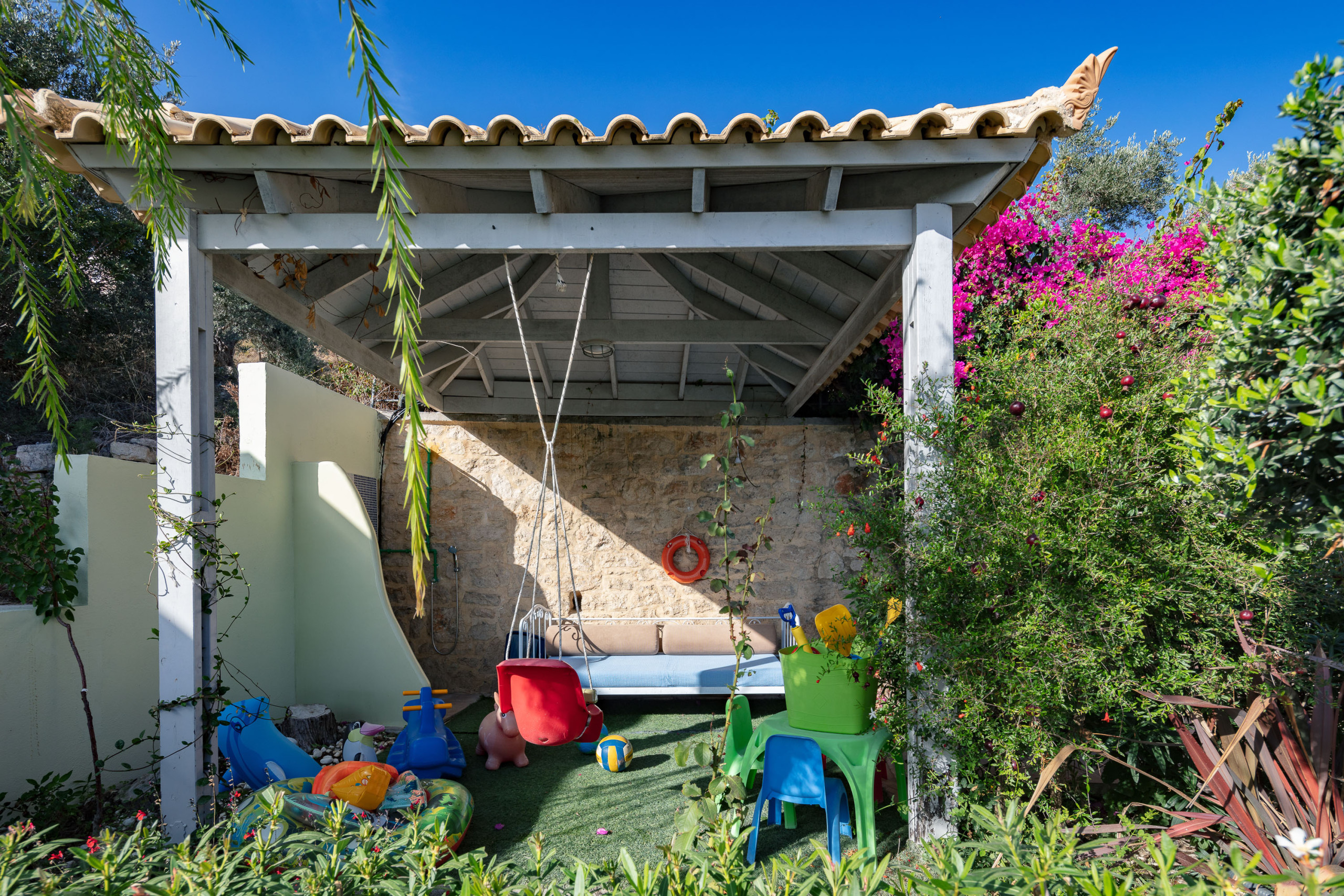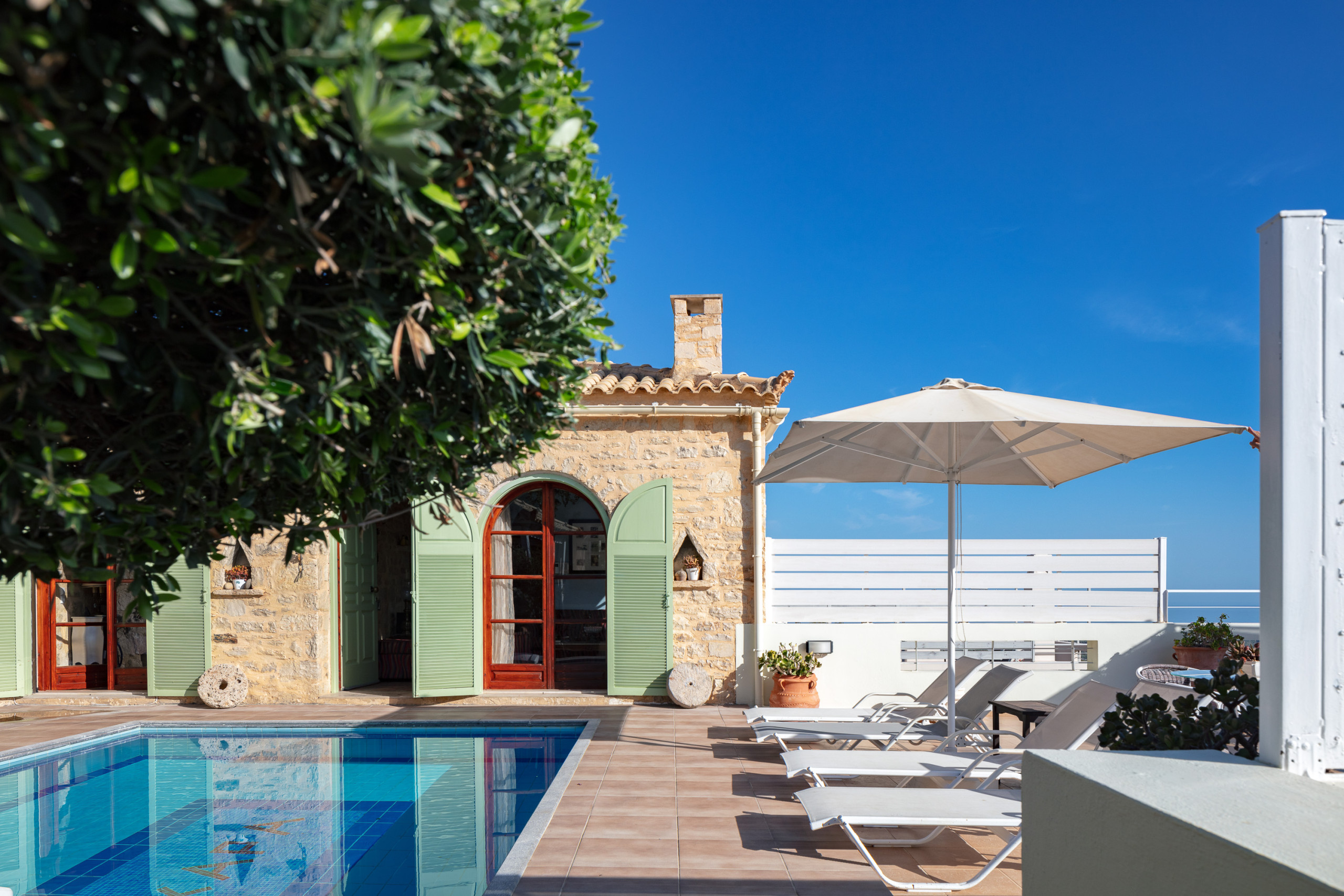 Draußen erstreckt sich die Villa Hara über ein geräumiges Grundstück, umgeben von Natur und mit Panoramablick aufs Meer. Der private 20 m² große Swimmingpool lädt ein, unter der kretischen Sonne abzukühlen, während schattige Sitz- und Essbereiche, ein traditioneller Steingrillplatz und ein Kinderspielplatz die perfekte Kulisse für Familienmomente und entspanntes Outdoor-Leben schaffen.
