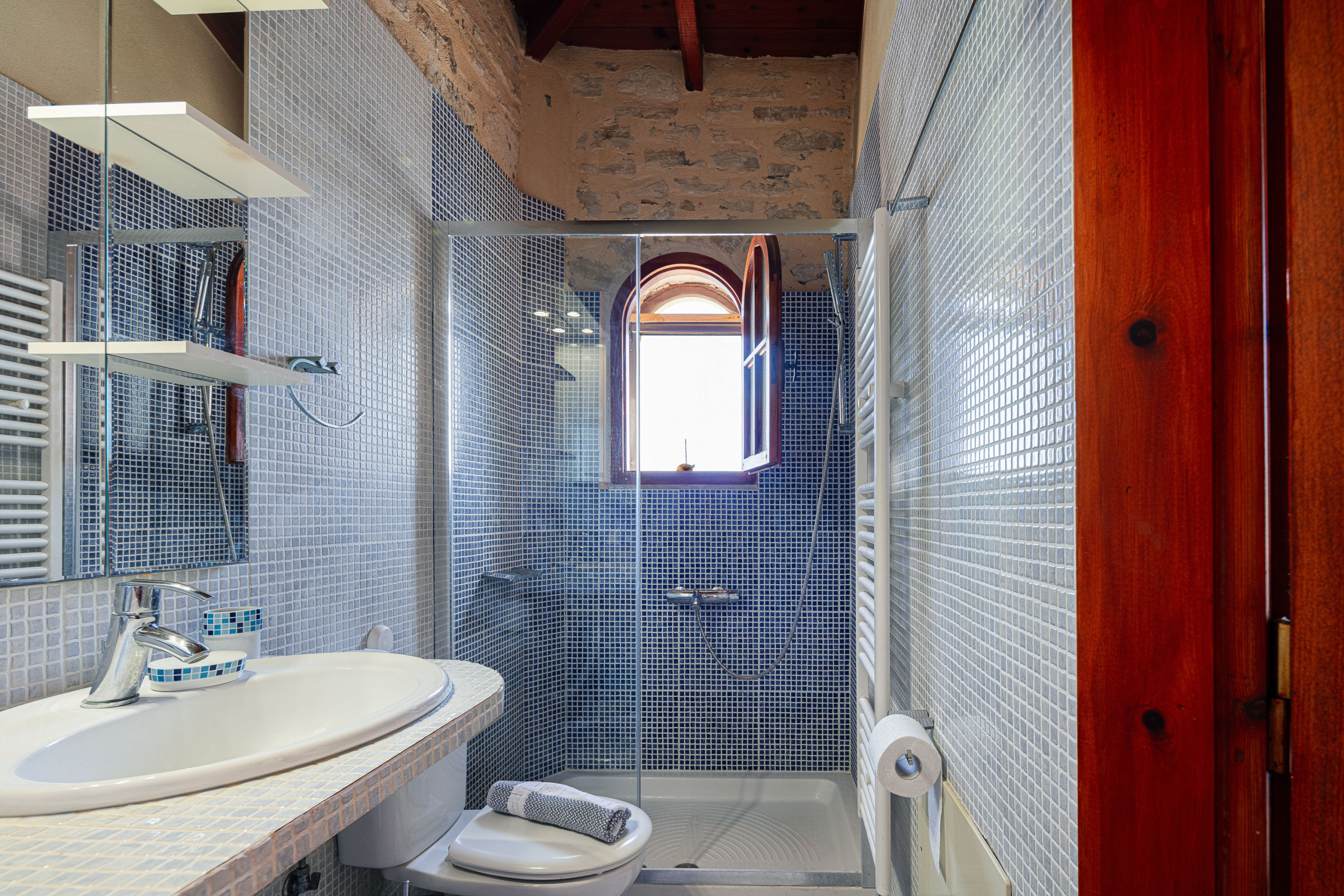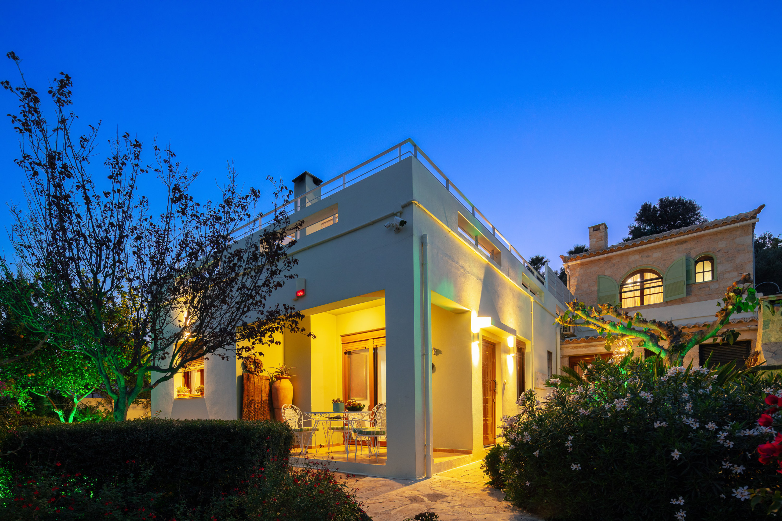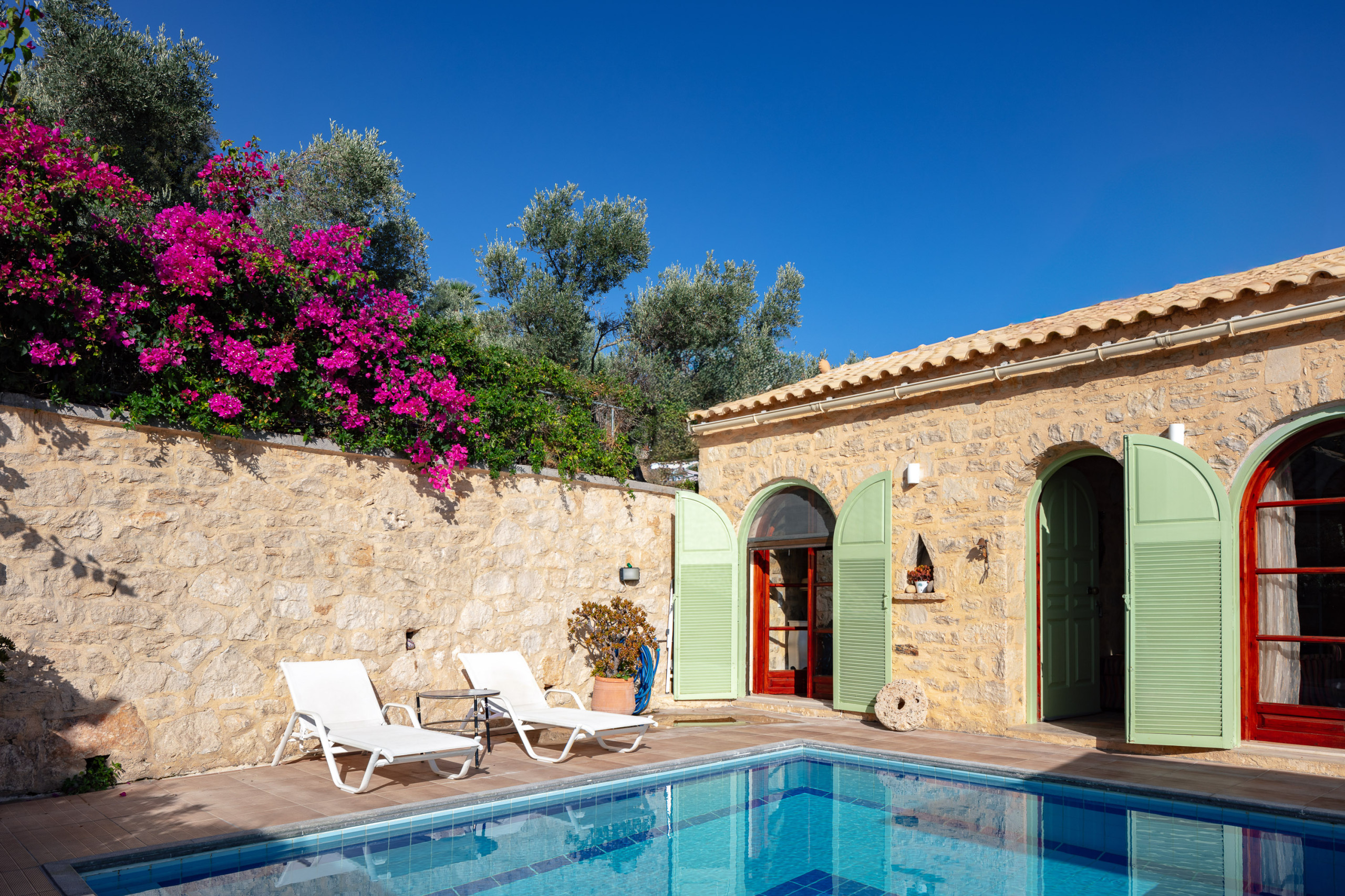 Das Haupthaus verfügt über einen gemütlichen Wohnbereich mit offenem Kamin und einem 55-Zoll-Smart-TV, der nahtlos mit einer voll ausgestatteten Küche und einem Essbereich verbunden ist, der bequem bis zu acht Gäste aufnehmen kann. Drei der Schlafzimmer befinden sich hier, jedes mit traditionellen Details ausgestattet und direktem Zugang zur Poolterrasse. Eines von ihnen verfügt über ein eigenes Badezimmer, während die anderen beiden ein geräumiges Familienbadezimmer teilen, das mit einer Badewanne, Waschmaschine und Trockner ausgestattet ist.