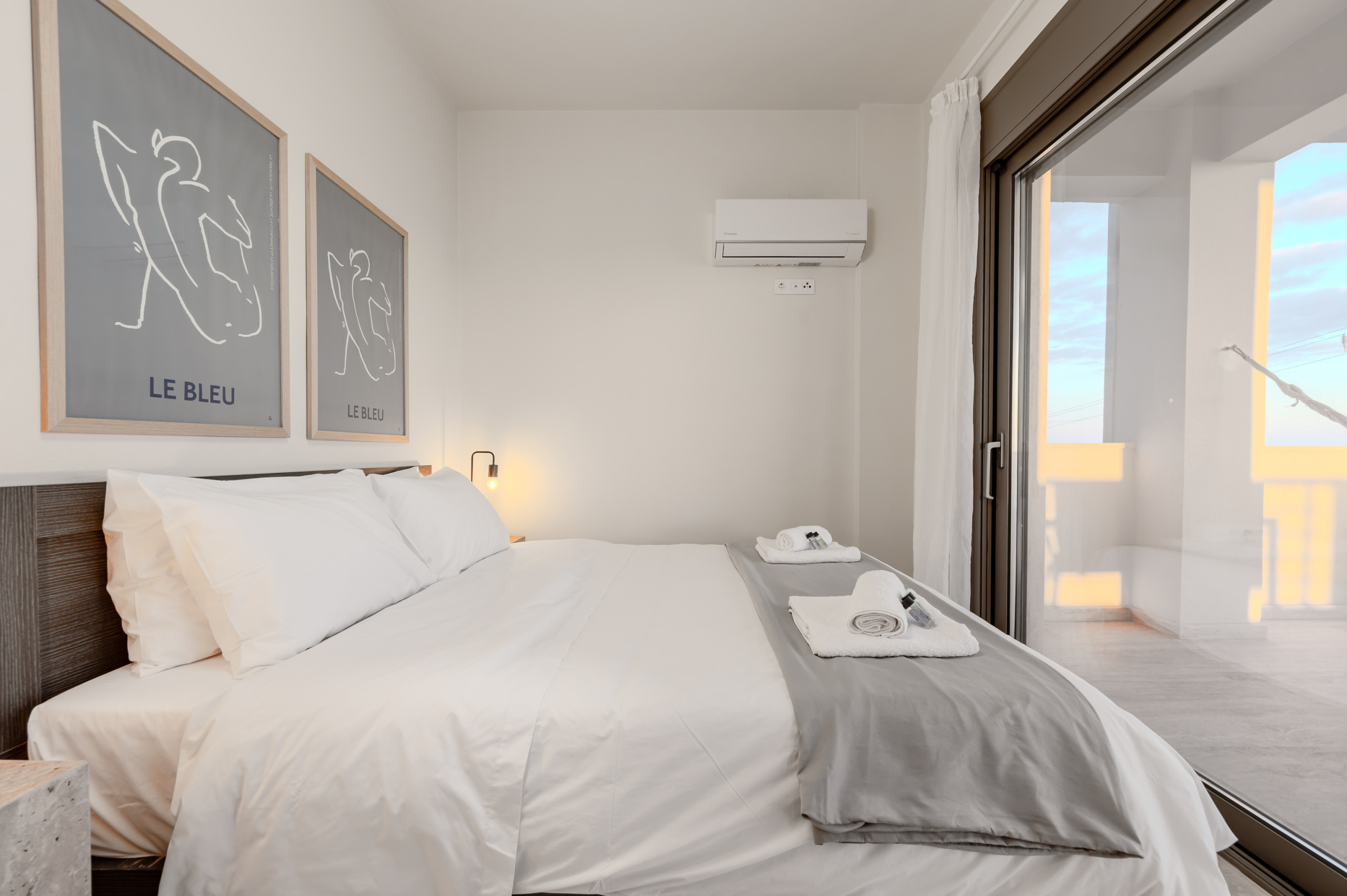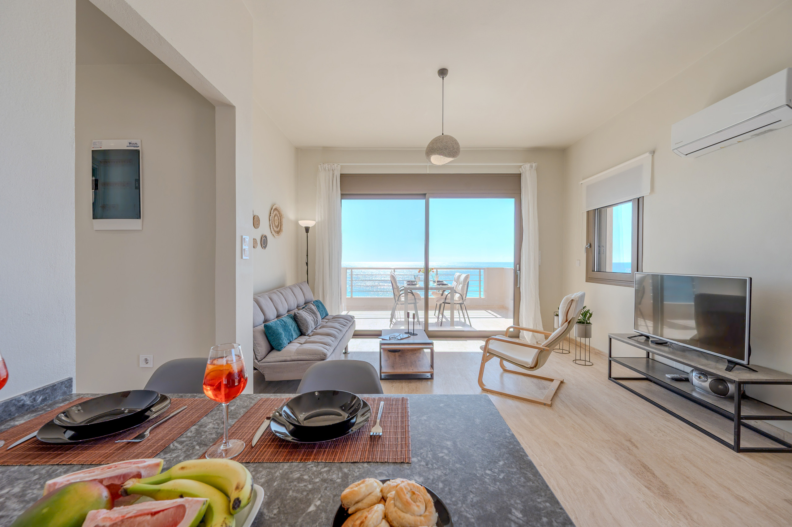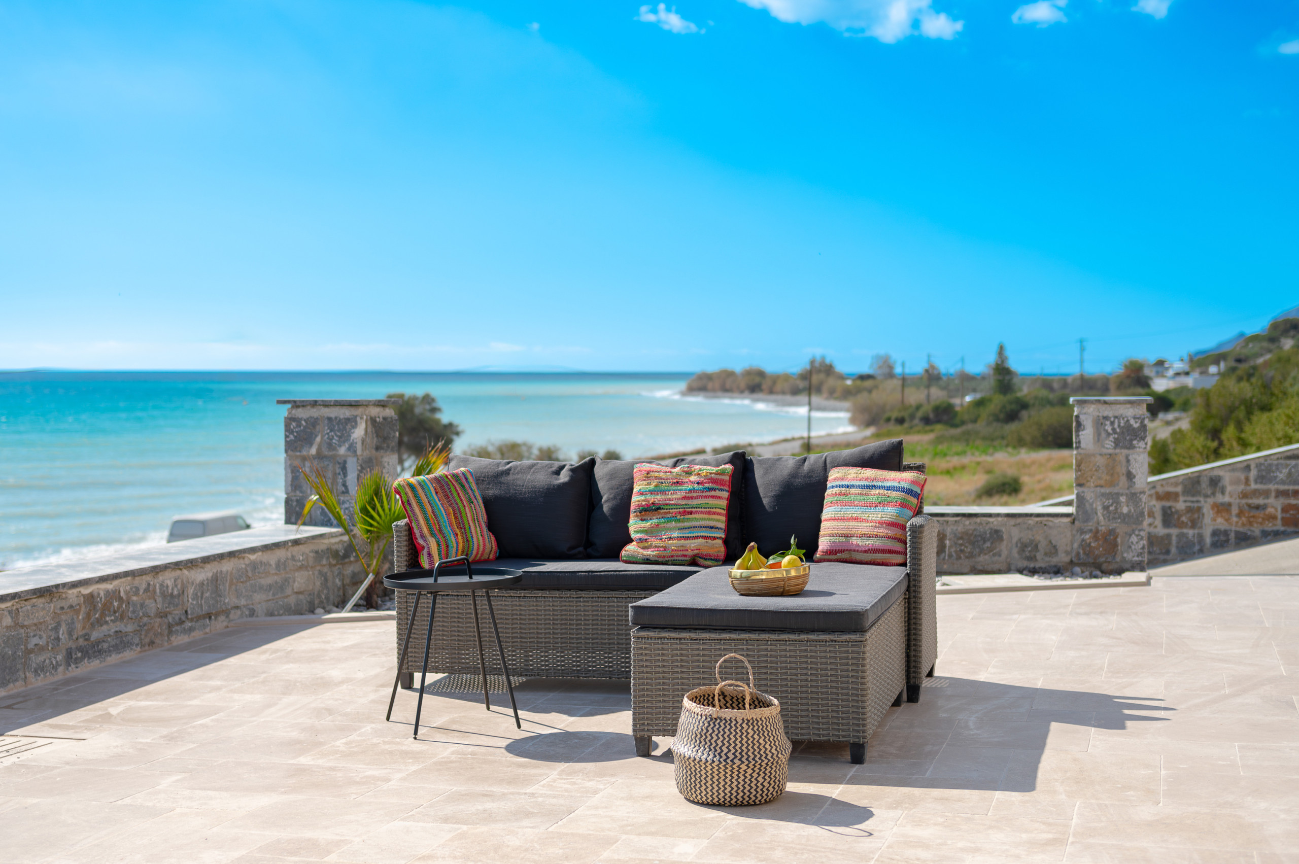 Ein Schlafzimmer und der Wohnbereich öffnen sich zu einem geräumigen Balkon mit Meerblick, der mit einem Esstisch ausgestattet ist - perfekt für Dining im Freien bei ungestörtem Blick auf den Strand und das Südkretische Meer.
