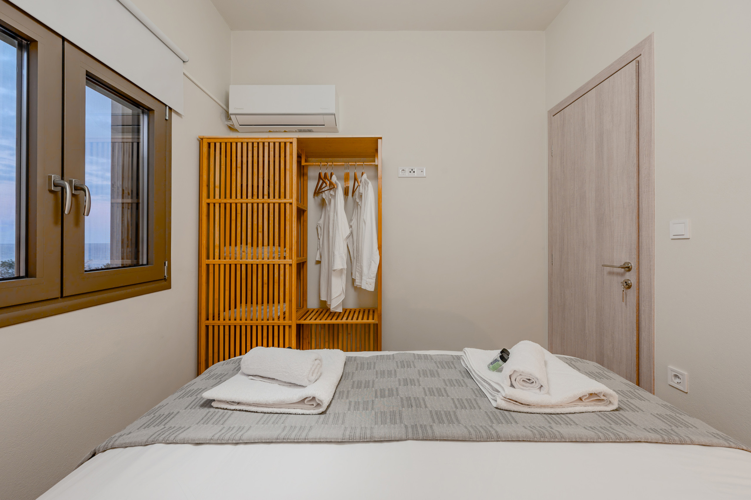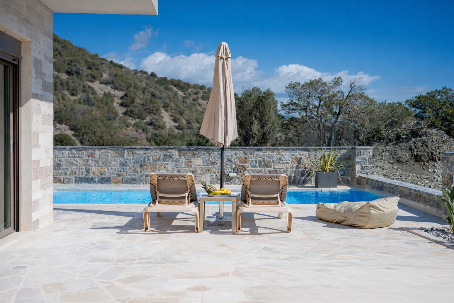 Im Erdgeschoss genießen die Gäste einen privaten Außenbereich, der ausschließlich dieser Villa vorbehalten ist und eine private Schwimmbad, Sonnenliegen, Sonnenschirme und einen Grillbereich umfasst, ideal zum Entspannen unter der kretischen Sonne in völliger Privatsphäre.