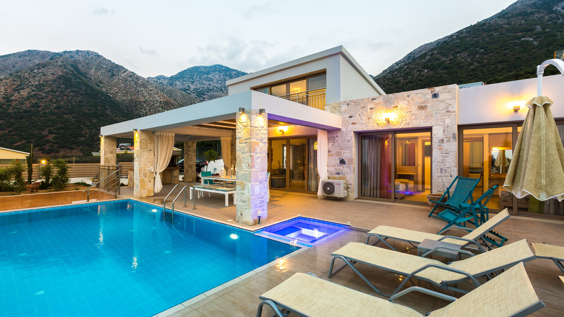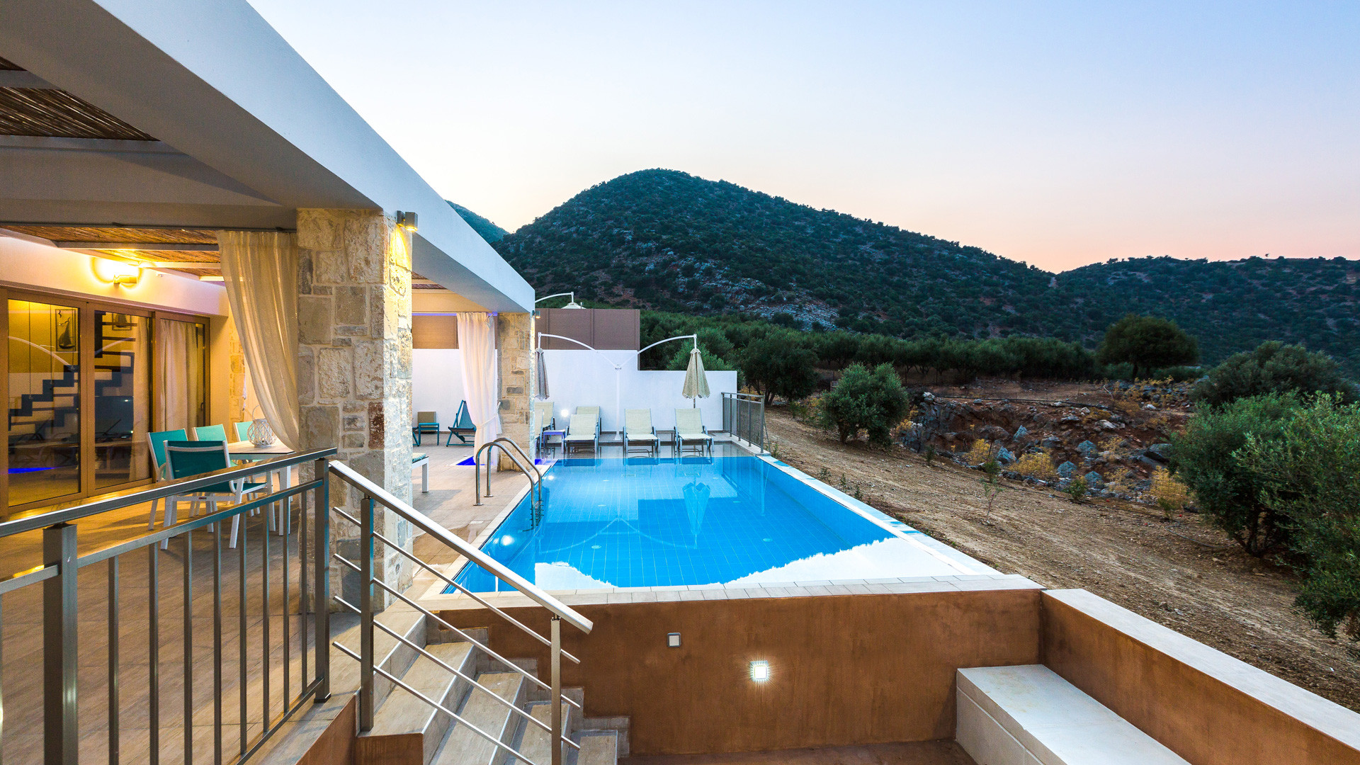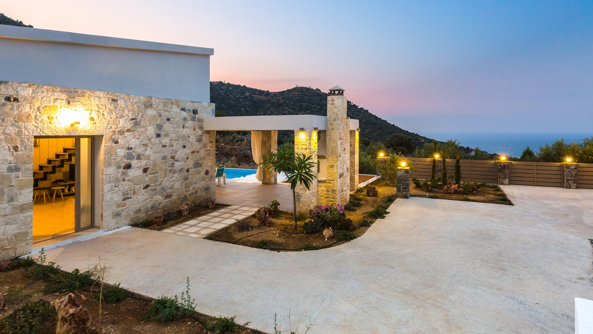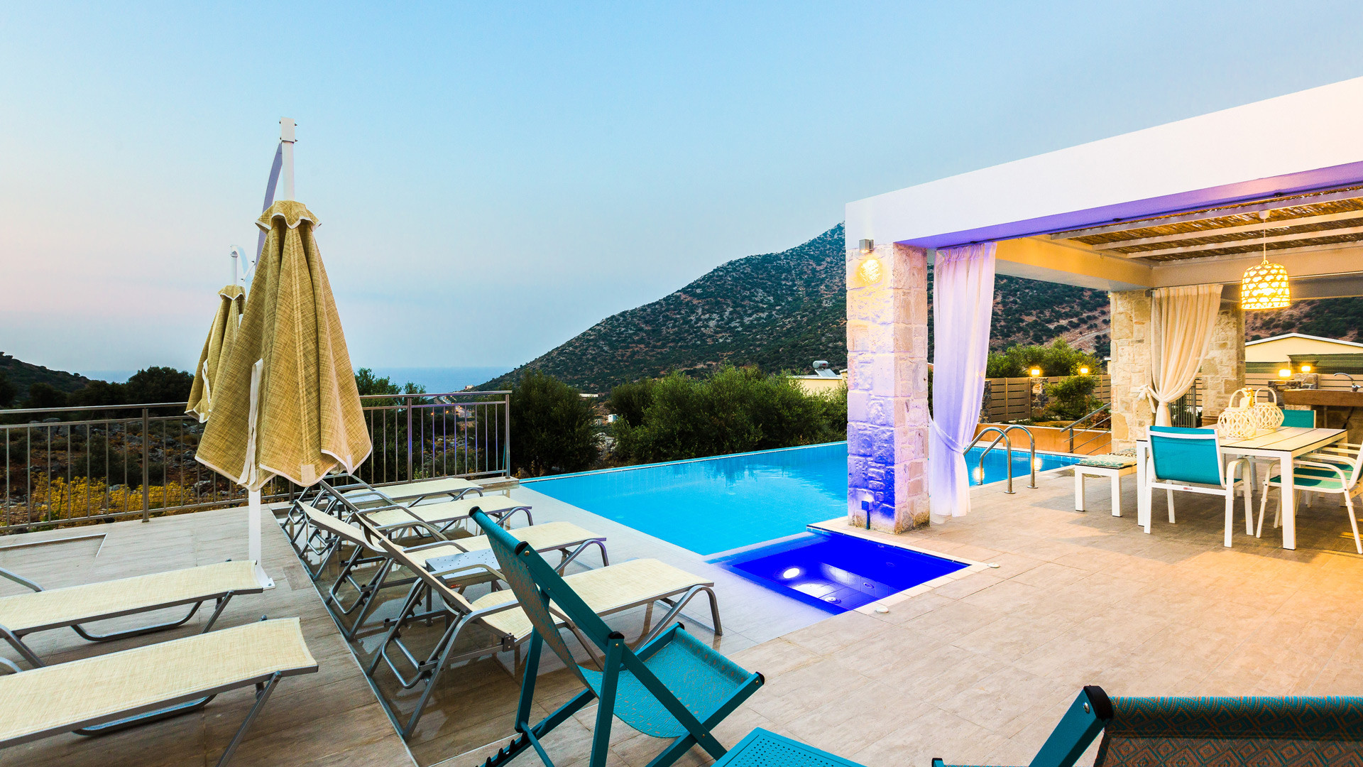 Im Außenbereich befindet sich eine großzügige Terrasse mit einem 35 m² großen privaten Pool mit integriertem Whirlpool, Sonnenliegen und Sonnenschirmen und bietet einen Panoramablick auf das kretische Meer und die Landschaft. Gäste können im Freien unter der schattigen Pergola mit Grillplatz und großem Esstisch speisen – ideal für unvergessliche Familienessen oder gesellige Zusammenkünfte. Nachts schaffen der beleuchtete Pool und Garten eine romantische und magische Atmosphäre.