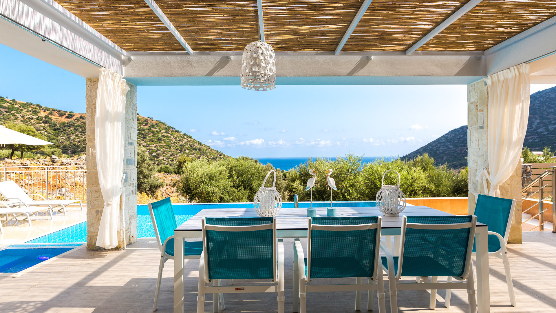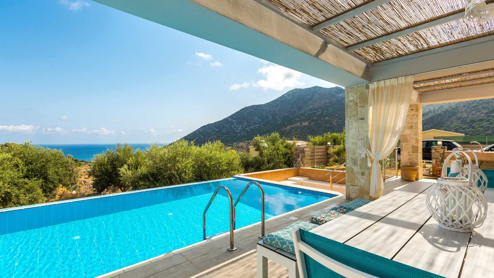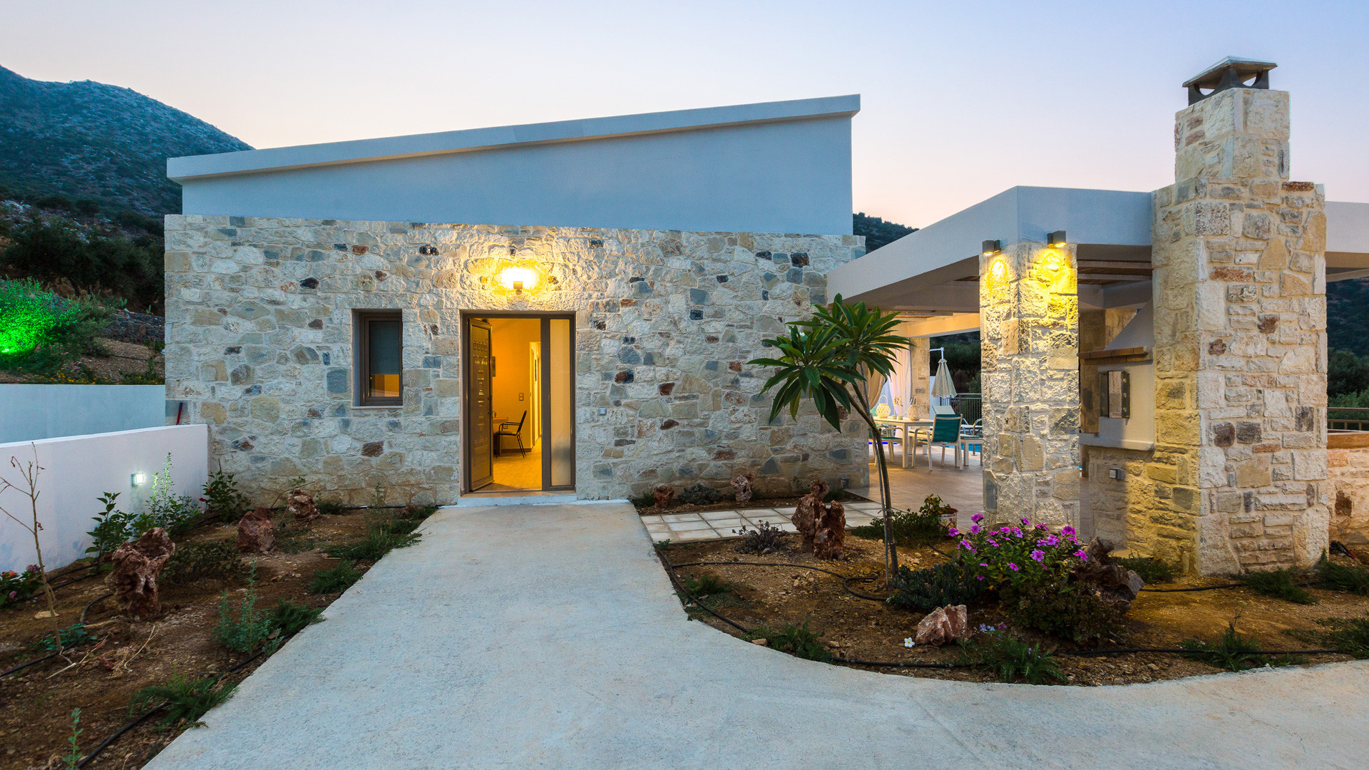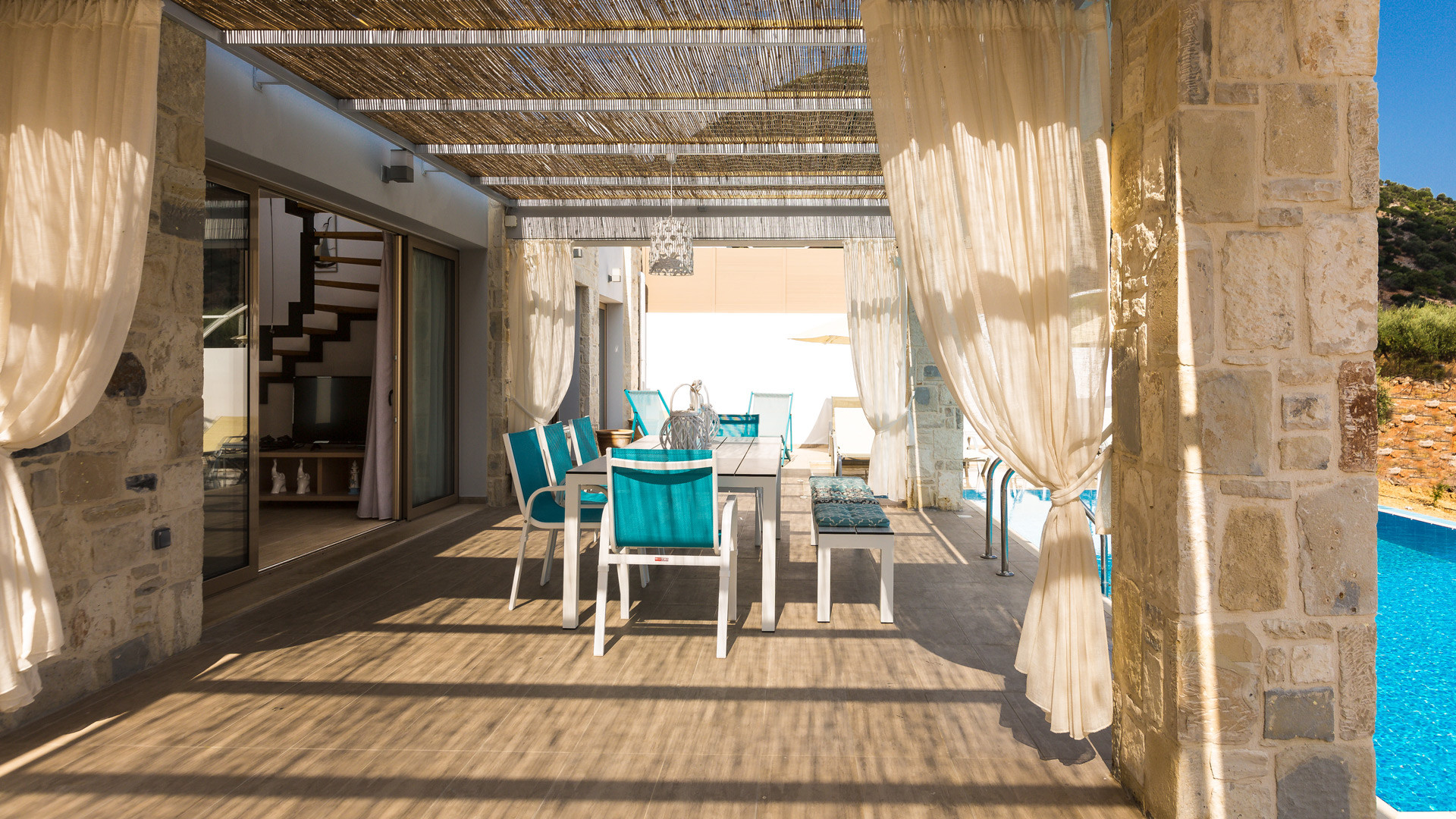 Im Außenbereich befindet sich eine großzügige Terrasse mit einem 35 m² großen privaten Pool mit integriertem Whirlpool, Sonnenliegen und Sonnenschirmen und bietet einen Panoramablick auf das kretische Meer und die Landschaft. Gäste können im Freien unter der schattigen Pergola mit Grillplatz und großem Esstisch speisen – ideal für unvergessliche Familienessen oder gesellige Zusammenkünfte. Nachts schaffen der beleuchtete Pool und Garten eine romantische und magische Atmosphäre.