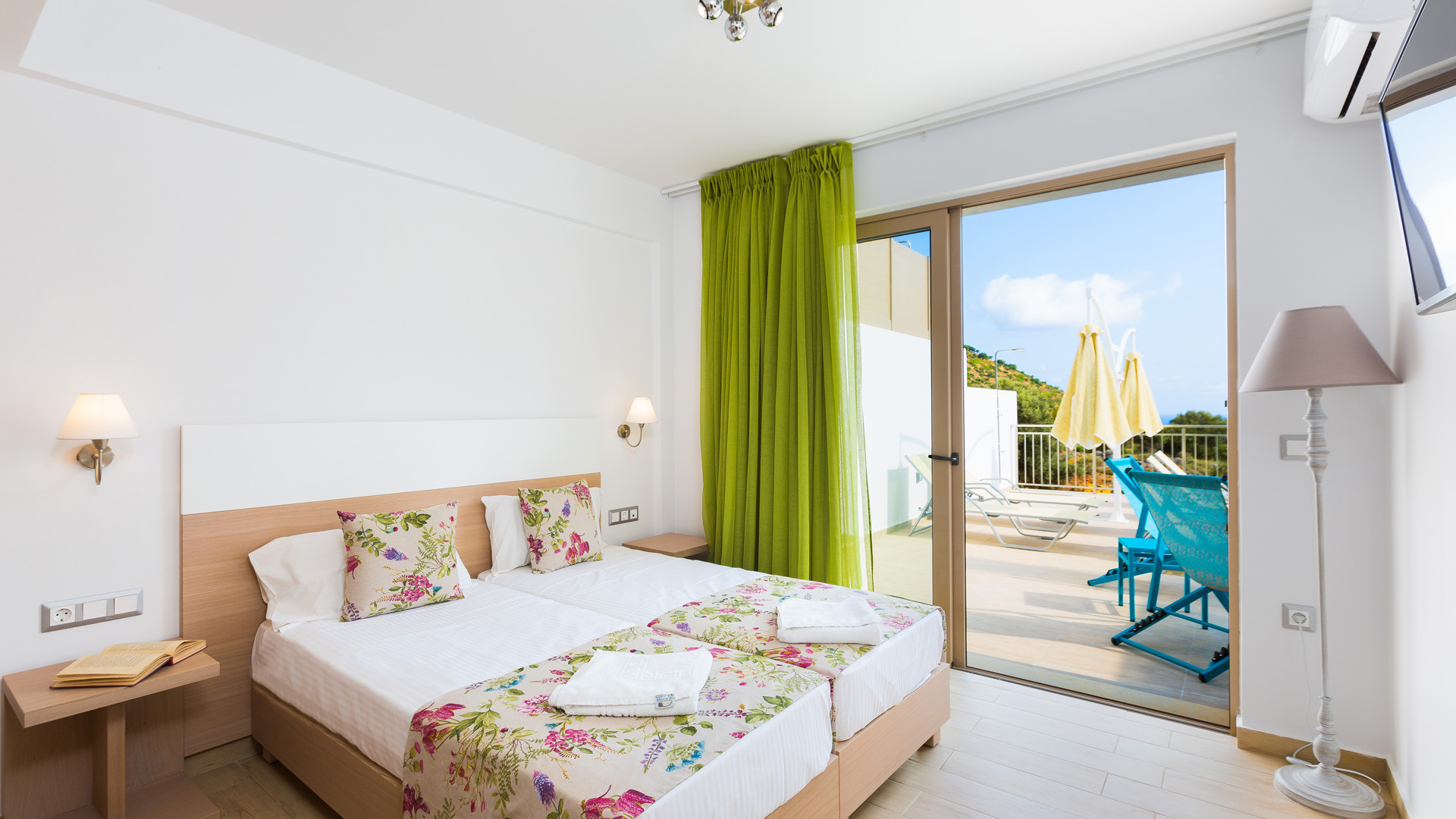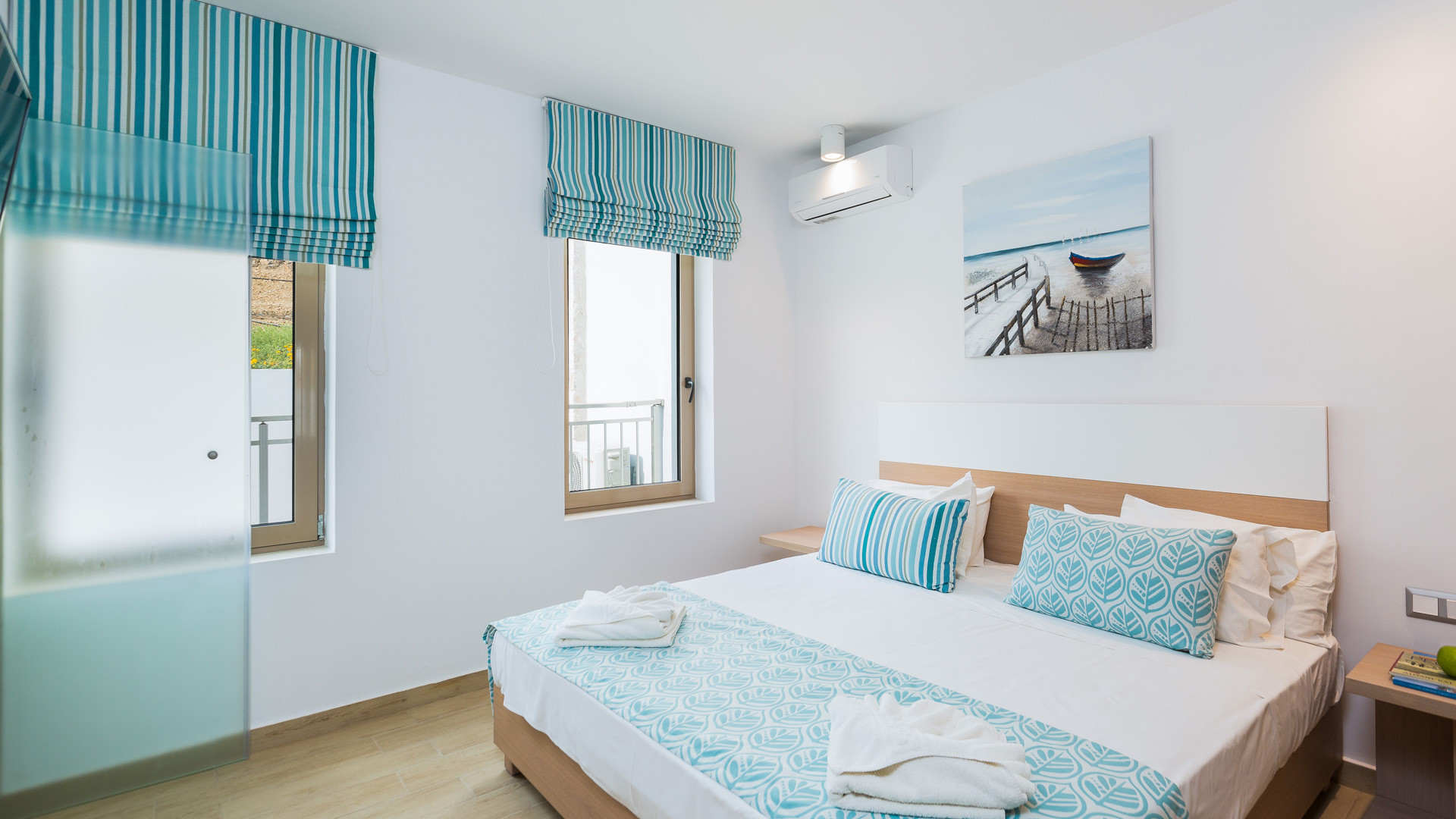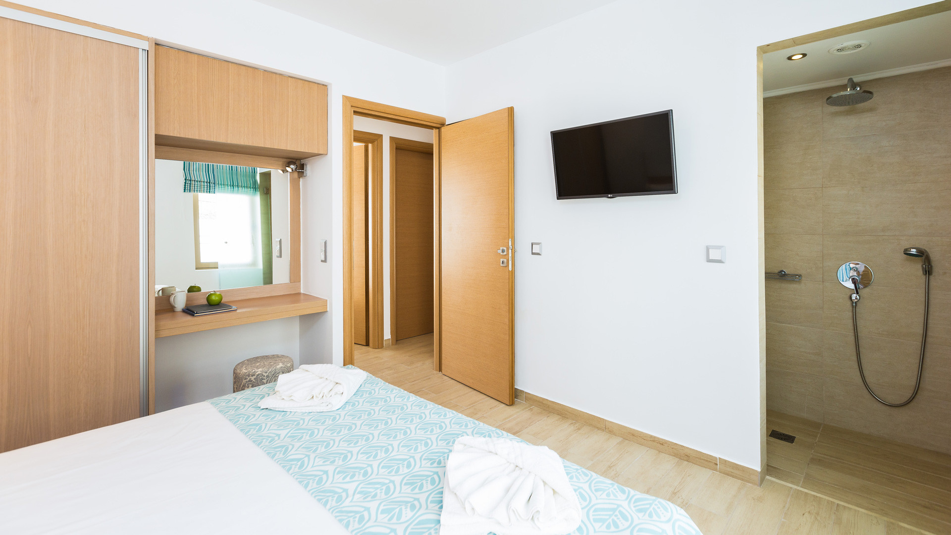 Schlafzimmer im Erdgeschoss: Zwei Doppelzimmer (eines mit eigenem Bad) und ein Zweibettzimmer, alle mit direktem Zugang zur Terrasse und Meerblick. Ein zusätzliches Familienbadezimmer mit verglaster Duschkabine sorgt für zusätzlichen Komfort.