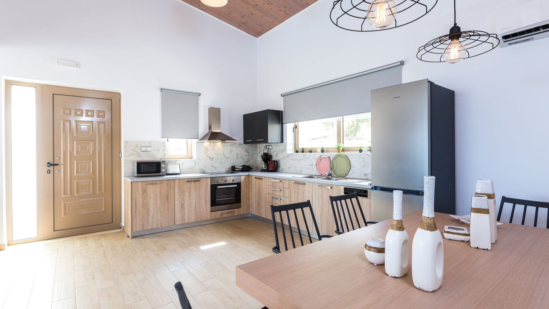 Küche & Esszimmer: Voll ausgestattete, moderne Küche mit Holzdesign und einem geräumigen Essbereich für acht Gäste.