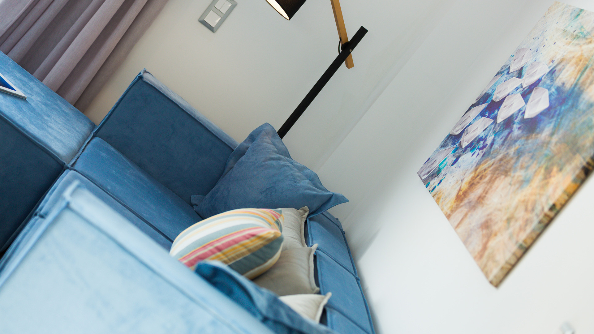 Wohnzimmer: Stilvoll eingerichtet mit einem bequemen Sofa (umwandelbar in ein Bett), Smart-TV und PlayStation (auf Anfrage). Direkter Zugang zur Poolterrasse.