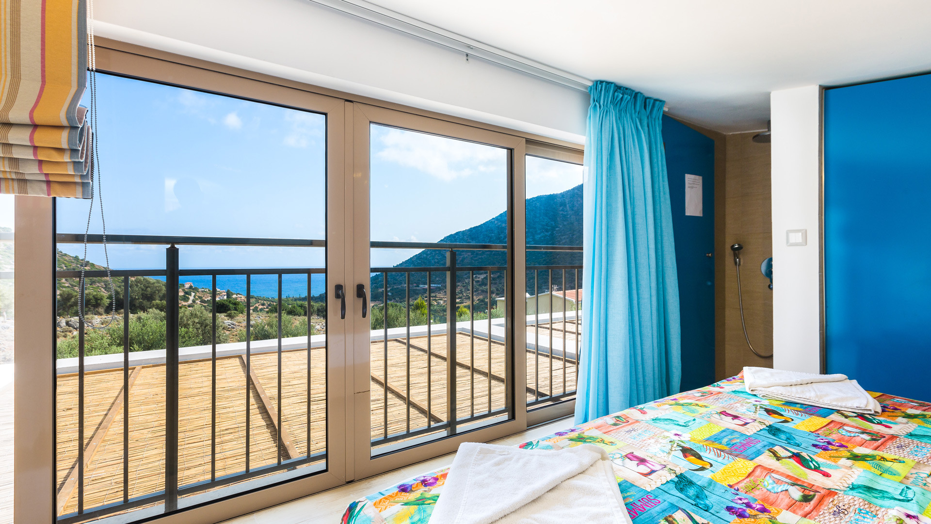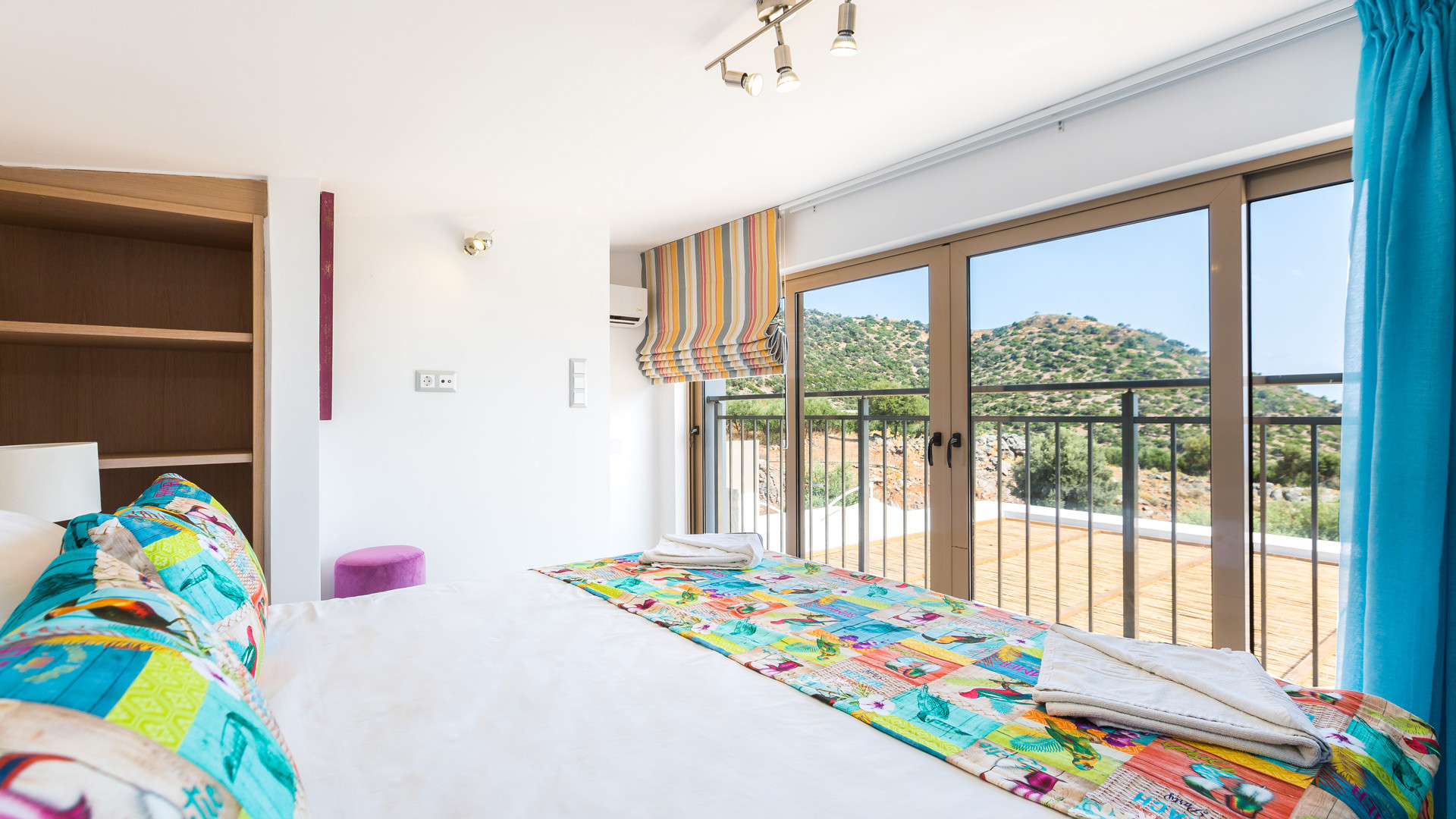 Schlafzimmer im Loft: Ein 20 m² großes Doppelzimmer mit eigenem Bad und Panoramablick auf Meer und Berge, in einer warmen Kombination aus Stein und Holz.