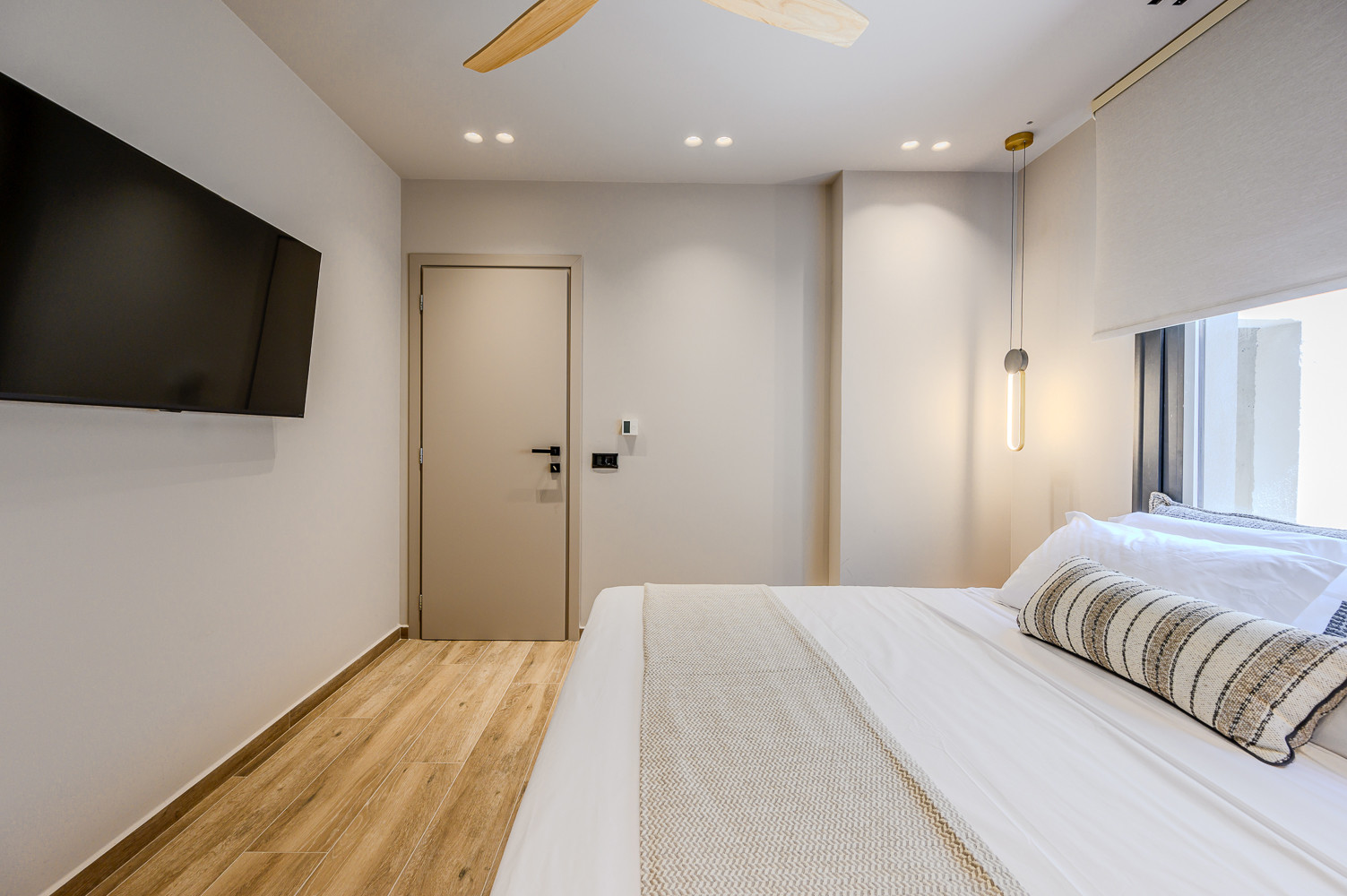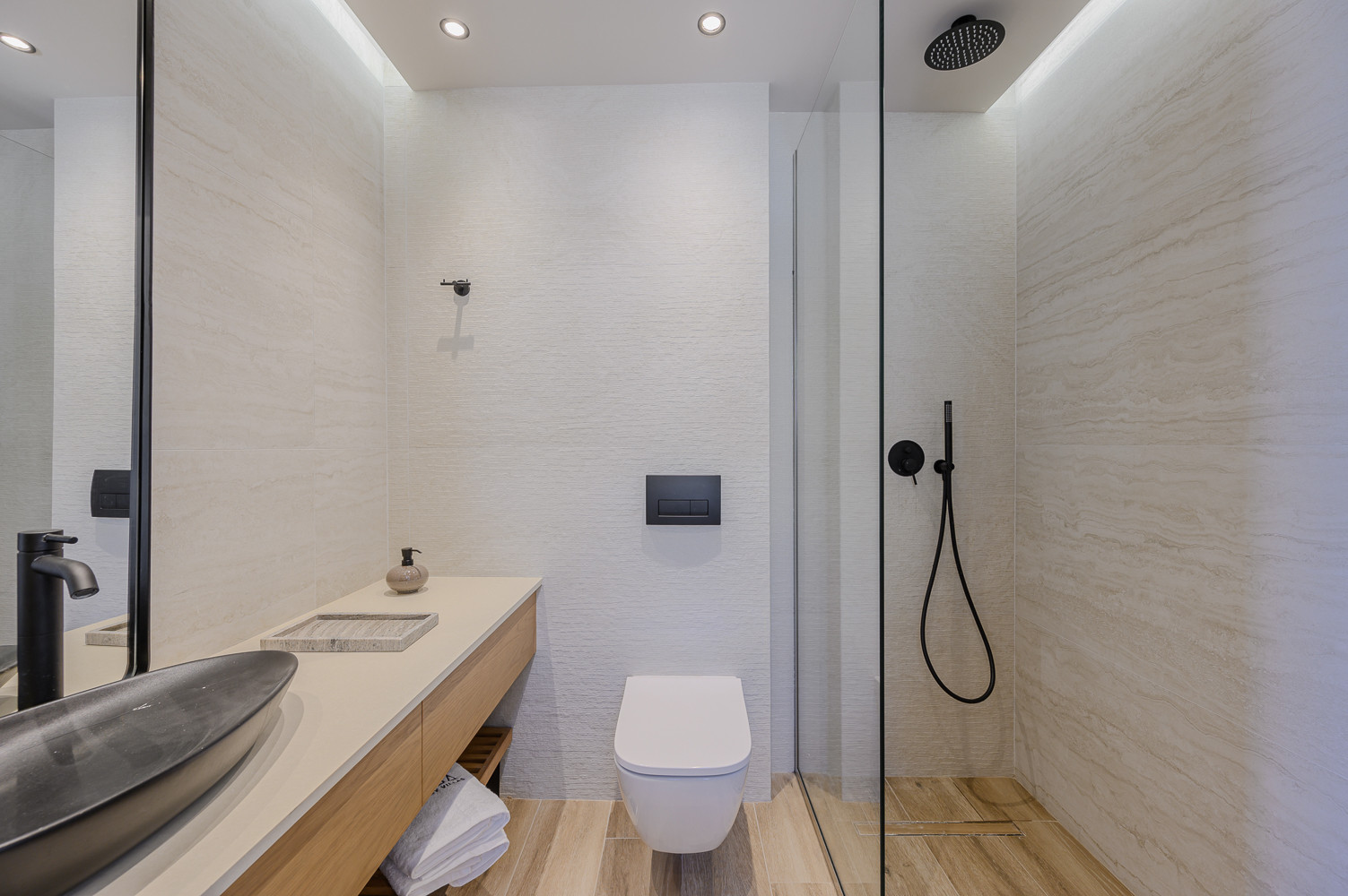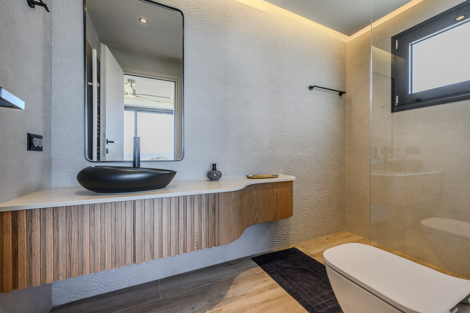 Im Erdgeschoss öffnet sich die Villa zu einem großzügigen und stilvollen Wohnbereich. Das offene Design verbindet nahtlos die moderne, voll ausgestattete Küche mit dem einladenden Wohnzimmer, wo ein 55-Zoll-TV für Ihre Unterhaltung bereitsteht. Auf dieser Etage befindet sich auch zwei Schlafzimmern, jede mit einem Kingsize-Bett , sowie ein Gemeinschaftsbad.