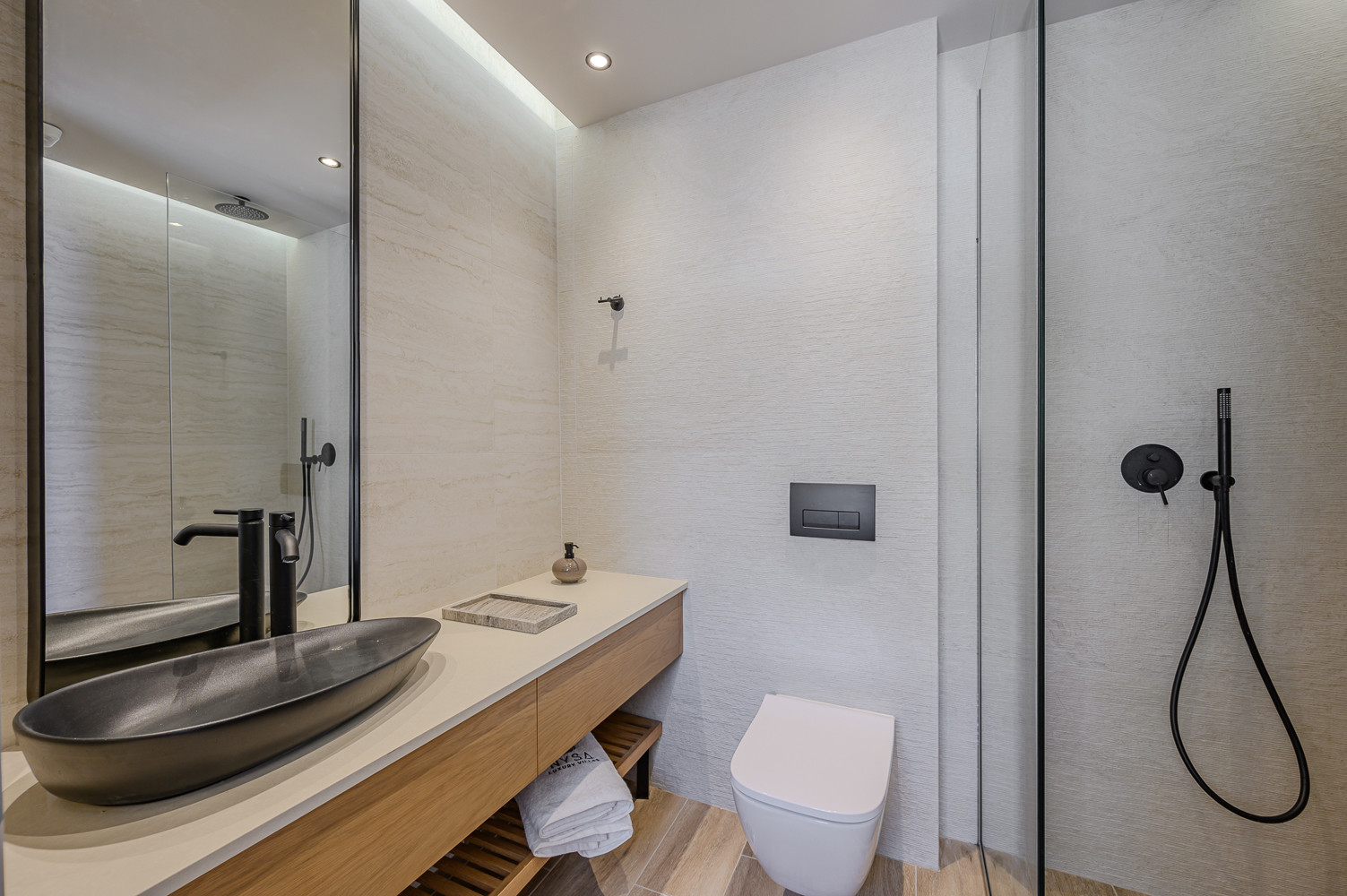 Wenn Sie in das Untergeschoss hinabsteigen, finden Sie einen gemütlichen und intimen Raum mit zwei wunderschön eingerichteten Schlafzimmern. Das erste Schlafzimmer bietet den Luxus eines eigenen Badezimmers, was zusätzliche Privatsphäre und Komfort bietet. Das zweite Schlafzimmer teilt sich ein gut ausgestattetes Badezimmer, was es zu einem bequemen und erholsamen Raum für weitere Gäste macht.