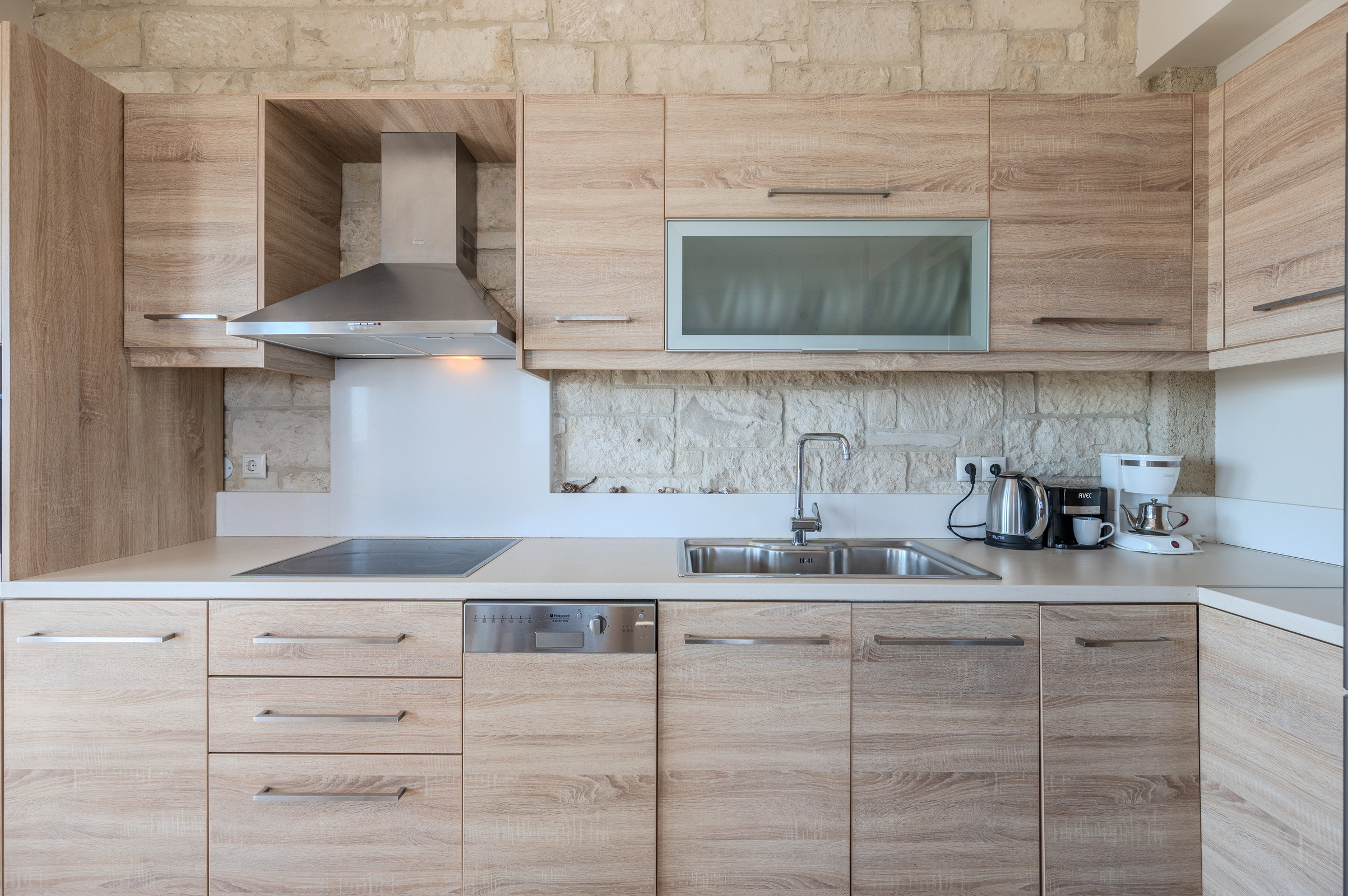 Wenn Sie die Villa von der oberen Etage betreten, werden Sie in einen hellen und einladenden offenen Wohnbereich begrüßt. Das Wohnzimmer und der Essbereich sind nahtlos miteinander verbunden und schaffen eine gemütliche Atmosphäre, die perfekt zum Entspannen oder zum Essen mit Freunden und Familie ist. Daneben befindet sich die voll ausgestattete Küche mit allen modernen Annehmlichkeiten wie Backofen, Kühlschrank, Gefrierschrank, Geschirrspüler und Kaffeemaschine, was das Zubereiten köstlicher Mahlzeiten sehr einfach macht. Die obere Etage verfügt außerdem über eine praktische Gäste-Toilette.
