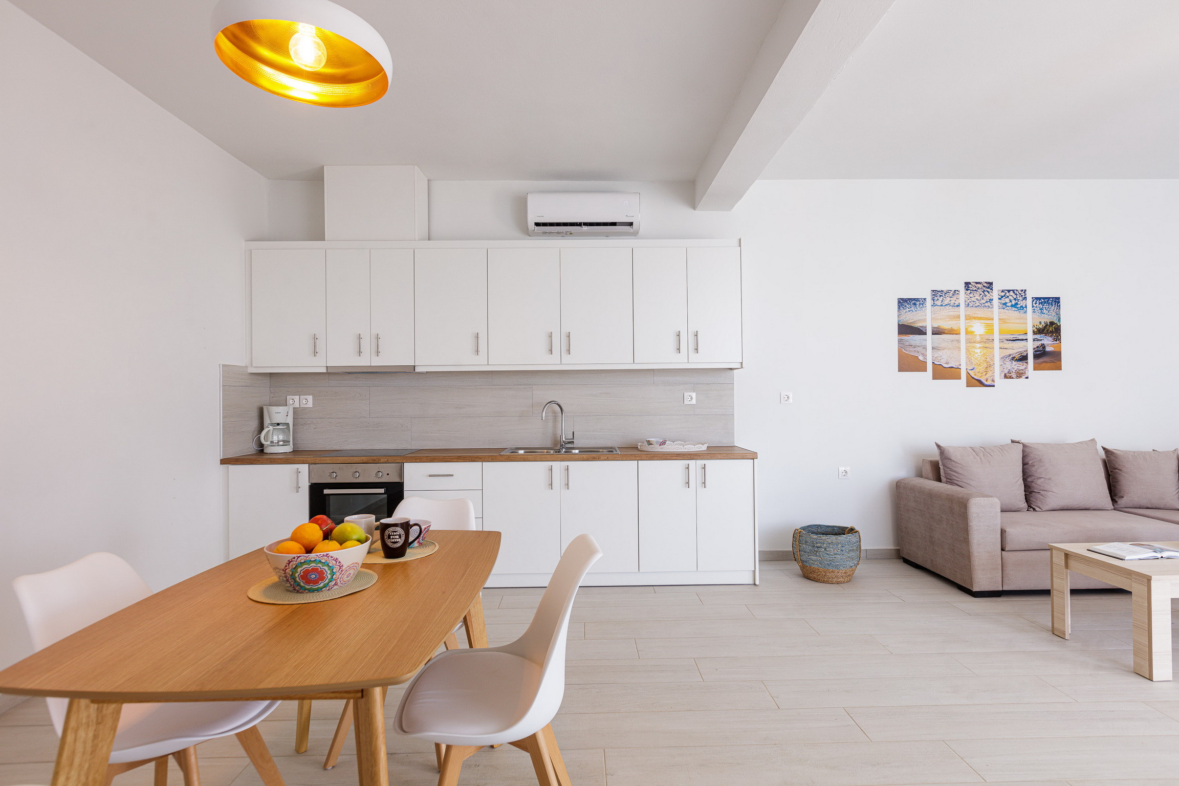 Im Erdgeschoss konzipiert, bietet die Villa eine helle, offene Raumaufteilung mit einem geräumigen Wohnbereich. Entspannen Sie sich auf dem großen Ecksofa oder genießen Sie eine Mahlzeit am Esstisch, während Sie den Blick auf den privaten Pool und das Meer dahinter schweifen lassen. Ein 55-Zoll-Fernseher mit Netflix-Abonnement sorgt nach einem Tag voller Erkundungen für gemütliche Unterhaltung.