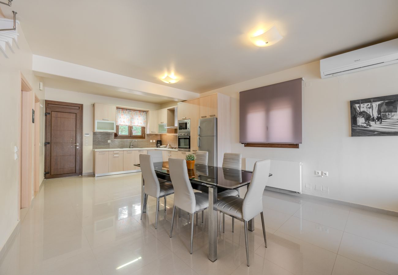 Im Erdgeschoss betreten Sie eine offene, vollständig ausgestattete Küche und einen luftigen, sonnendurchfluteten Wohnbereich. Das gemütliche Wohnzimmer verfügt über eine bequeme Sitzecke mit Fernseher, einen Esstisch für sechs Personen und eine voll ausgestattete moderne Küche, die zum Zubereiten und Genießen traditioneller kretischer Gerichte einlädt. Die Küche ist mit allen Essentials ausgestattet, einschließlich Elektroherd, Kühlschrank, Kaffeemaschine, Toaster, Wasserkocher und mehr. Schiebetüren verbinden den Wohnbereich mit der großen Veranda mit Außenesstisch und dem Poolbereich und schaffen so einen nahtlosen Übergang zwischen Innen- und Außenbereich. Auf dieser Ebene befindet sich zudem eine Gästetoilette.