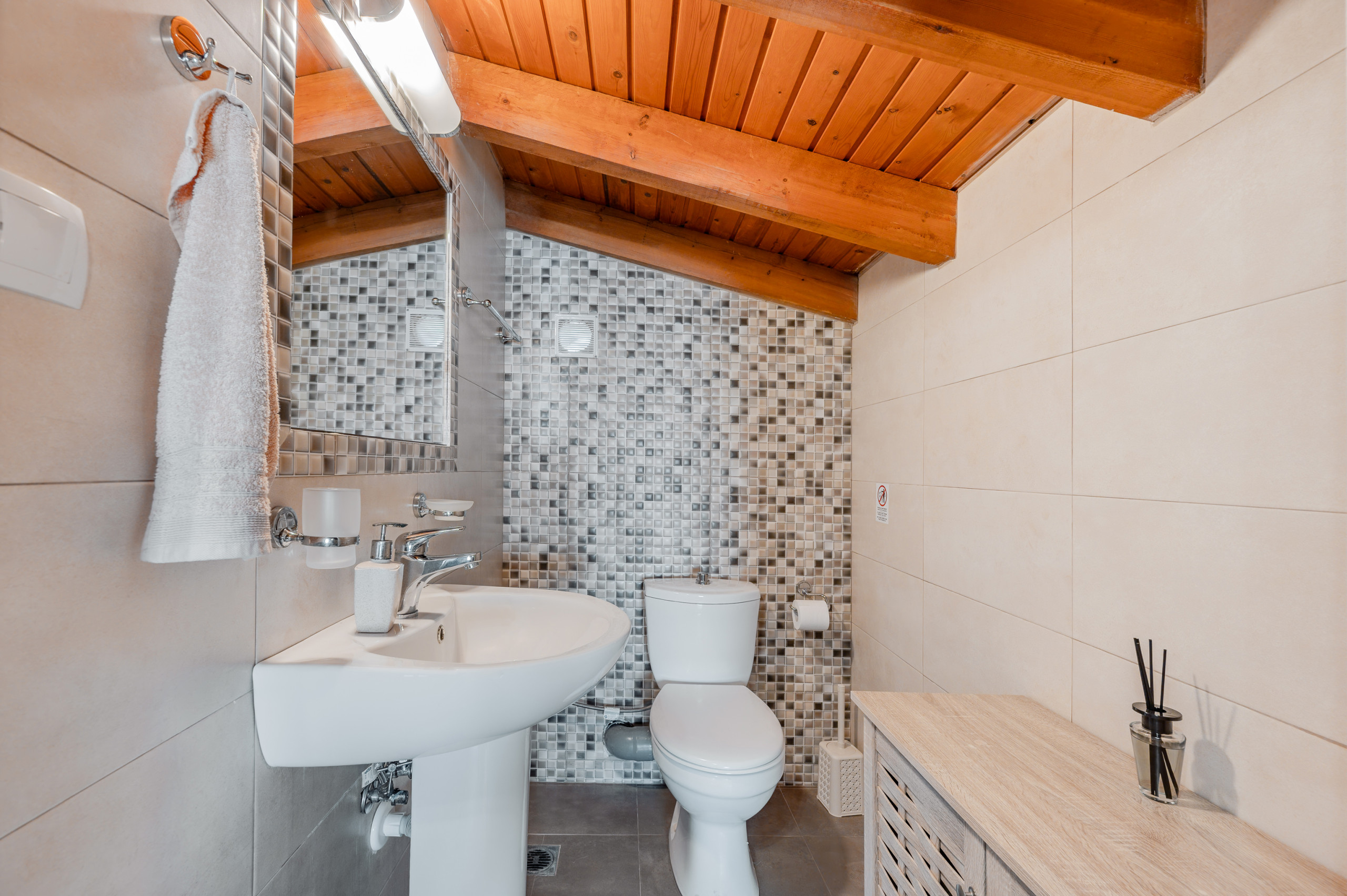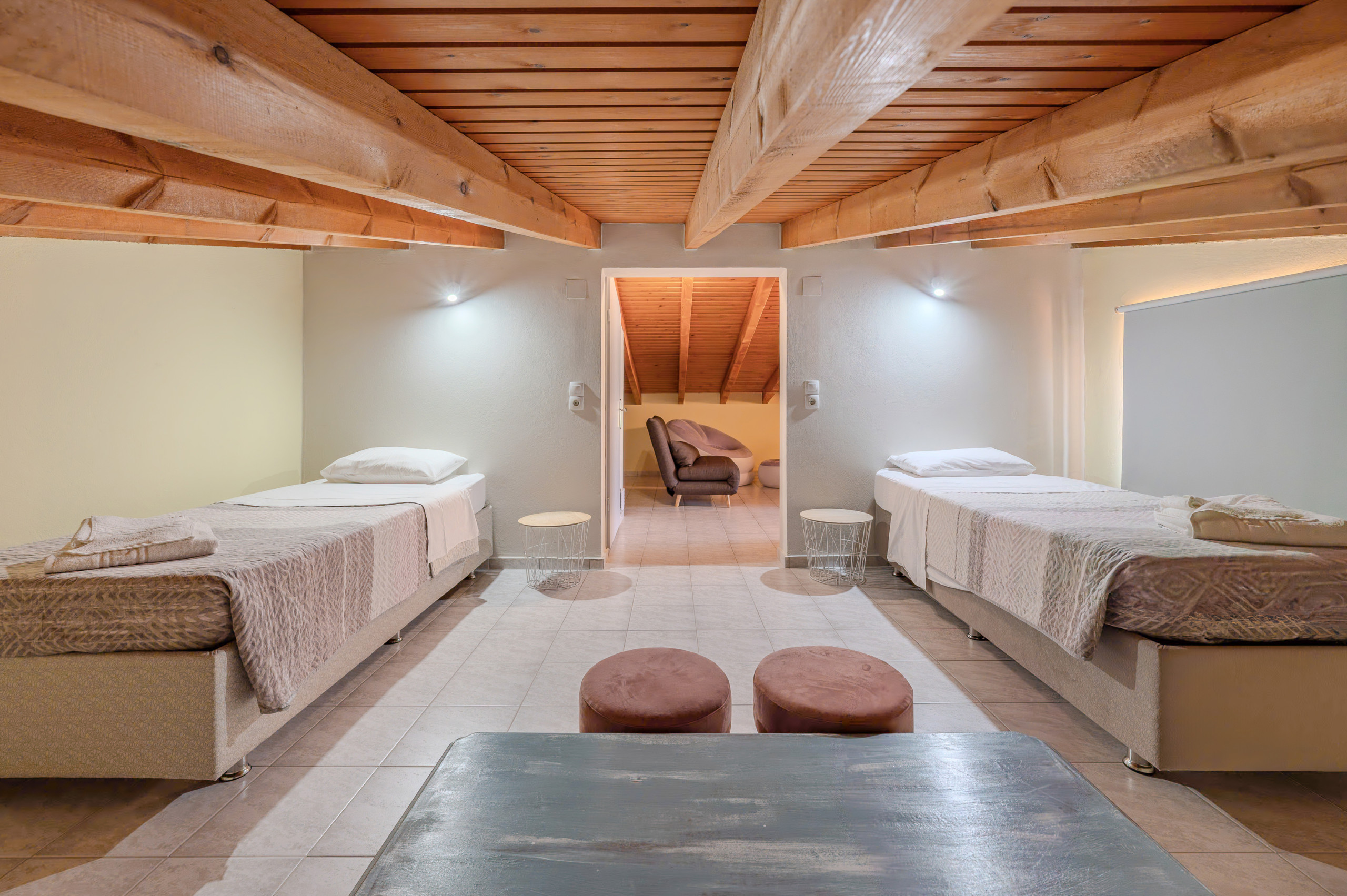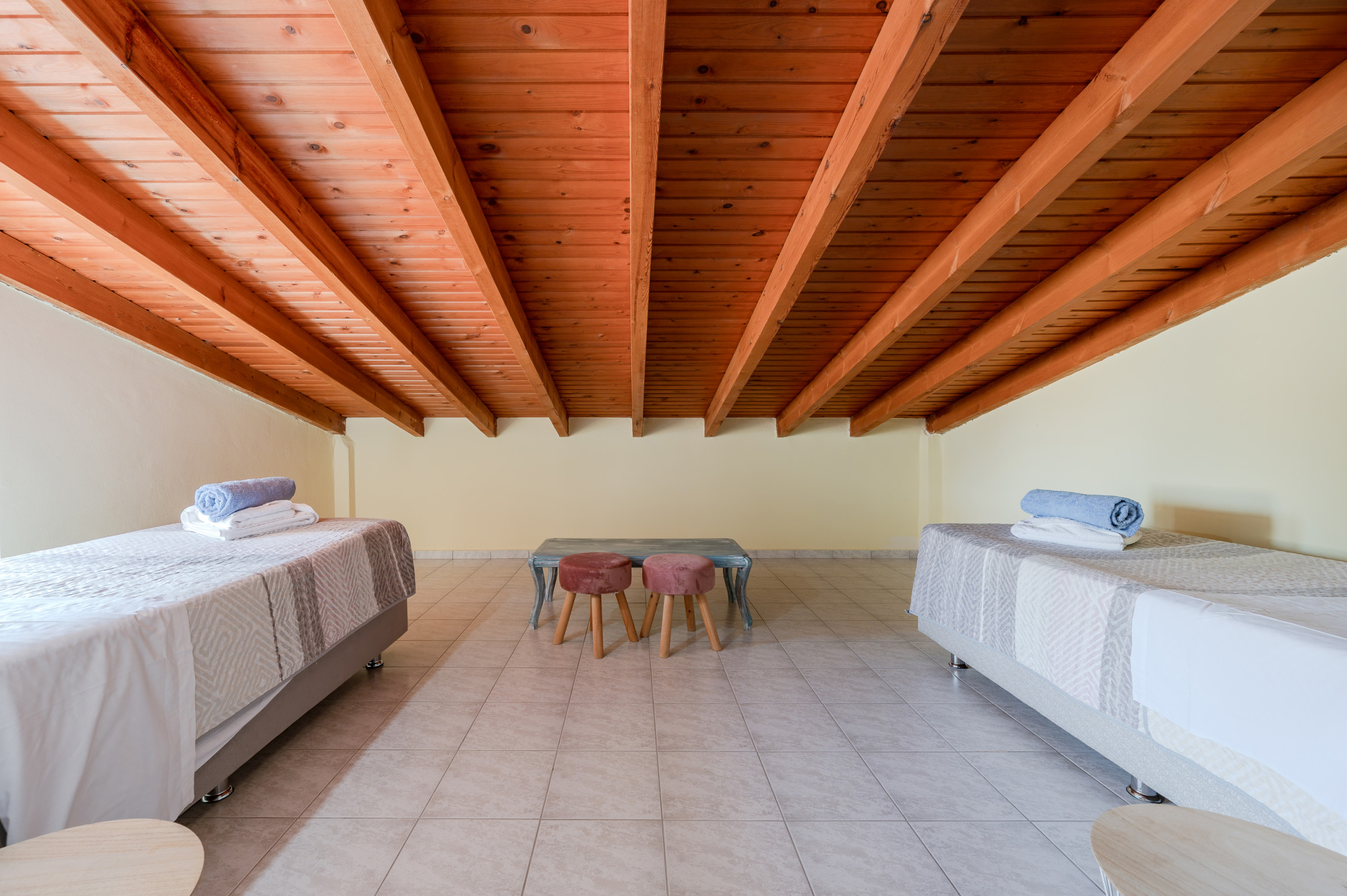 Ein gemütlicher Dachraum mit Zwillingsbetten und einer Toilette bietet einen zusätzlichen Rückzugsort, ideal für Familien mit Kindern oder Freundesgruppen.