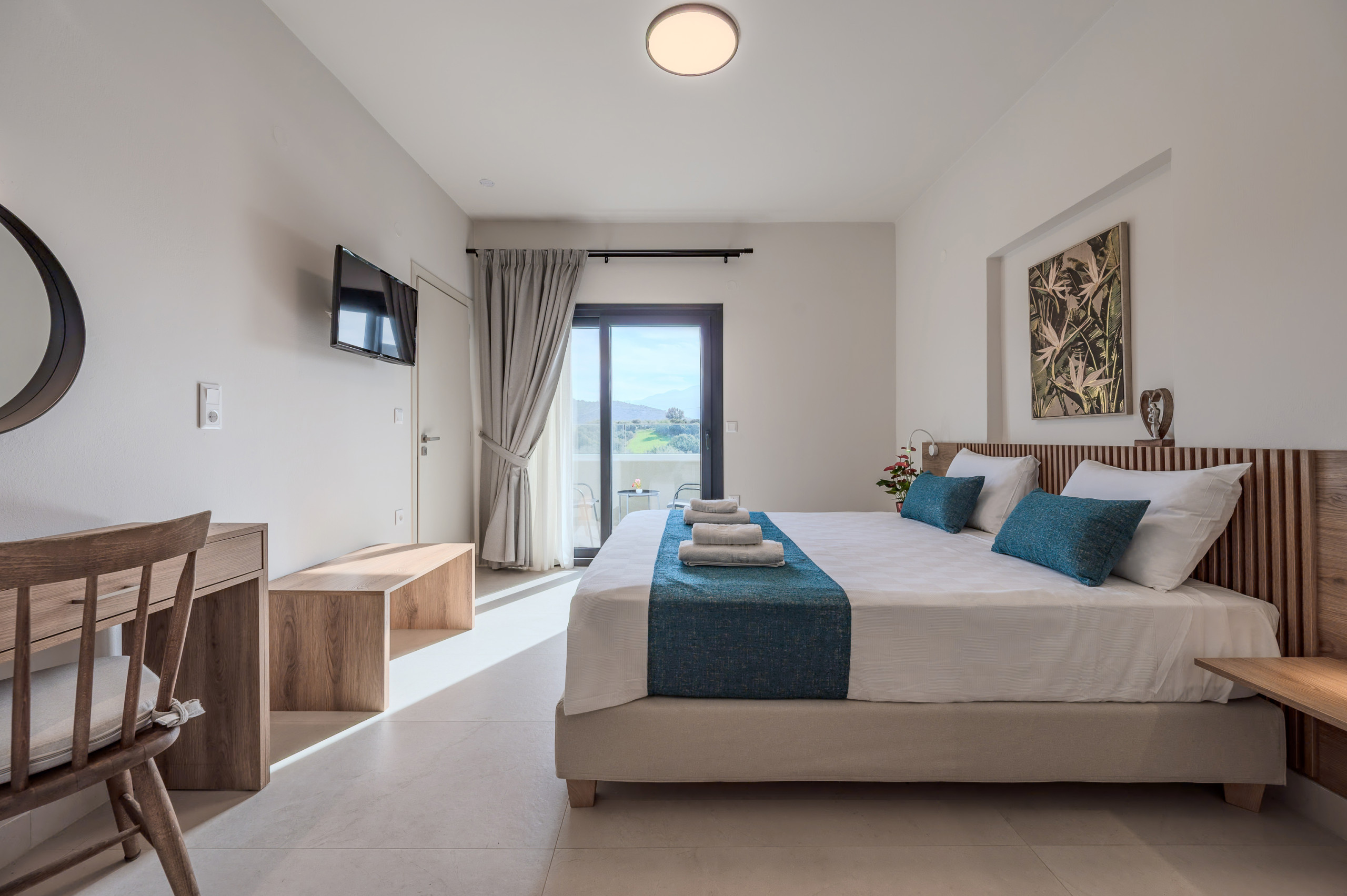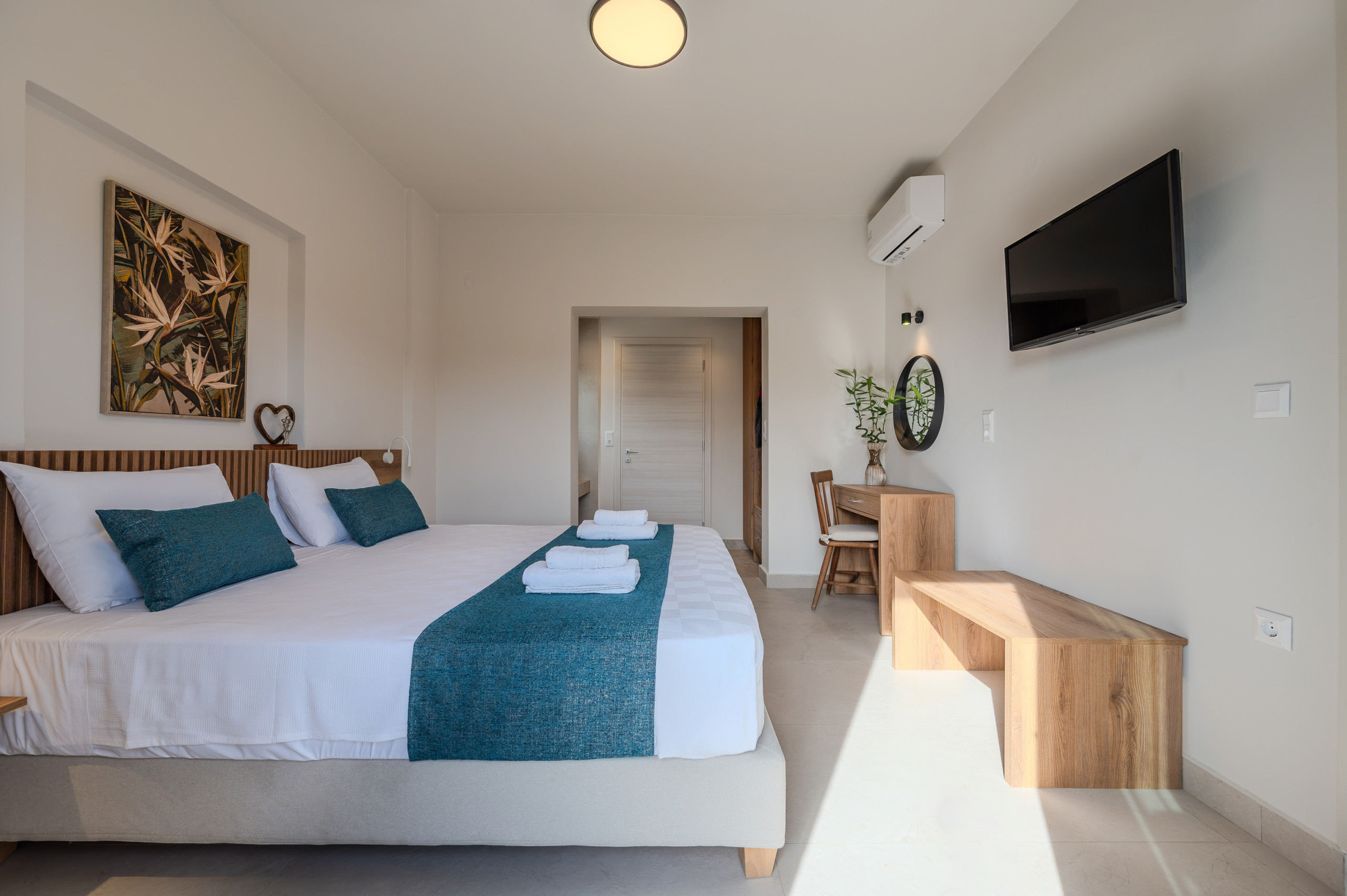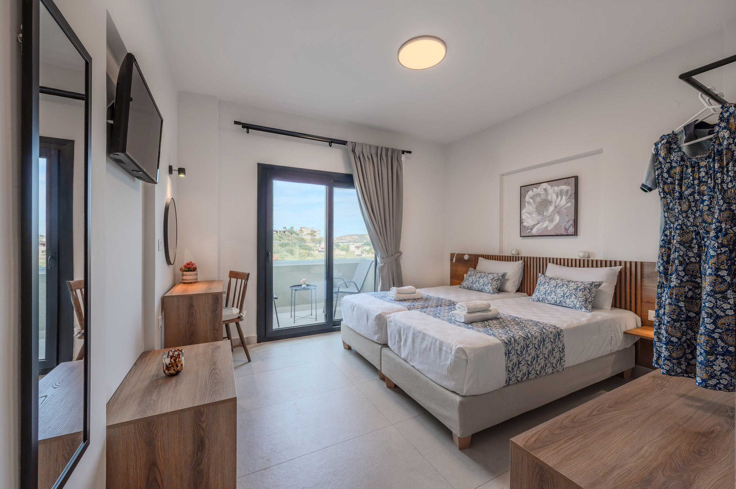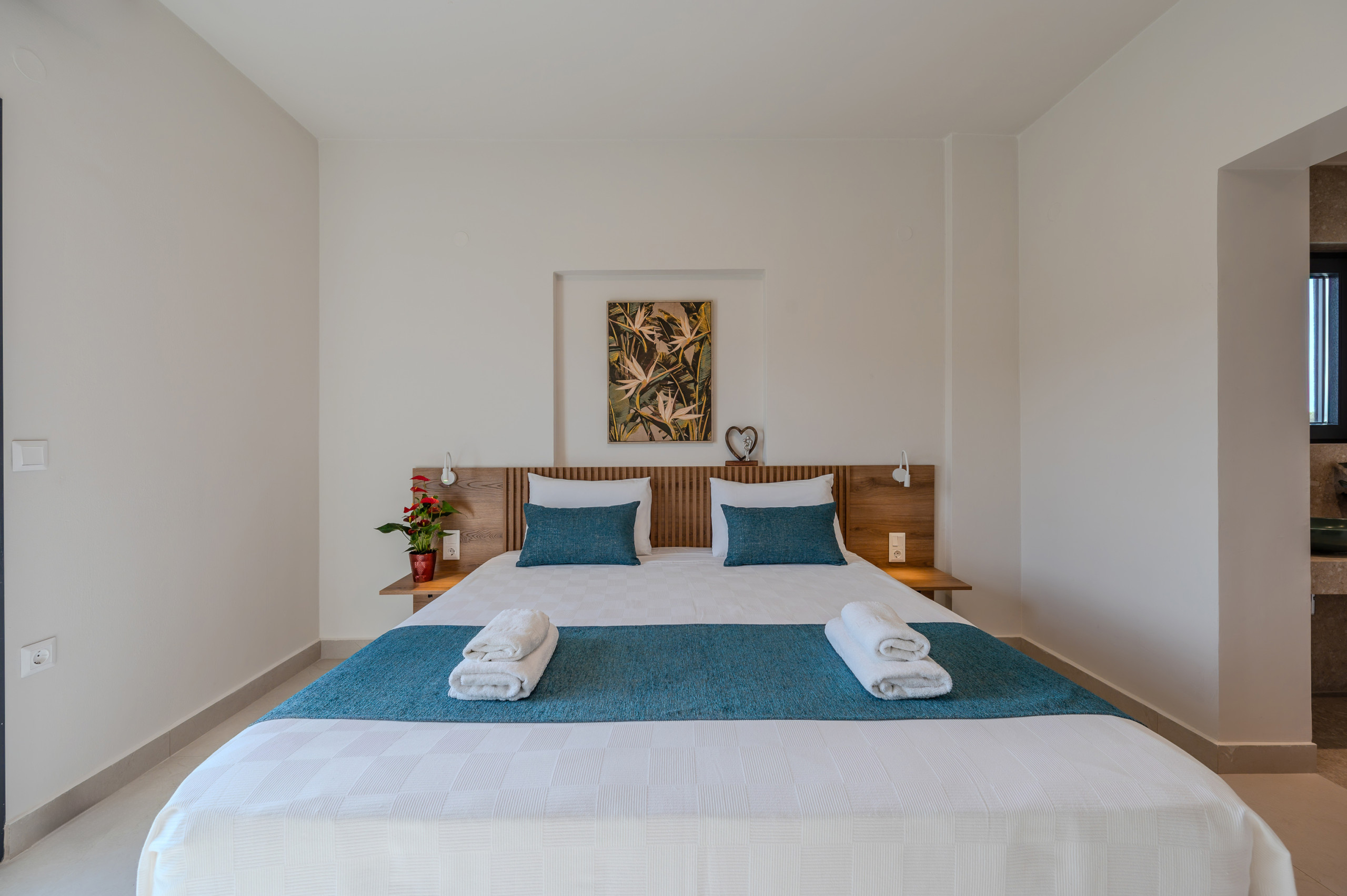 Eine interne Treppe führt in das Obergeschoss, wo sich zwei weitere Schlafzimmer befinden: eines mit einem Queensize-Bett und eines mit Zwillingsbetten. Beide Schlafzimmer verfügen über eigene Badezimmer und private Balkone, die mit Außenmöbeln ausgestattet sind, perfekt für entspannte Momente mit Blick auf die umliegende Landschaft.