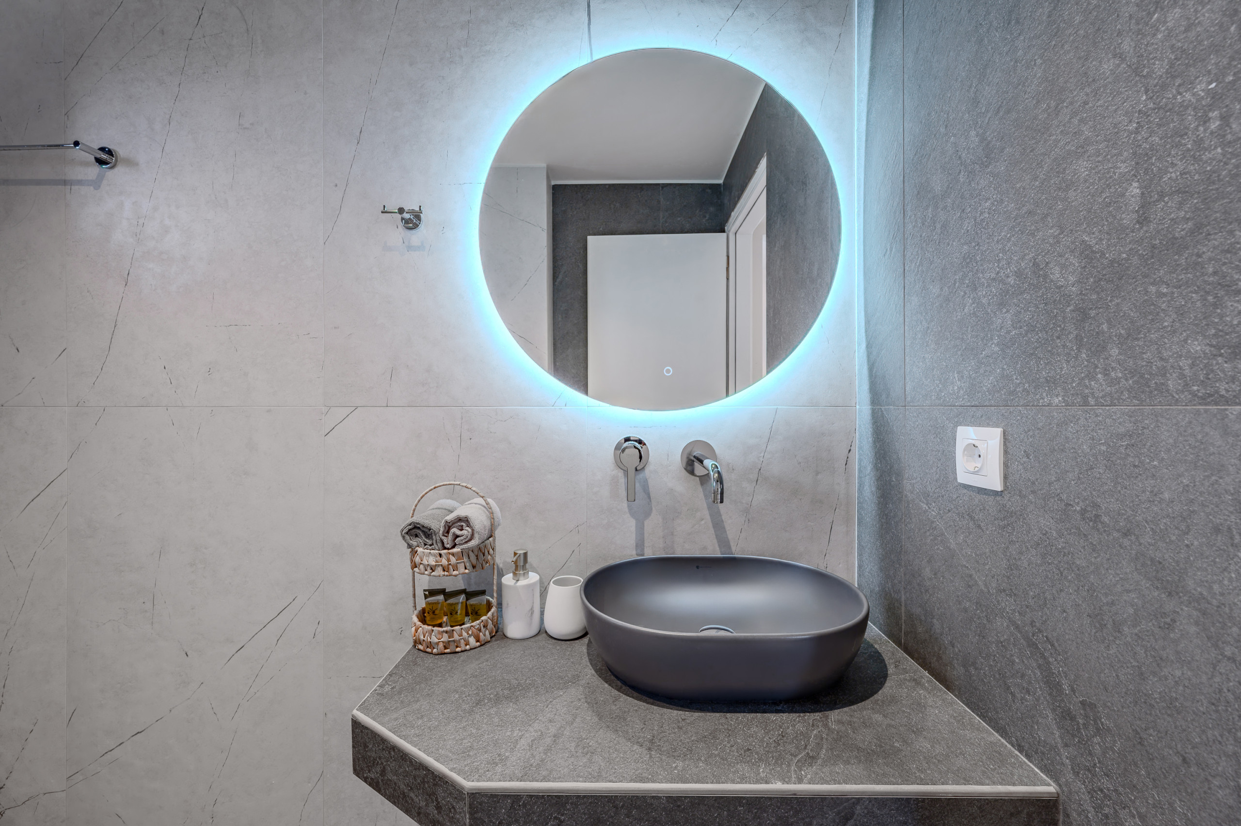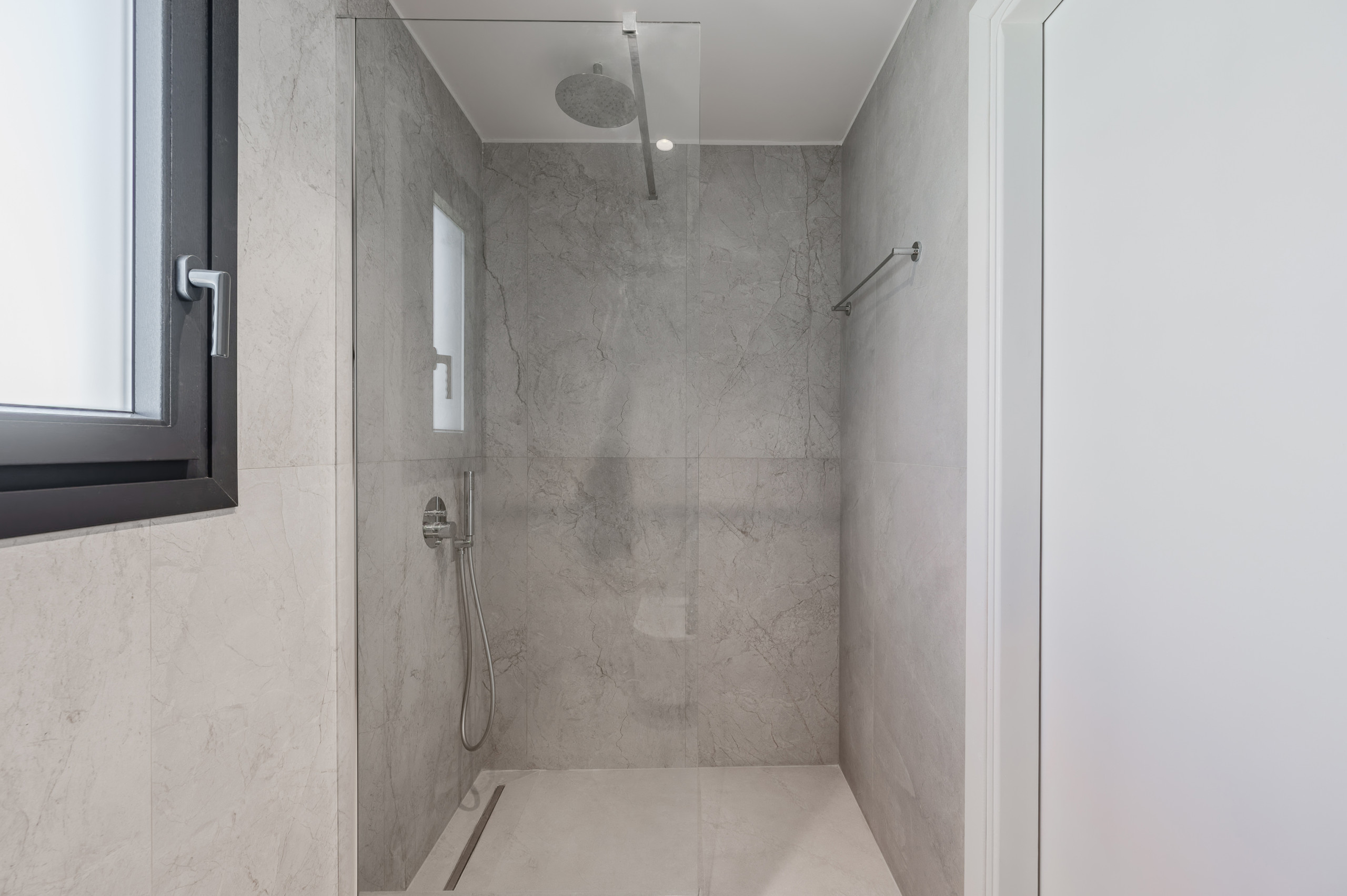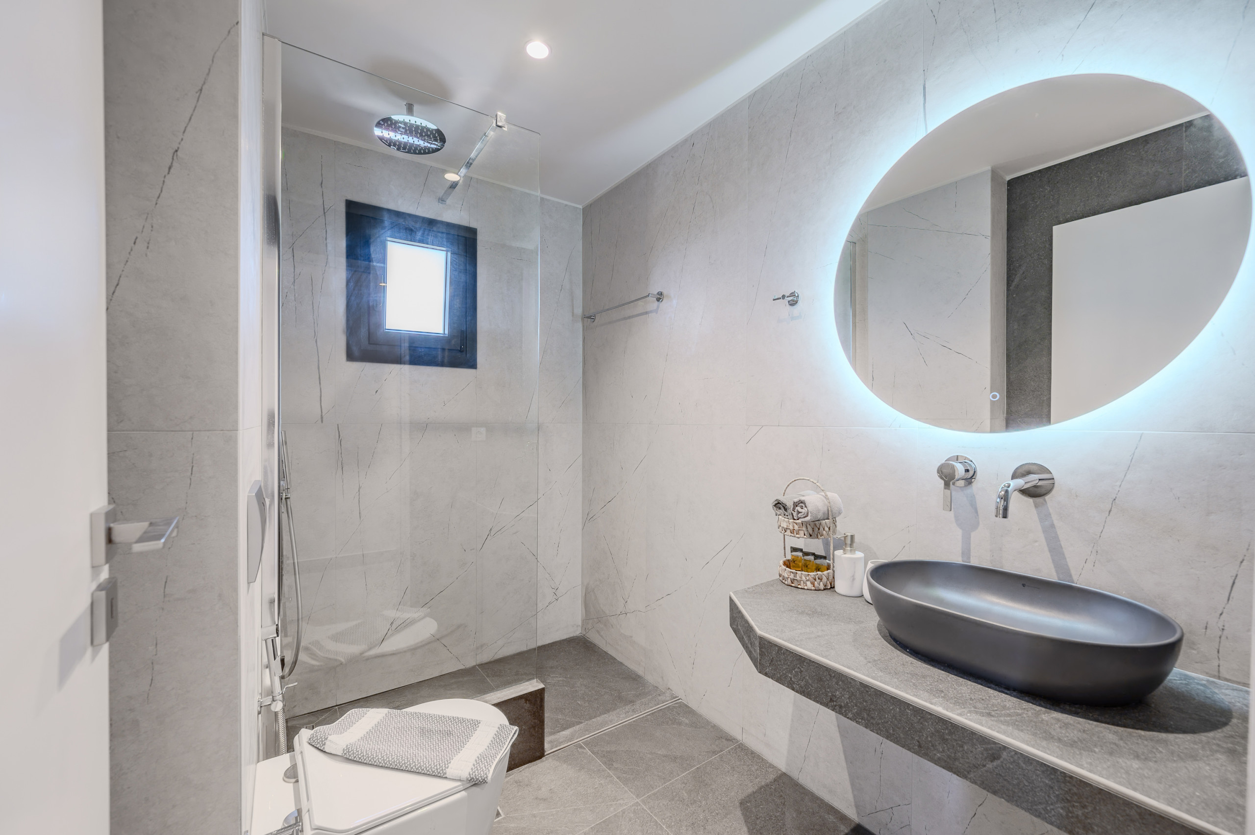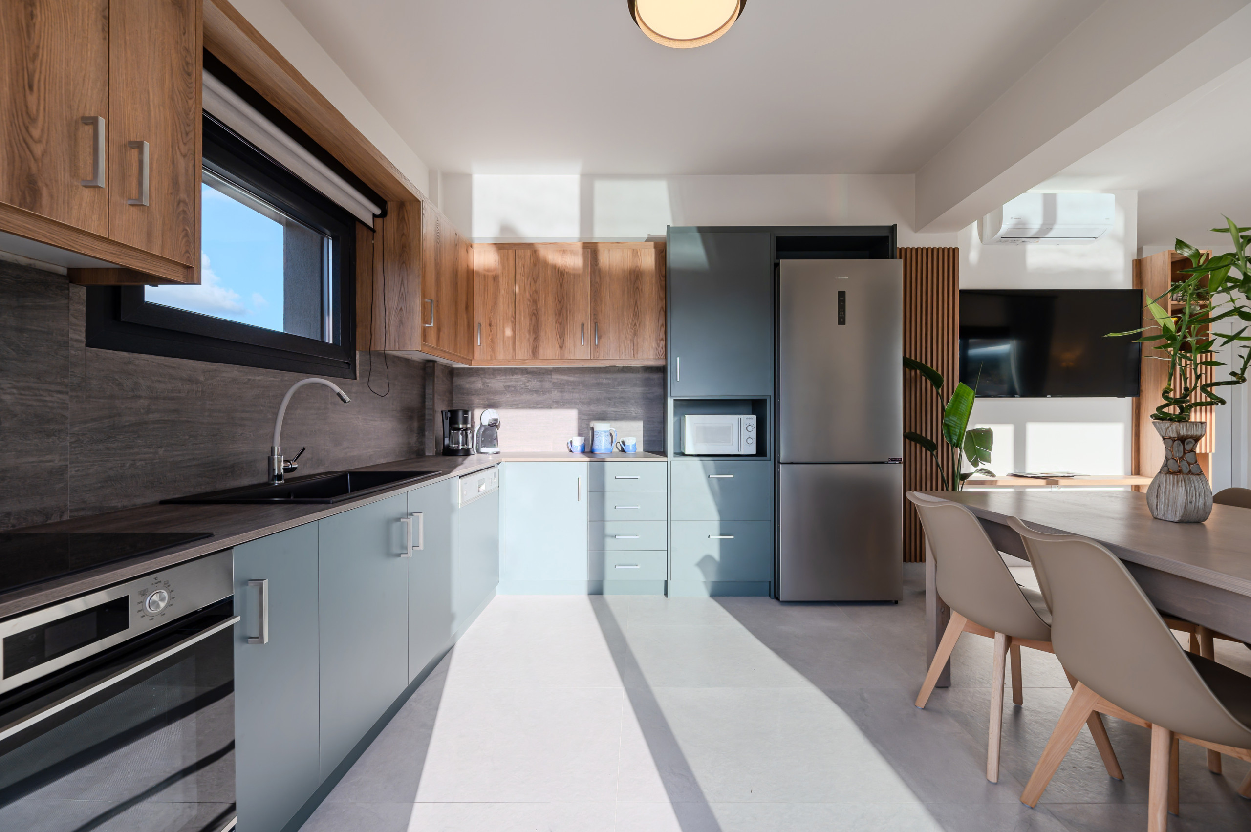 Die Villa bietet bequem Platz für bis zu 7 Gäste und ist überlegt auf zwei Ebenen angeordnet. Im Erdgeschoss finden die Gäste ein helles und stilvolles Schlafzimmer mit zwei Einzelbetten und eigener Nasszelle, ideal für einfachen Zugang. Auf derselben Ebene befindet sich eine vollständig ausgestattete offene Küche, modern und funktional, nahtlos verbunden mit einem komfortablen Wohnbereich mit großem Fernseher. Das Sofa kann einen zusätzlichen Gast aufnehmen, wodurch der Raum flexibel für Familien oder Gruppen ist.