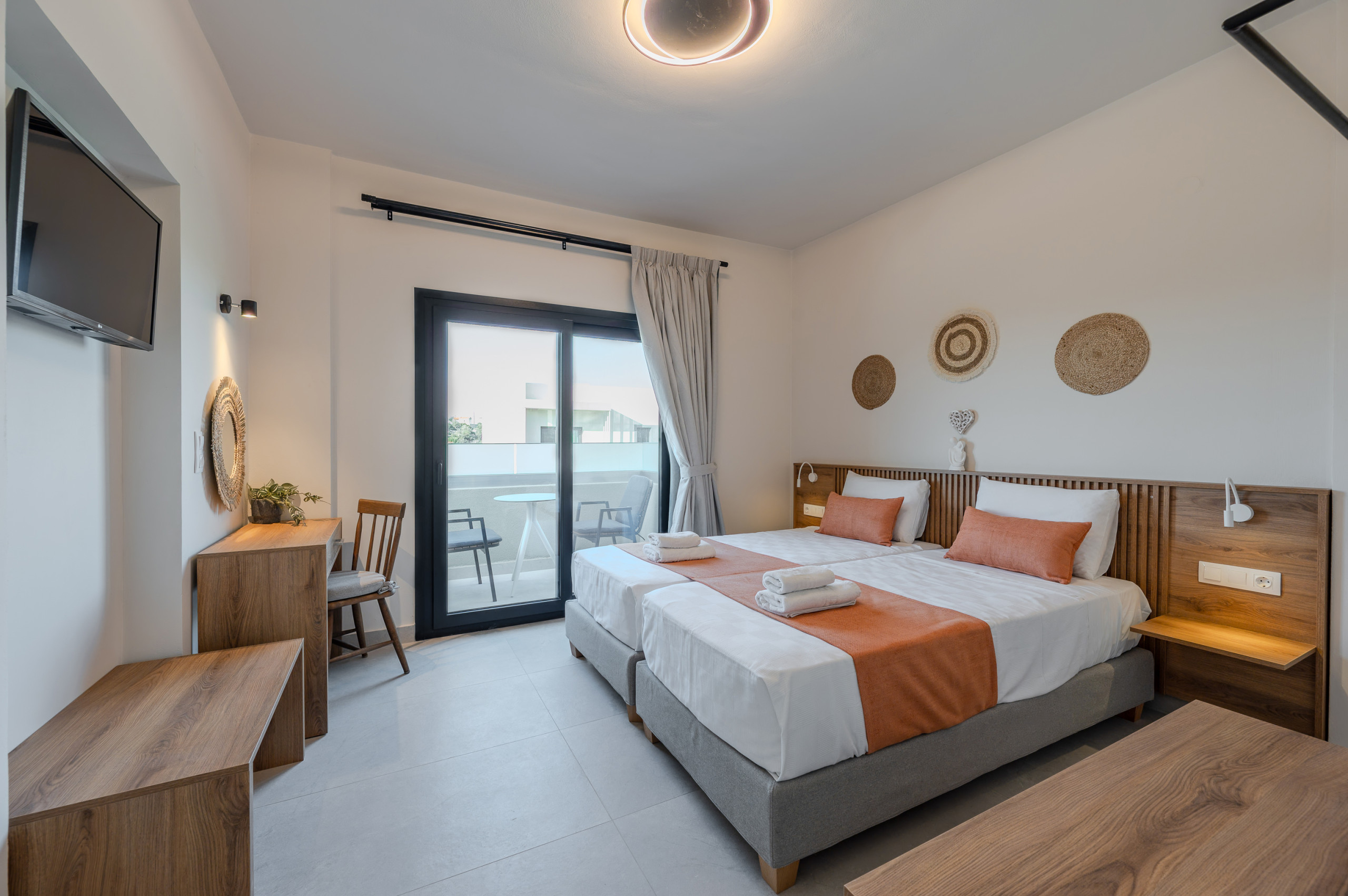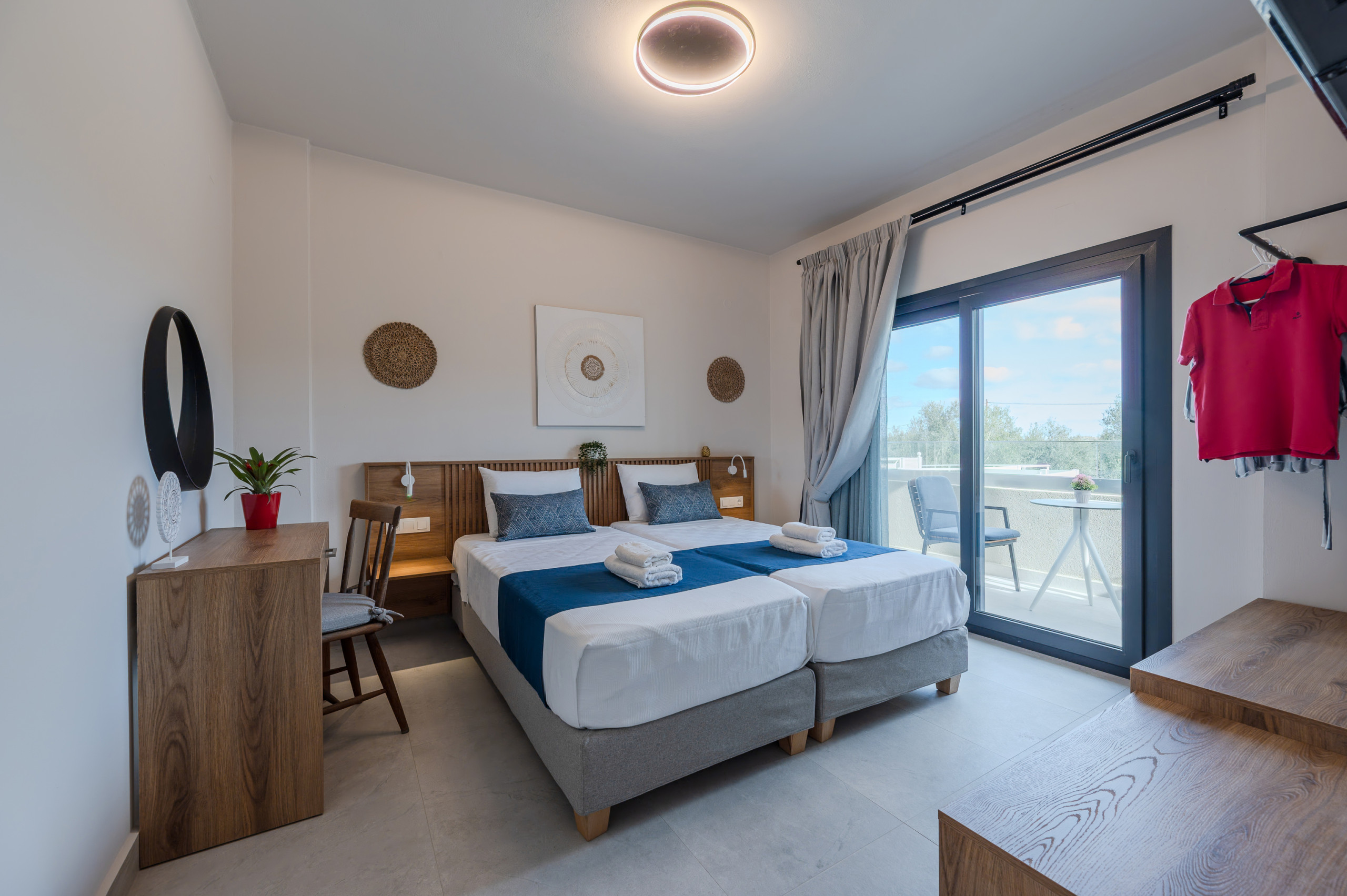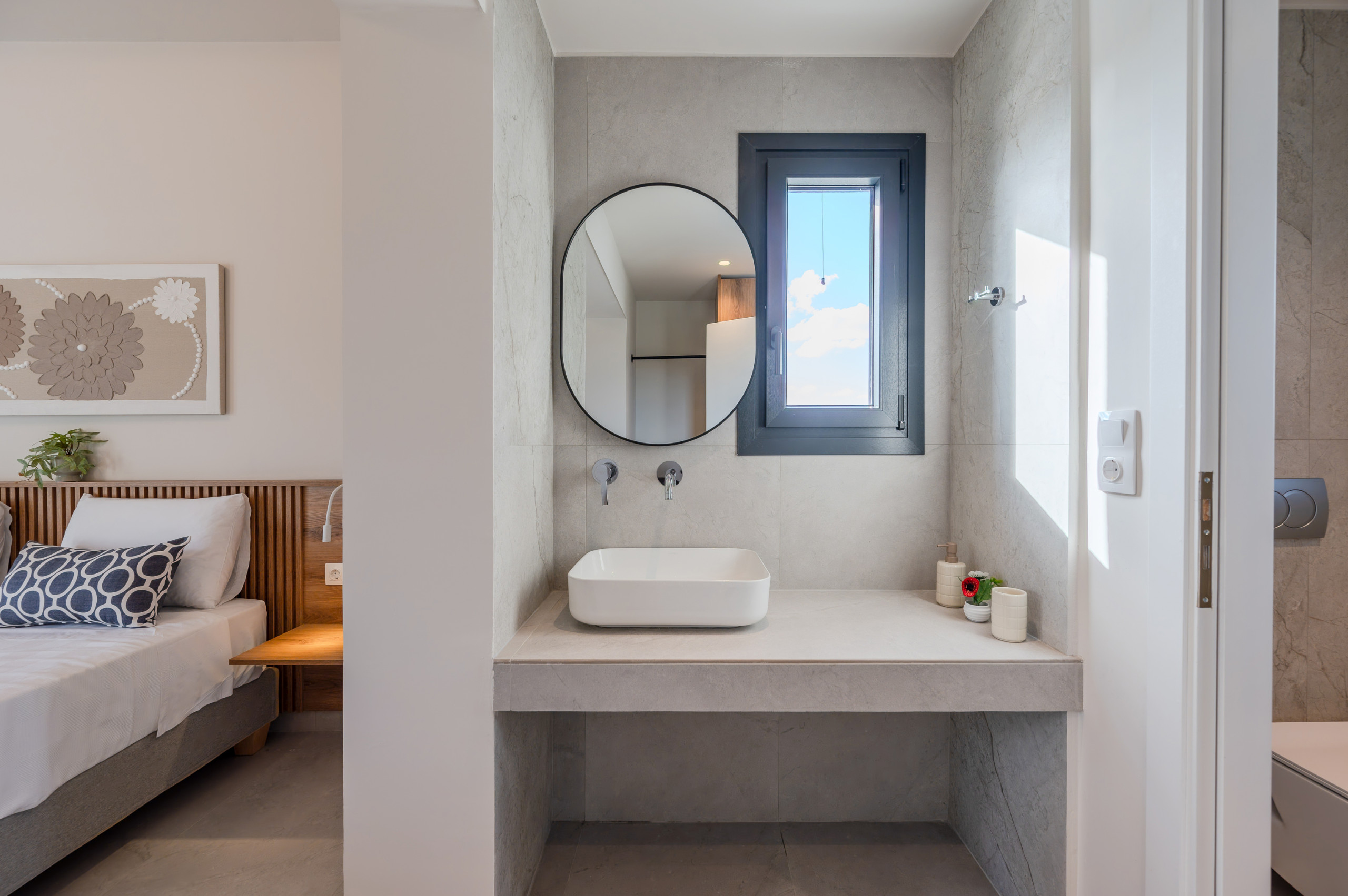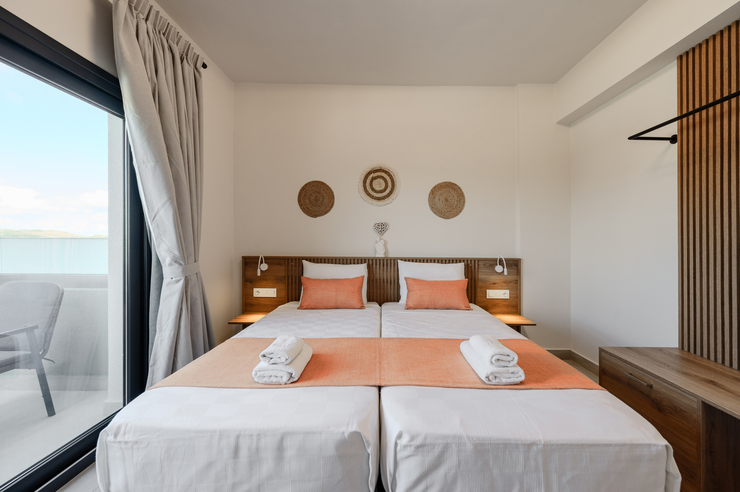 Eine interne Treppe führt in das Obergeschoss, wo sich zwei zusätzliche Schlafzimmer befinden, die jeweils über ein eigenes Badezimmer verfügen. Ein Schlafzimmer verfügt über ein Queensize-Bett, während das andere zwei Einzelbetten anbietet. Beide Schlafzimmer führen auf private Balkone, die mit Außensitzgelegenheiten ausgestattet sind und perfekt für entspannte Momente mit Blick auf die Landschaft sind.