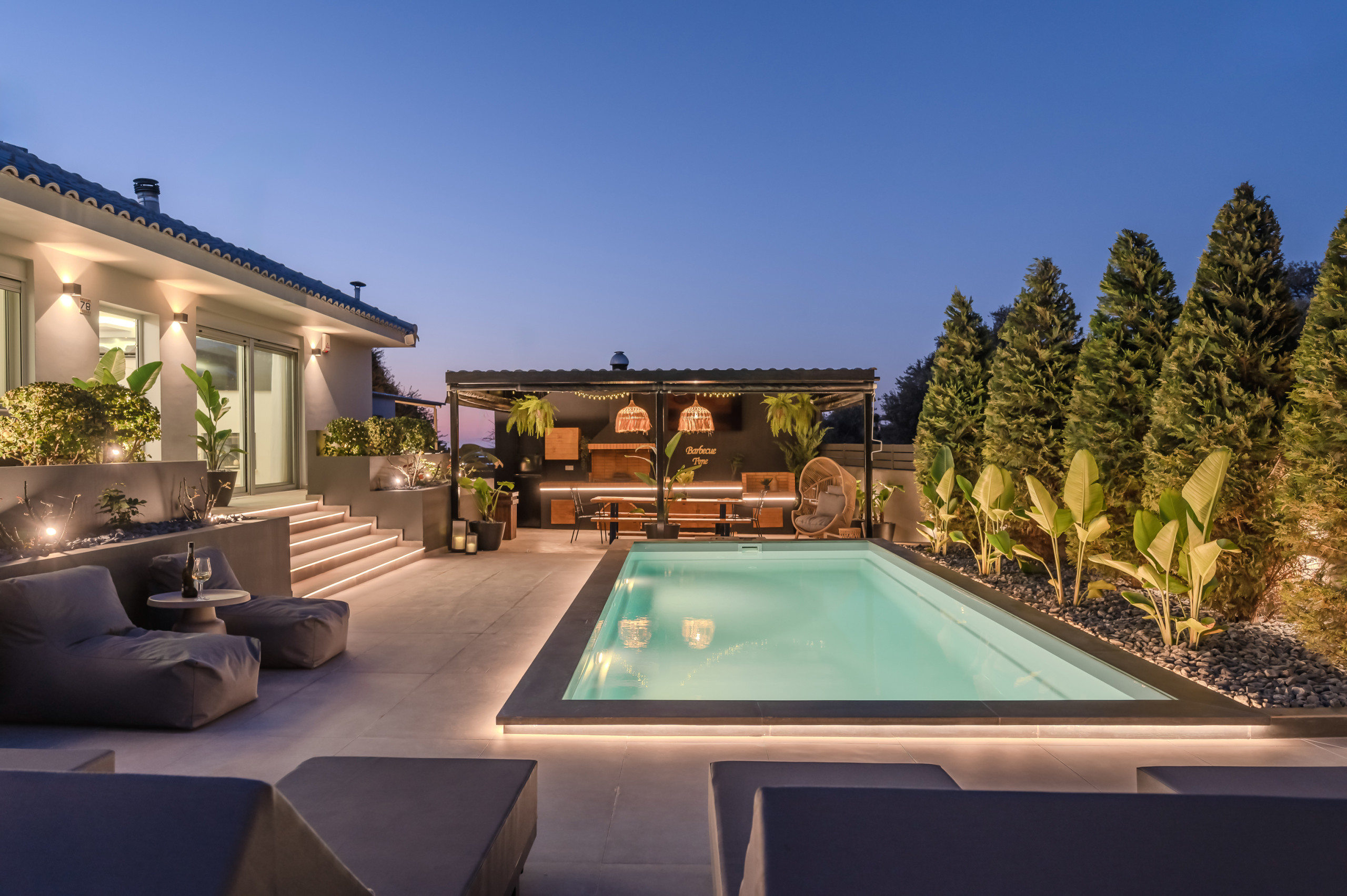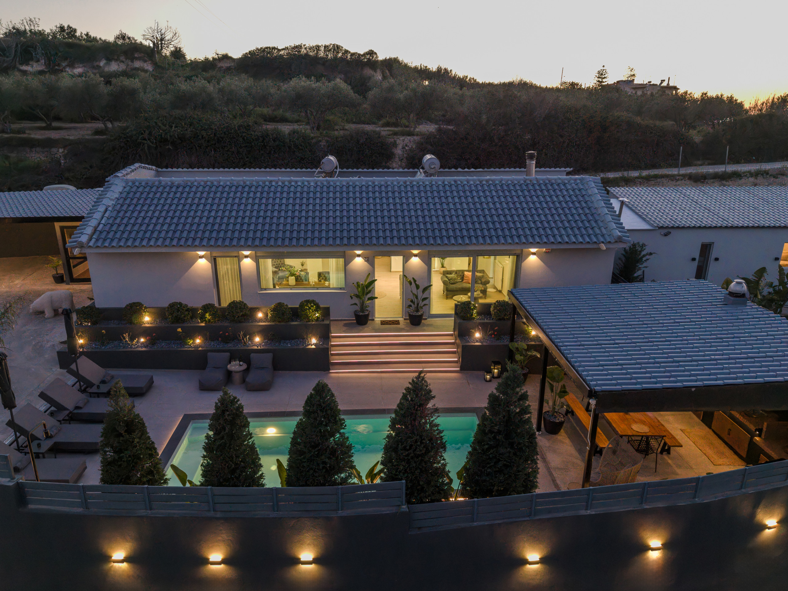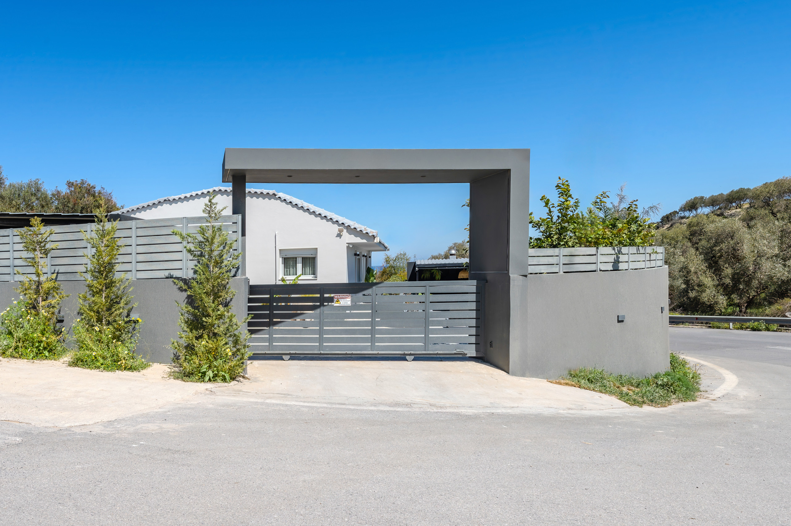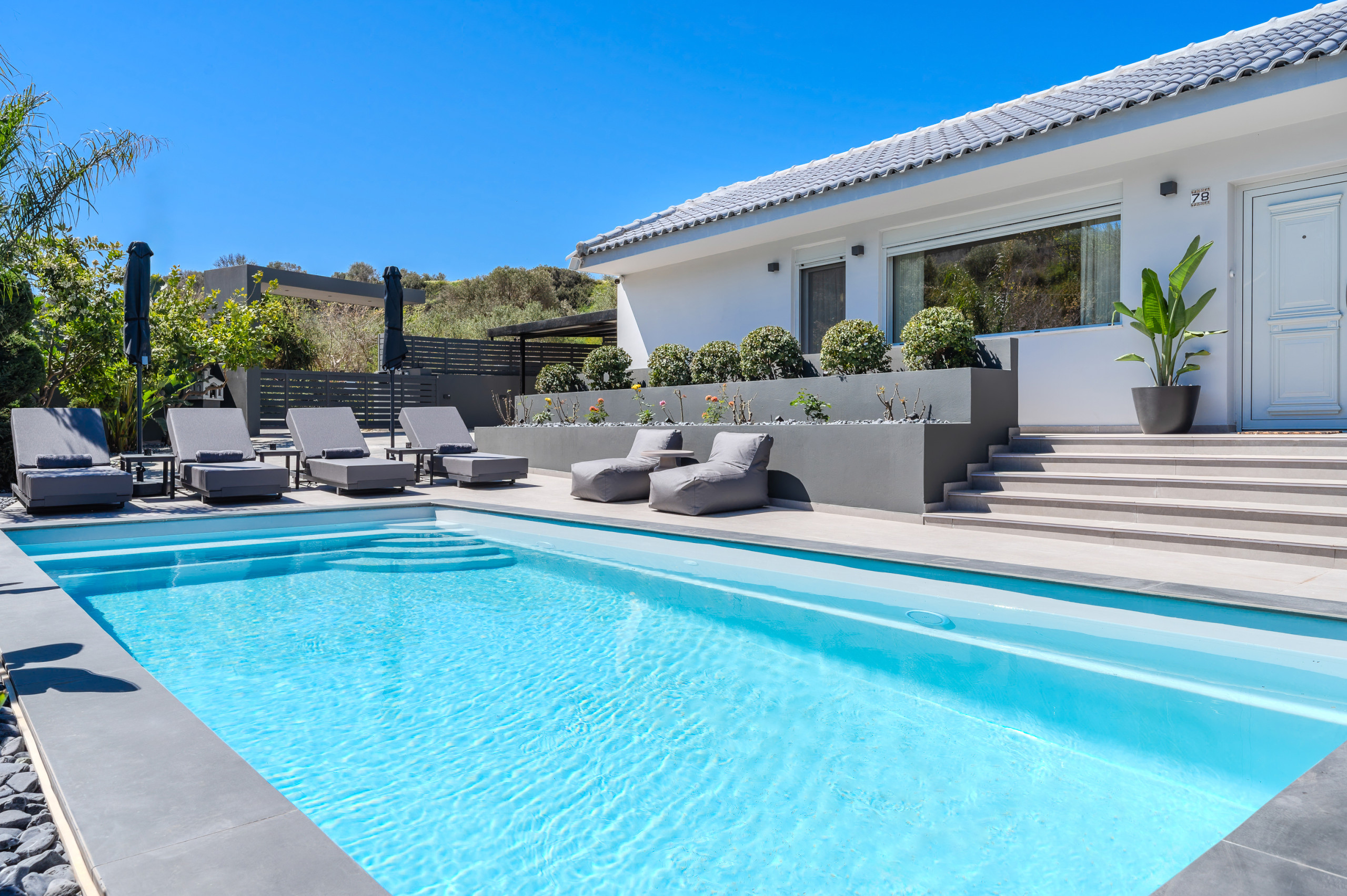 Im Freien bietet die Villa einen wunderschön gestalteten privaten Bereich mit einem Swimmingpool im Mittelpunkt, perfekt zum Entspannen unter der kretischen Sonne. Komfortable Sonnenliegen, schattige Sitzbereiche und eine vollständig ausgestattete Außenküche mit Gasgrill laden Gäste ein, lange, entspannte Mahlzeiten und Abende zusammen zu genießen. Der Essbereich im Freien bietet Platz für bis zu zehn Gäste und ist ideal für gemeinsame Momente mit Familie und Freunden.
