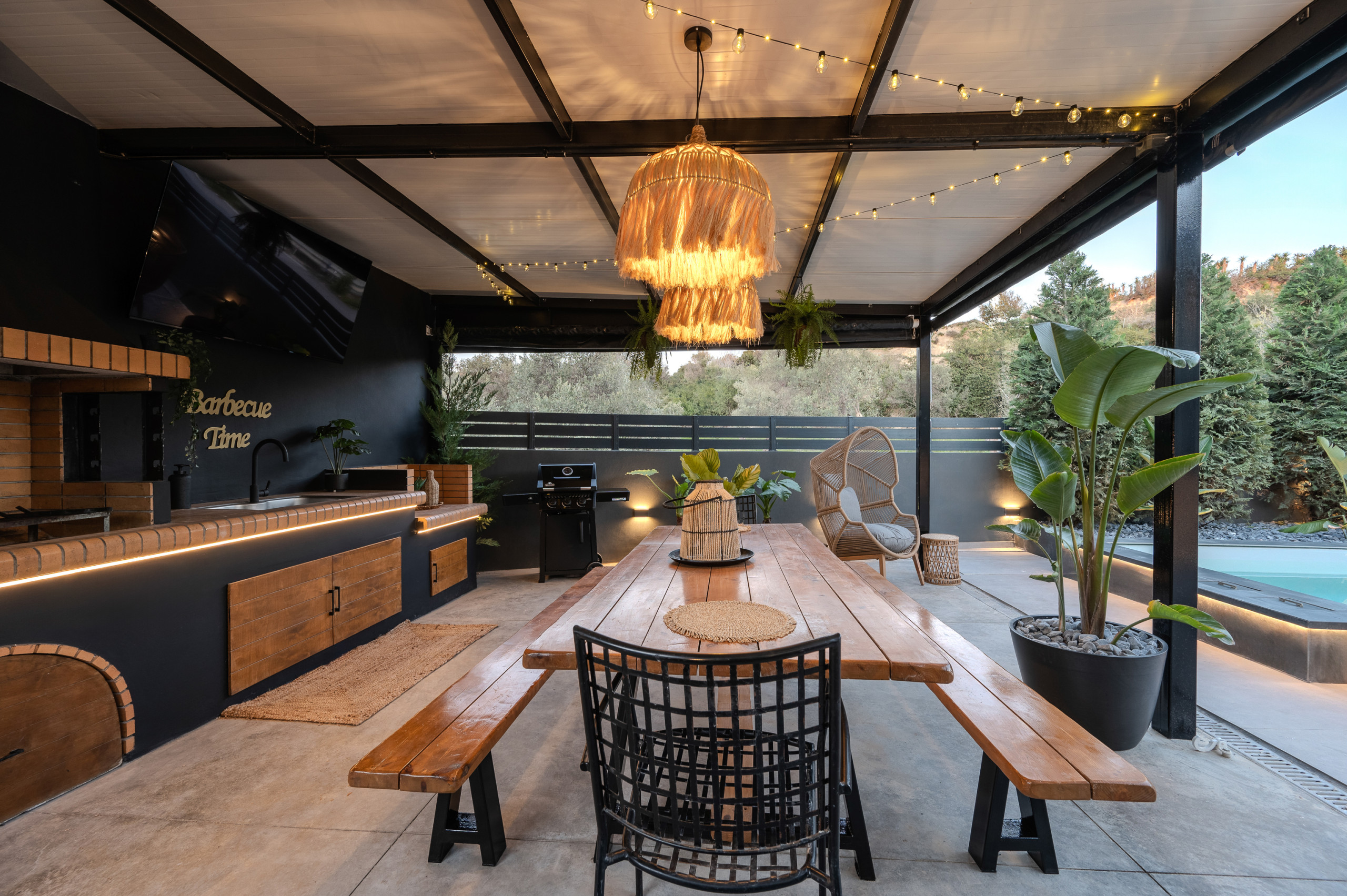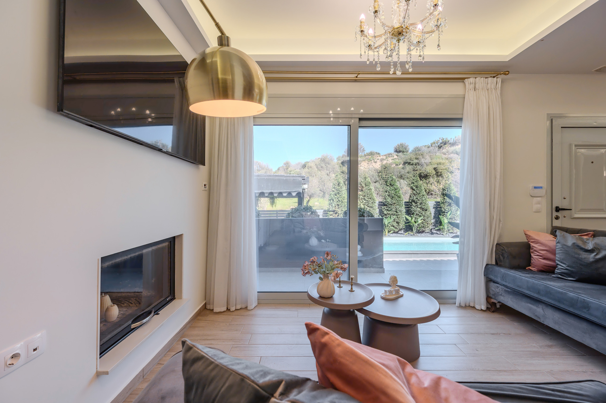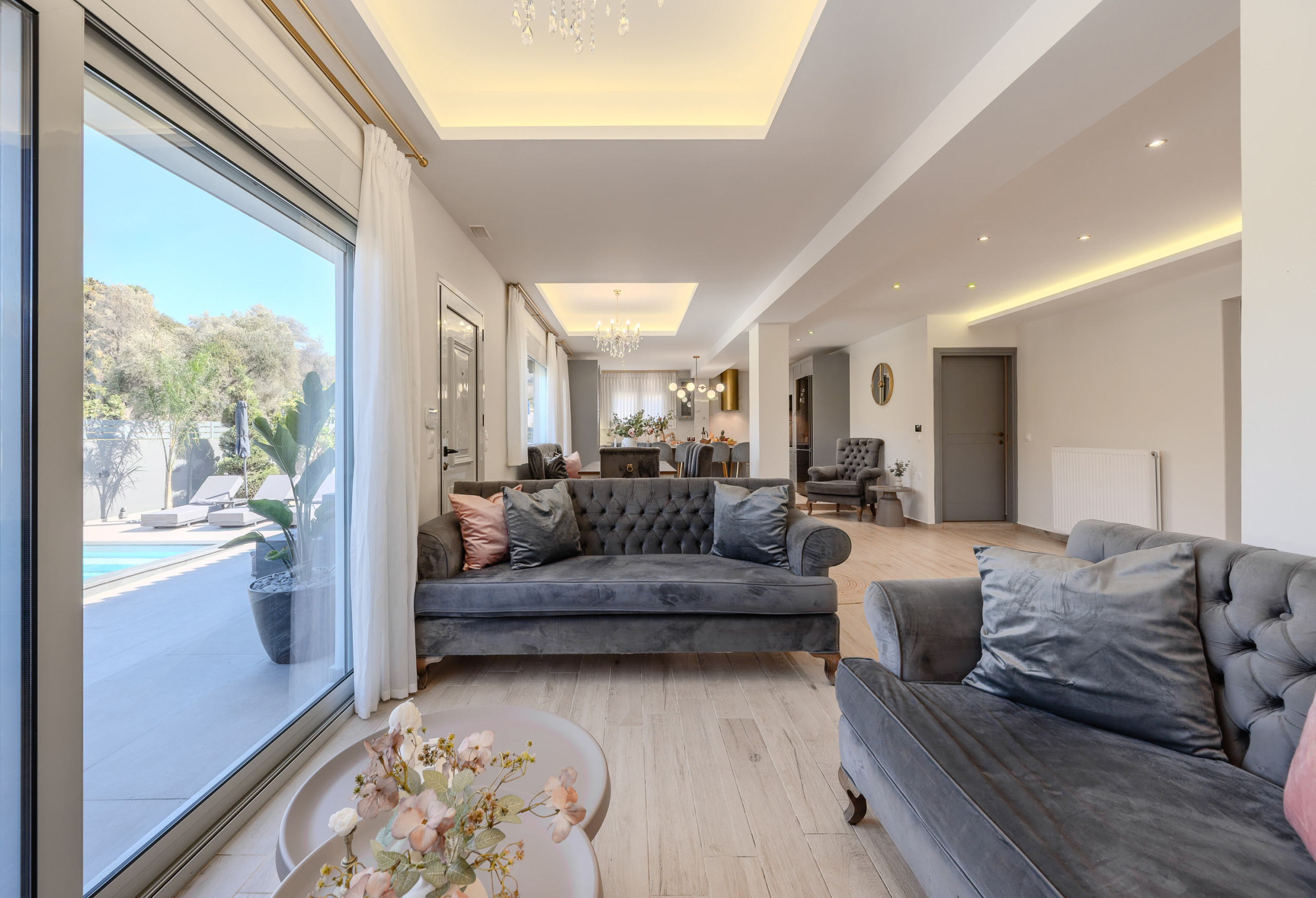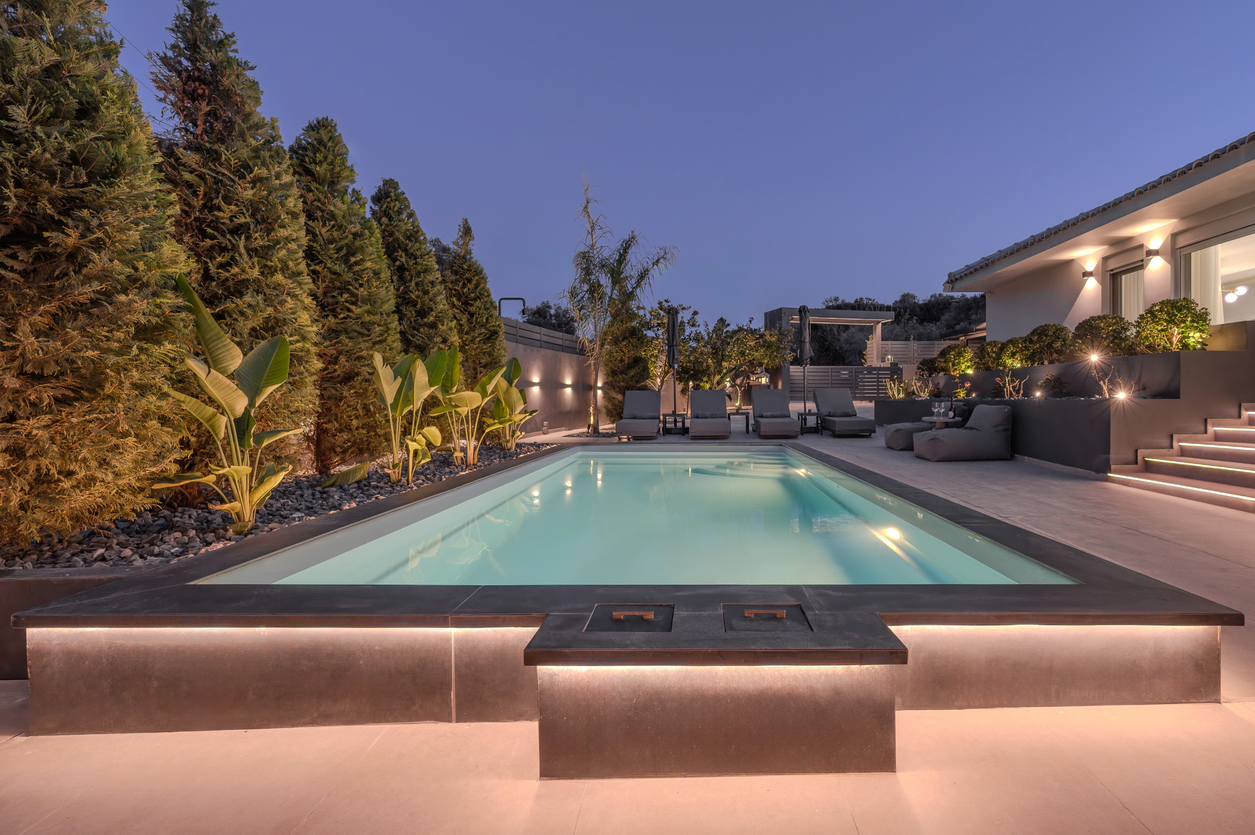 Im Freien bietet die Villa einen wunderschön gestalteten privaten Bereich mit einem Swimmingpool im Mittelpunkt, perfekt zum Entspannen unter der kretischen Sonne. Komfortable Sonnenliegen, schattige Sitzbereiche und eine vollständig ausgestattete Außenküche mit Gasgrill laden Gäste ein, lange, entspannte Mahlzeiten und Abende zusammen zu genießen. Der Essbereich im Freien bietet Platz für bis zu zehn Gäste und ist ideal für gemeinsame Momente mit Familie und Freunden.