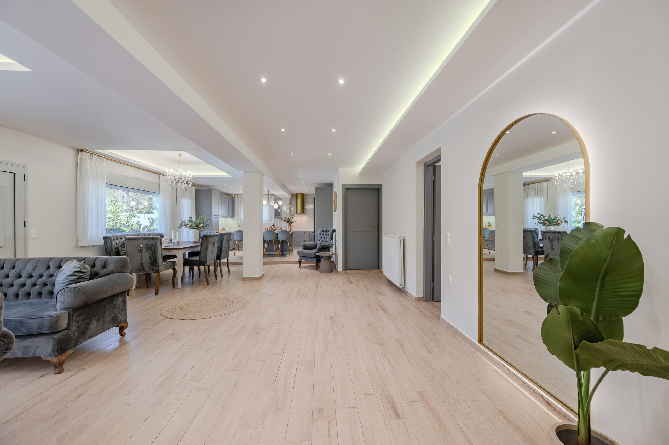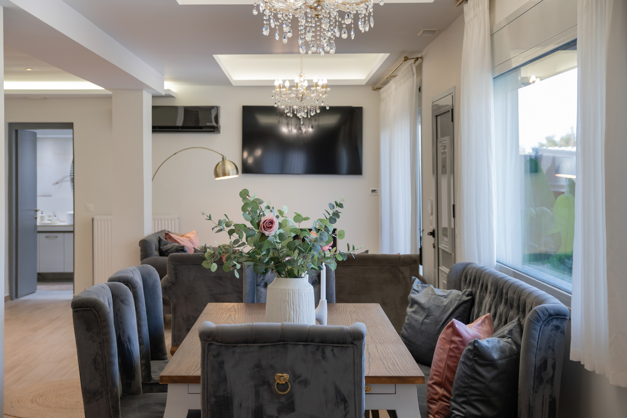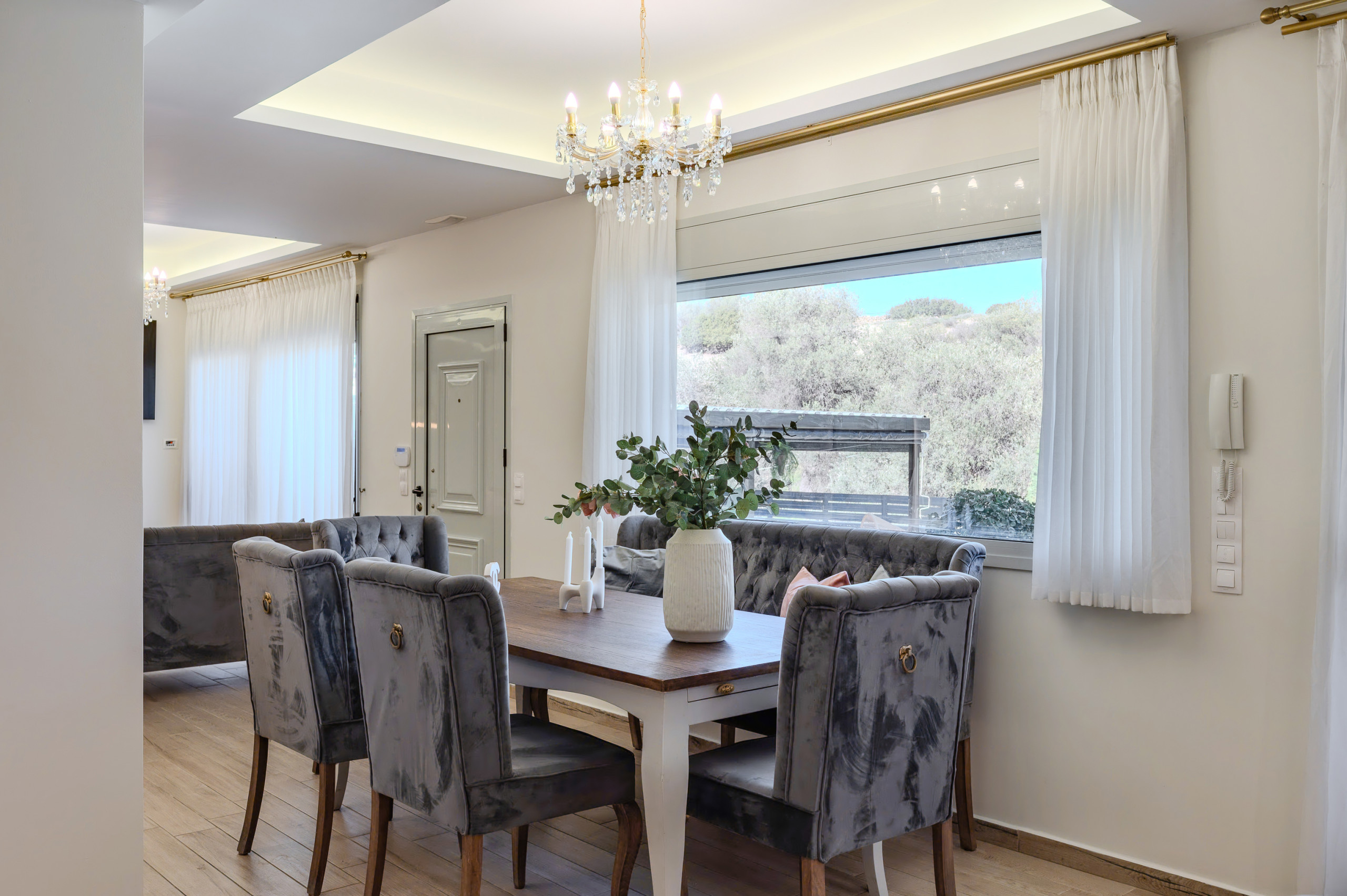 Das Innere folgt einem zeitgenössischen offenen Grundriss, in dem der Wohnbereich, der Essbereich und die vollständig ausgestattete Küche nahtlos ineinander übergehen. Große Fenster ermöglichen es, dass natürliches Licht den Raum erfüllt und eine helle und einladende Atmosphäre schafft. Die Küche ist vollständig mit modernen Geräten ausgestattet, einschließlich Espresso- und Filterkaffeemaschinen, was sie ideal für kurze und lange Aufenthalte macht.