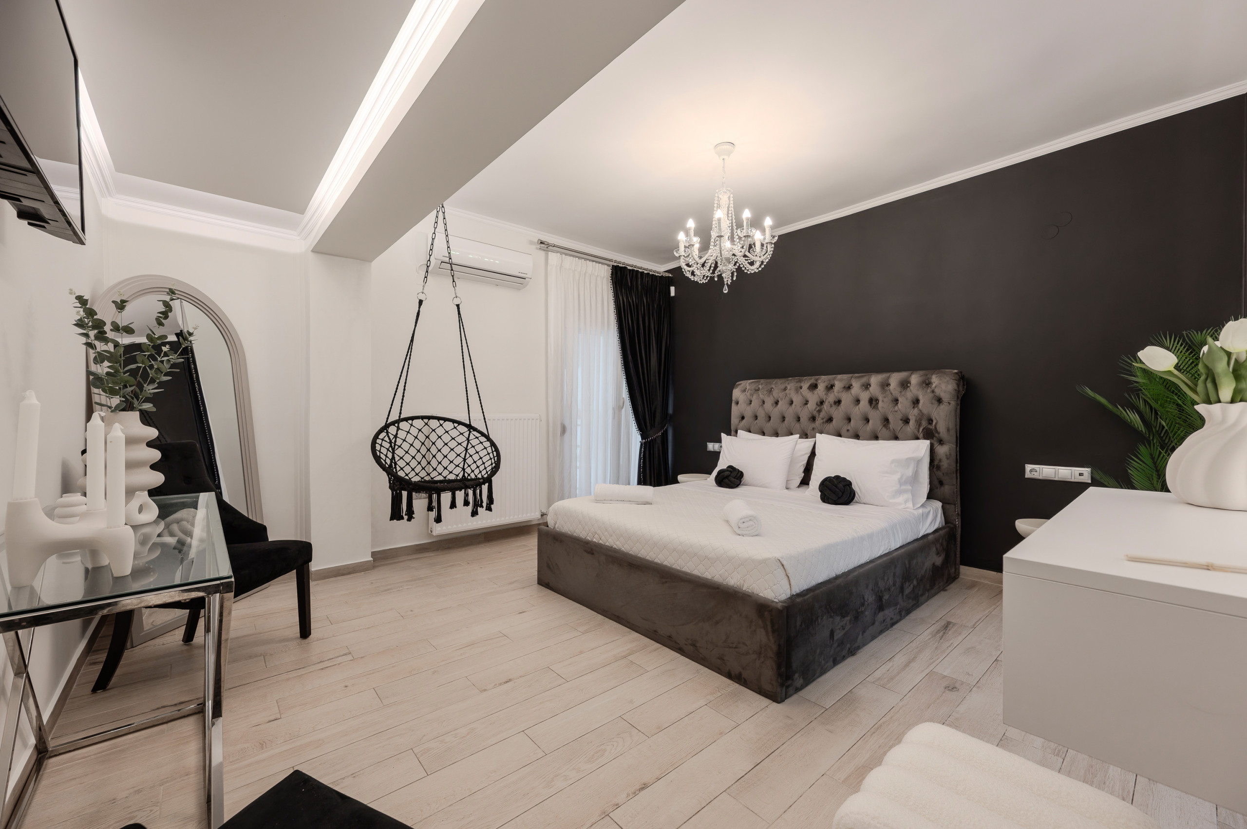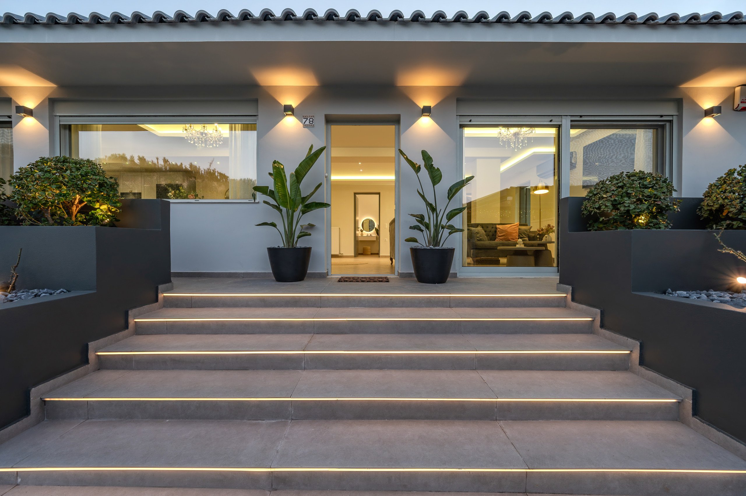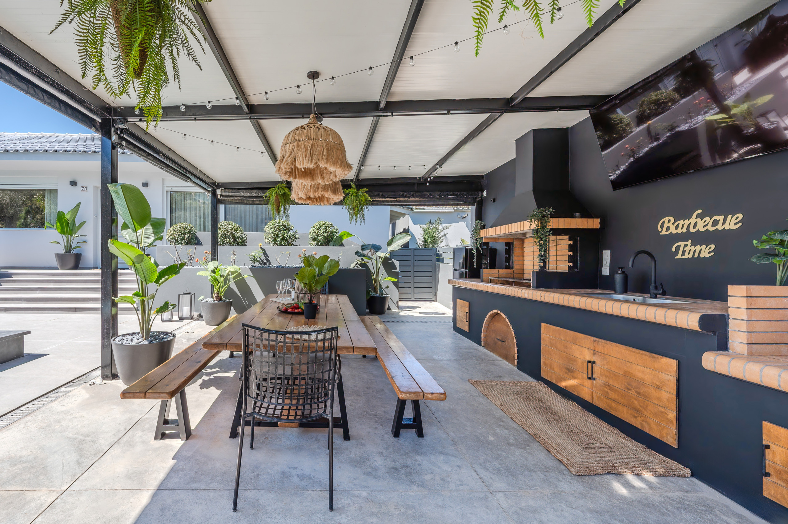 Das Innere folgt einem zeitgenössischen offenen Grundriss, in dem der Wohnbereich, der Essbereich und die vollständig ausgestattete Küche nahtlos ineinander übergehen. Große Fenster ermöglichen es, dass natürliches Licht den Raum erfüllt und eine helle und einladende Atmosphäre schafft. Die Küche ist vollständig mit modernen Geräten ausgestattet, einschließlich Espresso- und Filterkaffeemaschinen, was sie ideal für kurze und lange Aufenthalte macht.