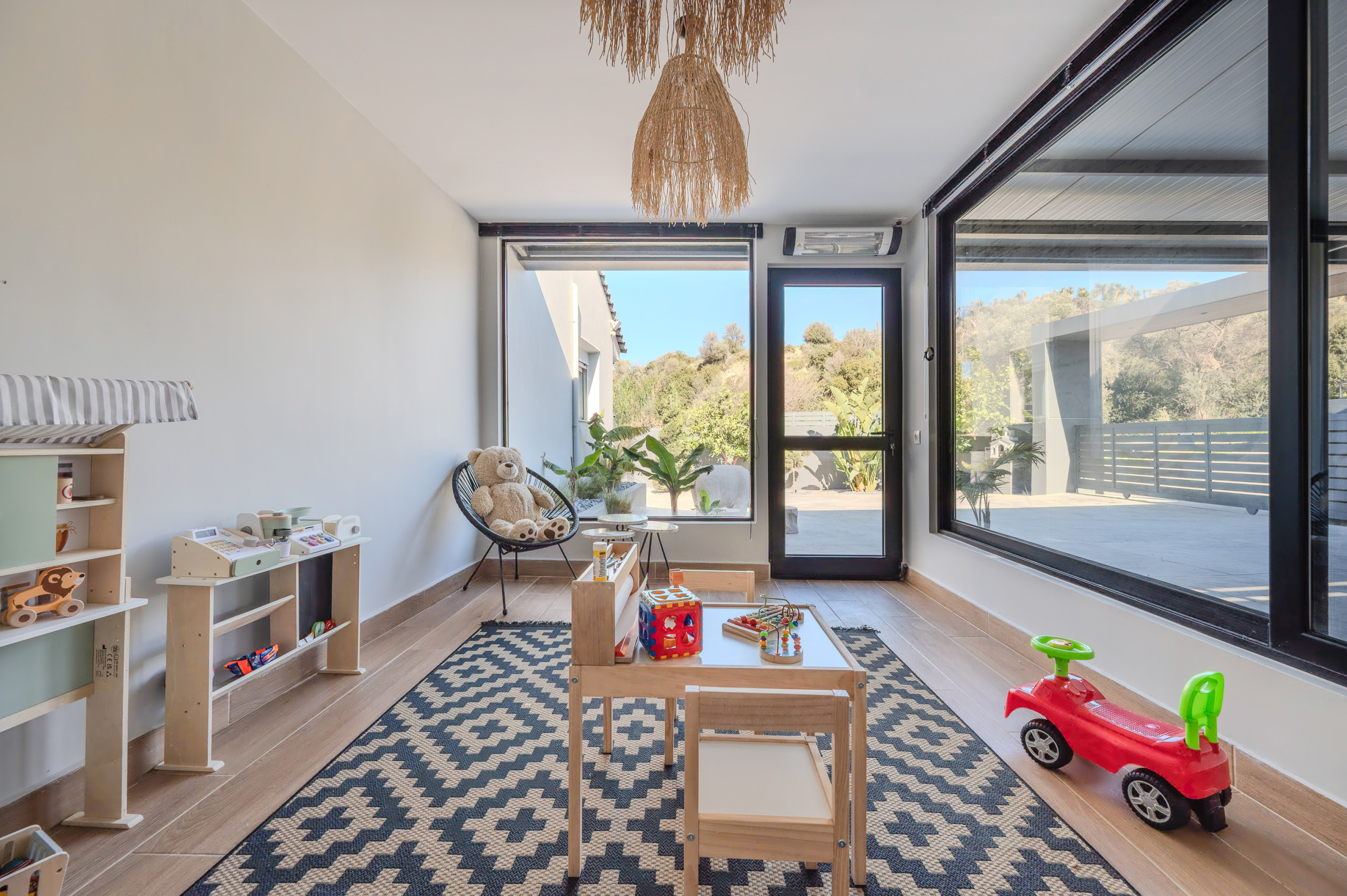 Ein herausragendes Merkmal der Villa ist ihr eigenes Spielzimmer, das einen durchdacht gestalteten Innenraum für Kinder bietet und die Immobilie besonders für Familien geeignet macht. Zusätzliche Annehmlichkeiten wie ein Babybett und ein Hochstuhl erhöhen den Komfort Ihres Aufenthalts zusätzlich.