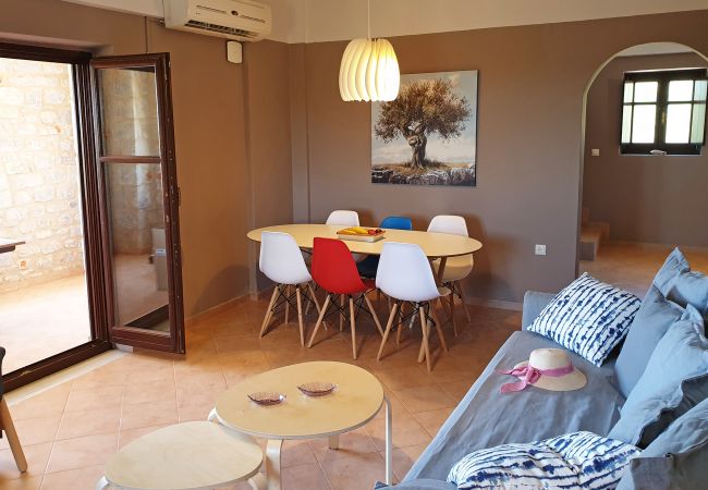 The Anaroussa Diros Maisonette is a spacious 120-square-meter house with a 2-floor layout. It comprises 3 bedrooms (two with double beds and one with 2 single beds) and 2 bathrooms with a bathtub/WC on the ground floor, along with a smaller shower/WC on the upper floor. There is the option to host 1 or 2 additional guests in the living room using sofa beds, accommodating up to 8 people. The maisonette features a fully equipped kitchen and a modern living and dining area. Two balconies are available with a fantastic view of the sea and the surrounding olive groves.