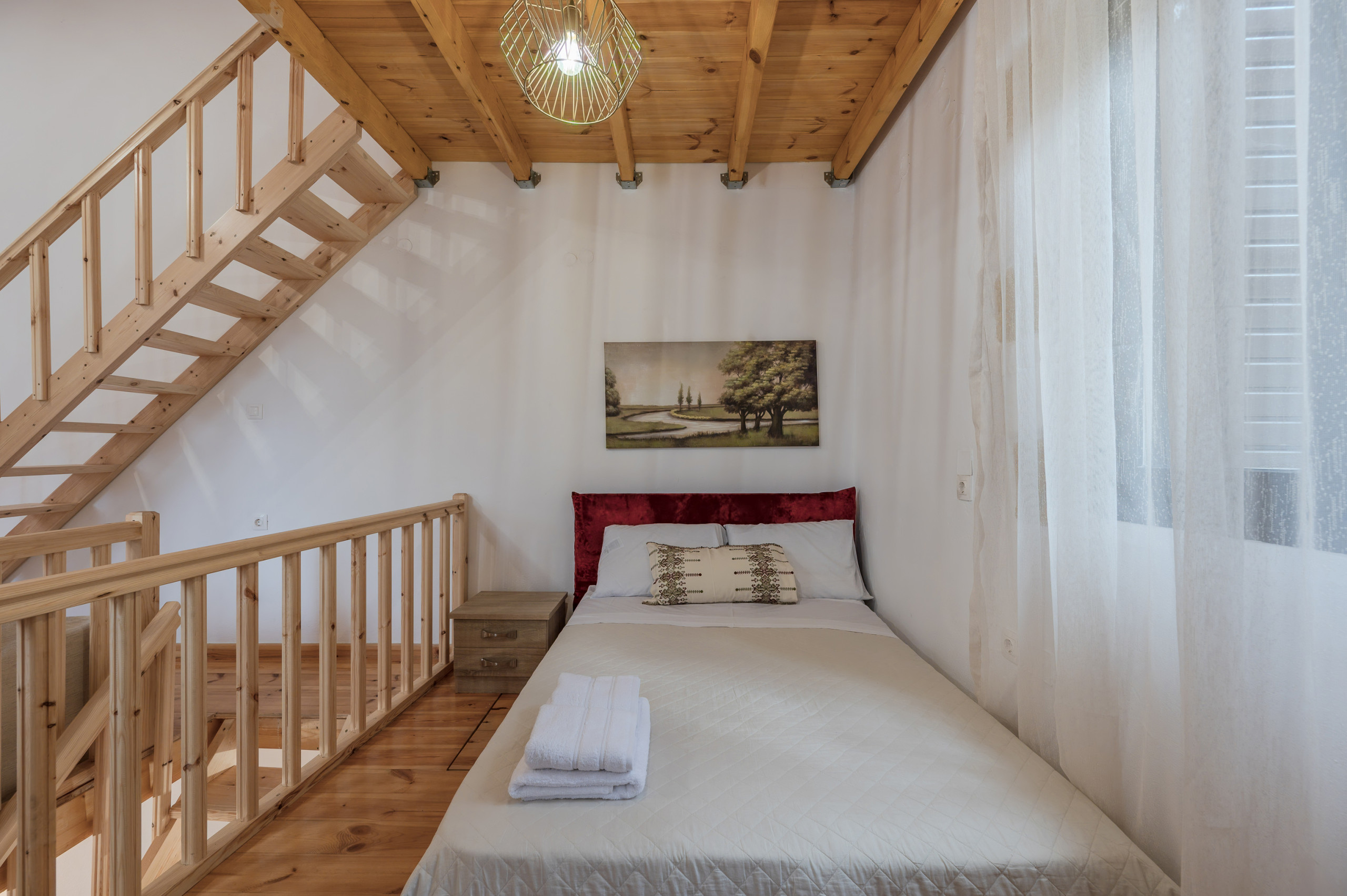 On the ground floor, you will find a fully equipped kitchen with all essential appliances, a dining table, a cozy sitting area, and a spacious shower WC. From here, an internal wooden staircase leads to the middle level, which features a warm and inviting living area along with a double bed. The upper level hosts a second double bed. Please note that the floors are open-plan without doors, creating a loft-style layout.