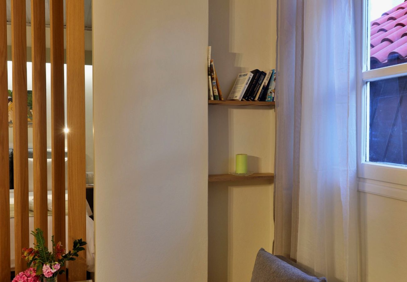 The apartment is flooded with natural light and features a cozy living room with a sofa bed and modern furnishings, complete with a dining table. It also boasts a fully equipped open-plan kitchen and a well-appointed bathroom. Additionally, there is a spacious double bed and ample closet space.