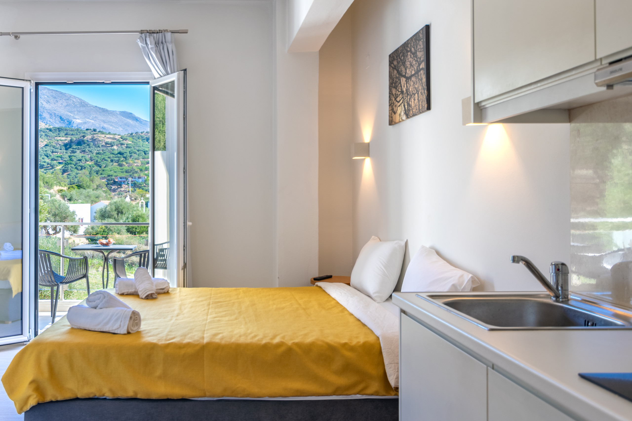 • Studio 14 (2–3 guests): First-floor studio with a double bed and sofa bed, kitchenette (2 cooking rings & mini oven), shower/WC, and a furnished balcony.