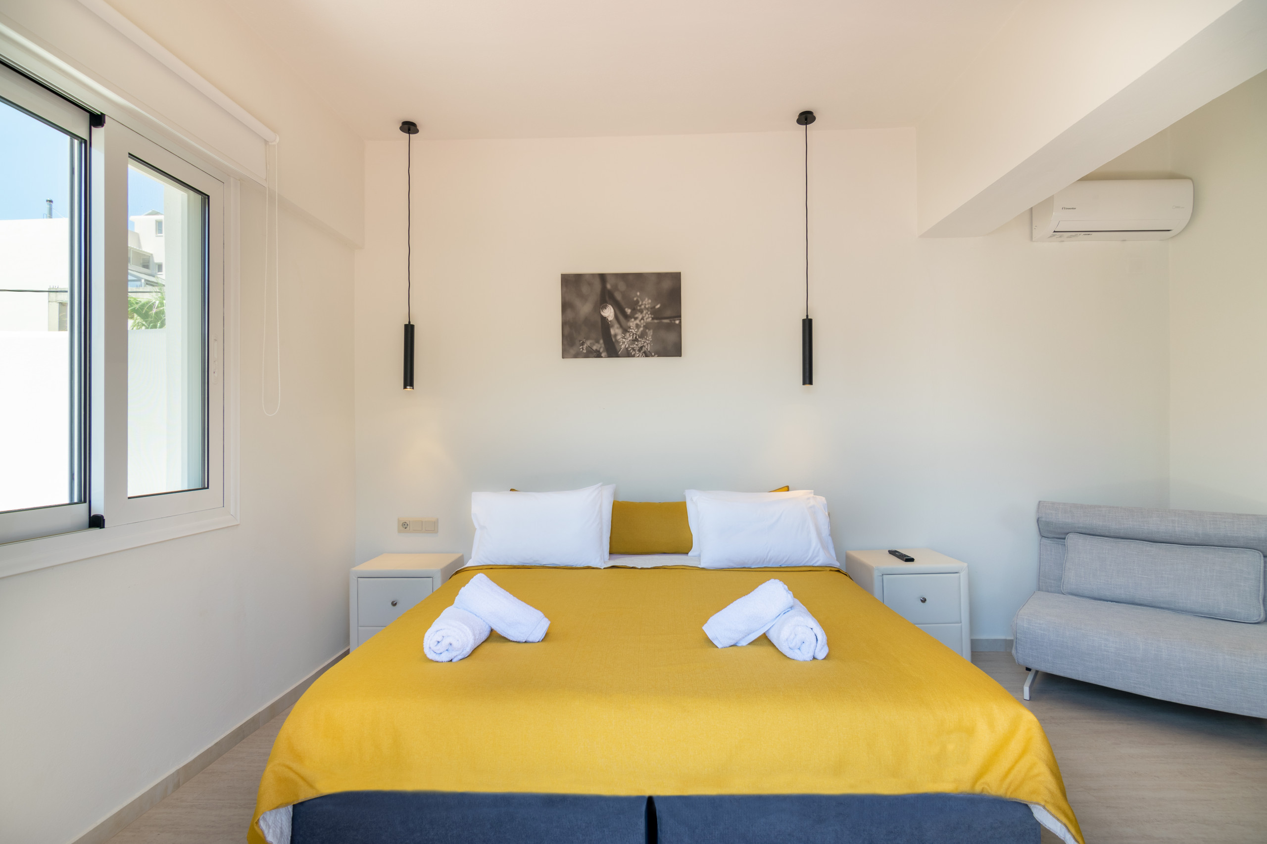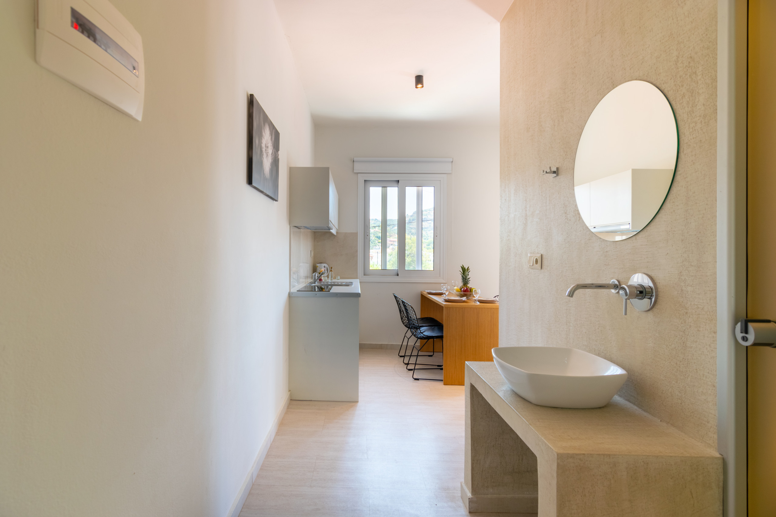 • Studio 12 (2–3 guests): First-floor studio with a double bed and a sofa bed, small kitchenette (2 cooking rings & mini oven), shower/WC, and a furnished balcony.
