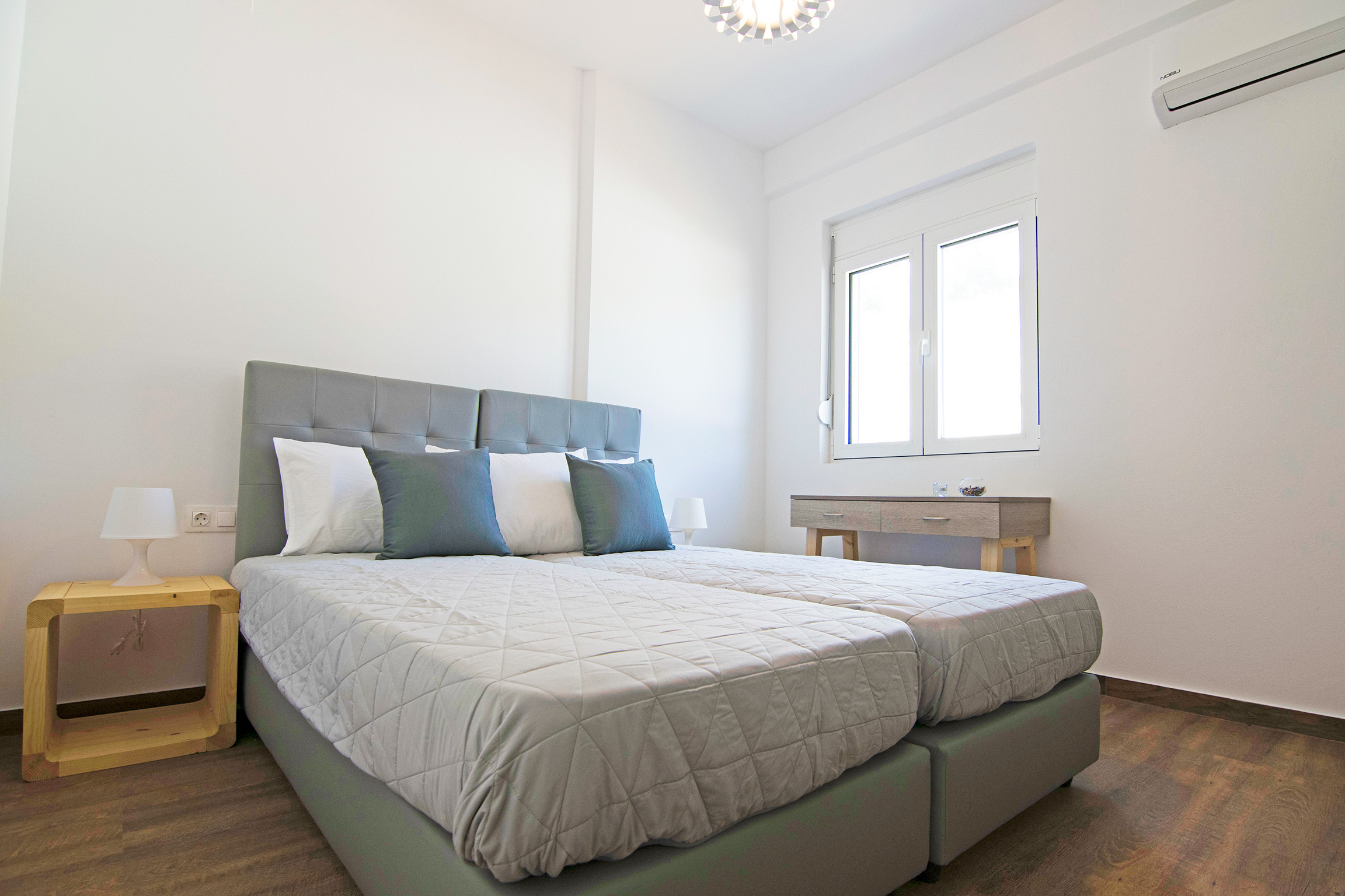 The villa features two bedrooms, one with a double bed and the other with twin beds. Additionally, one of the sofas can be converted into a bed, suitable for a child. There are two modern bathrooms, one with a bathtub ensuite and another with a shower and WC adjacent to the second bedroom. The open-plan modern kitchen is fully equipped with modern appliances and utensils, seamlessly connected to the spacious living room with sophisticated decor.
