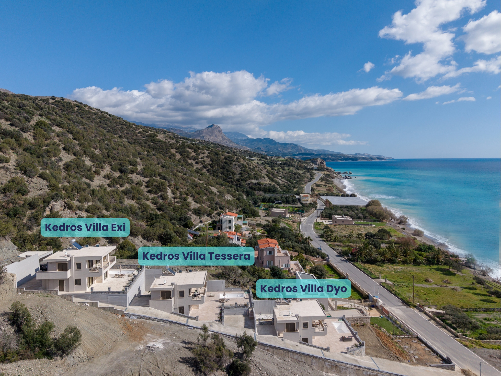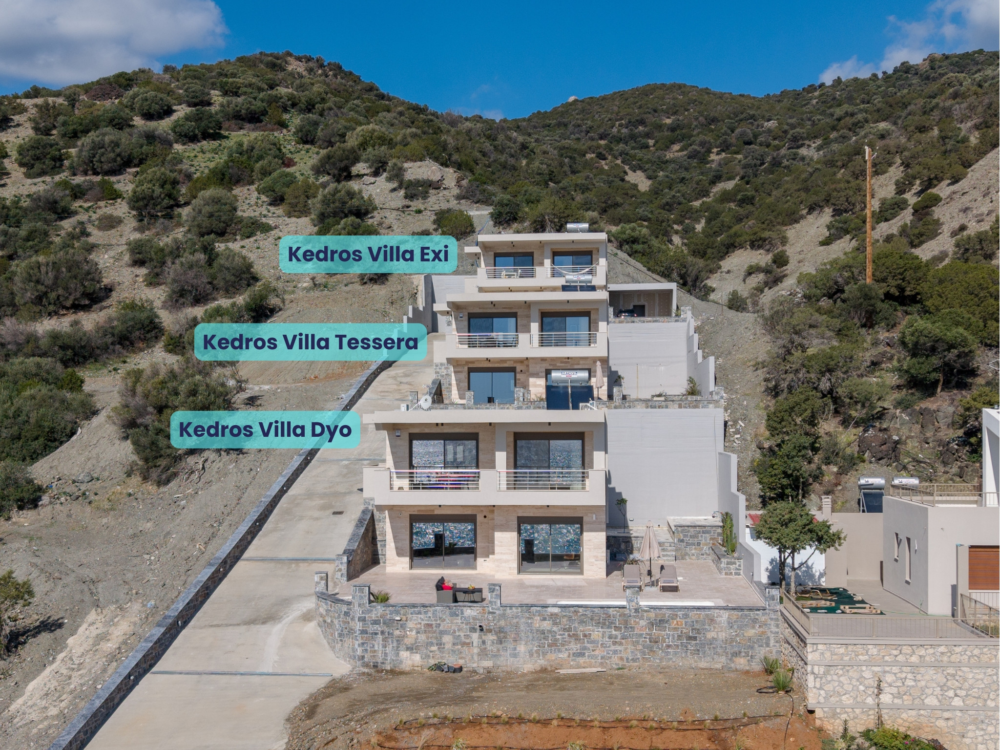 For larger groups, two additional identical villas are available within the same complex:Kedros Villa Exi and Kedros Villa Tessera.