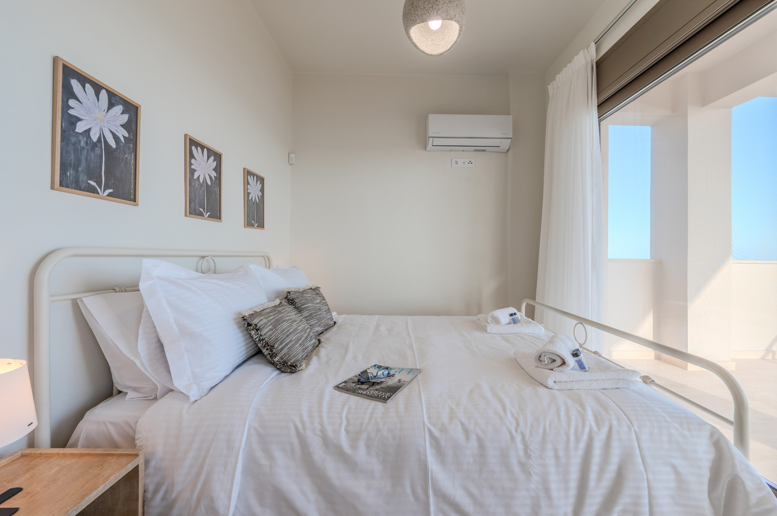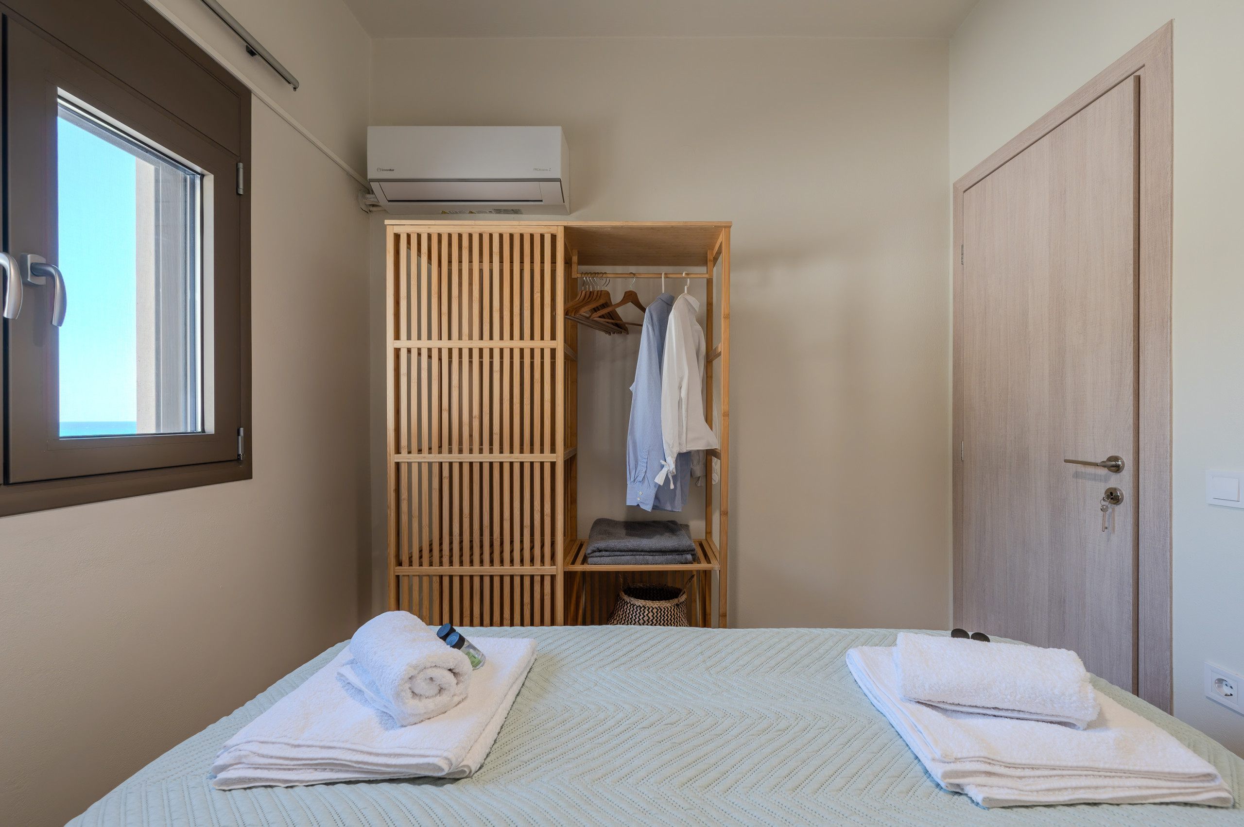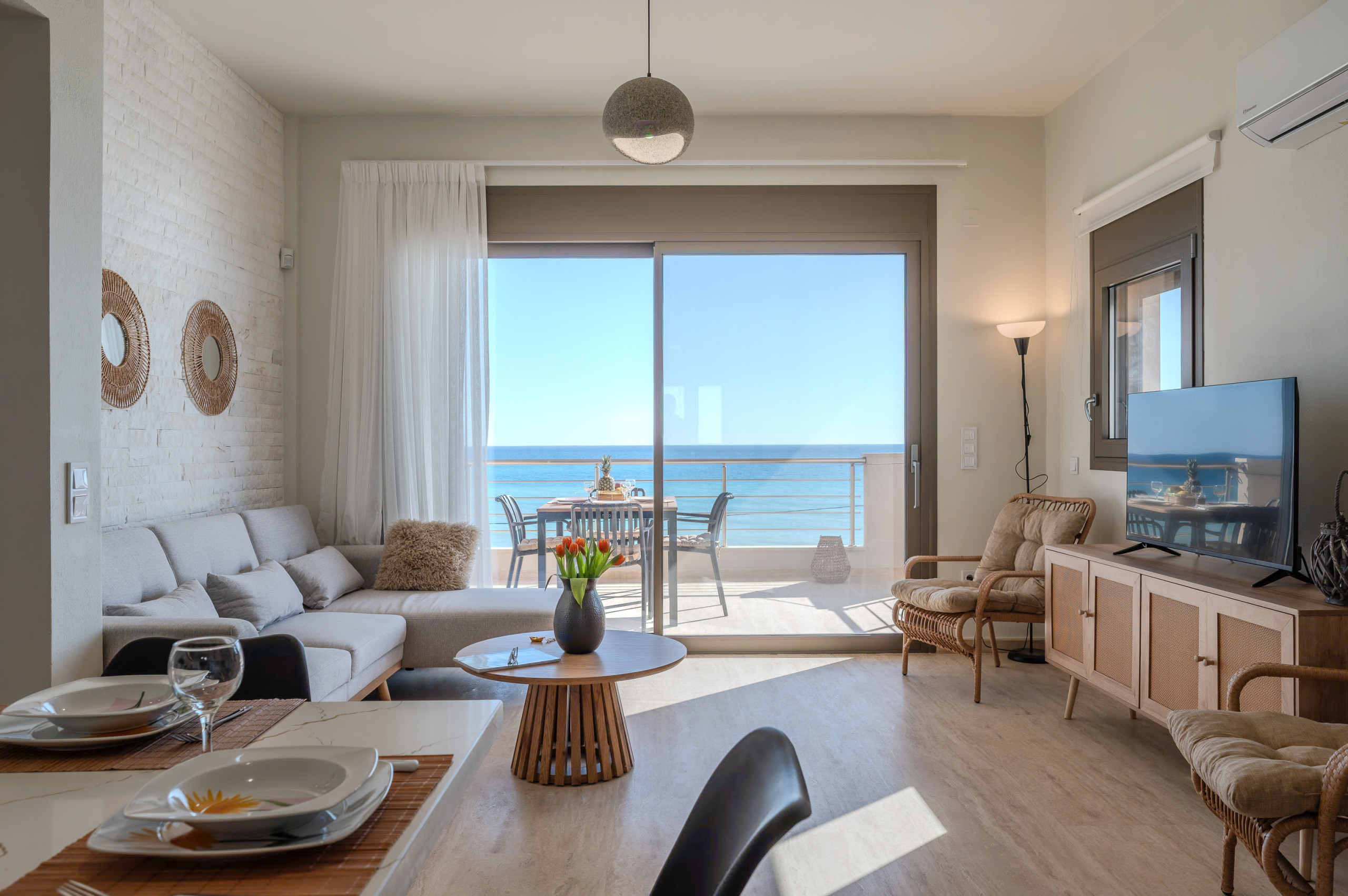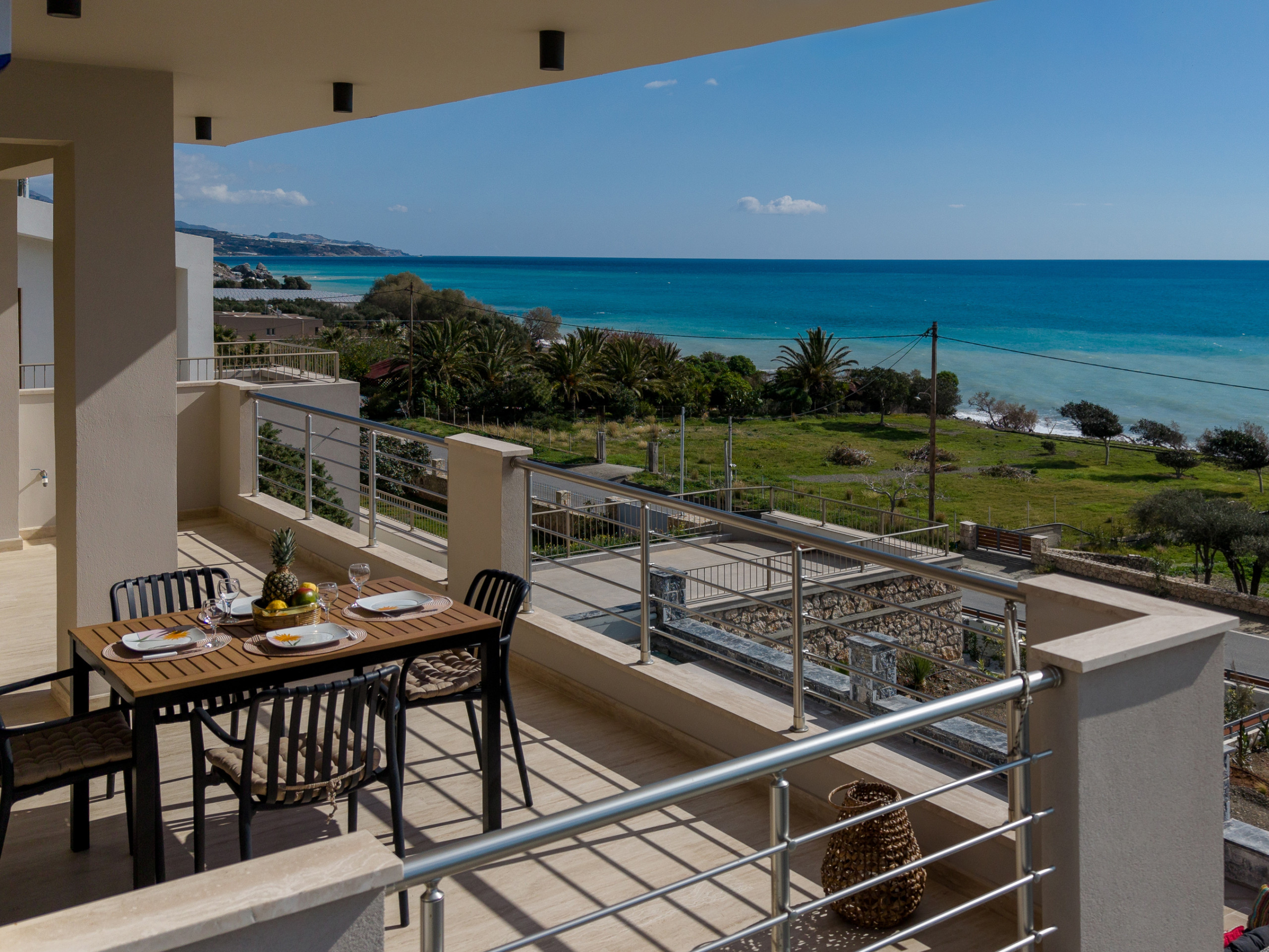 One of the bedrooms and the living area open onto a spacious sea-view balcony, furnished with a dining table—perfect for al fresco dining while enjoying uninterrupted views of the beach and the South Cretan Sea.