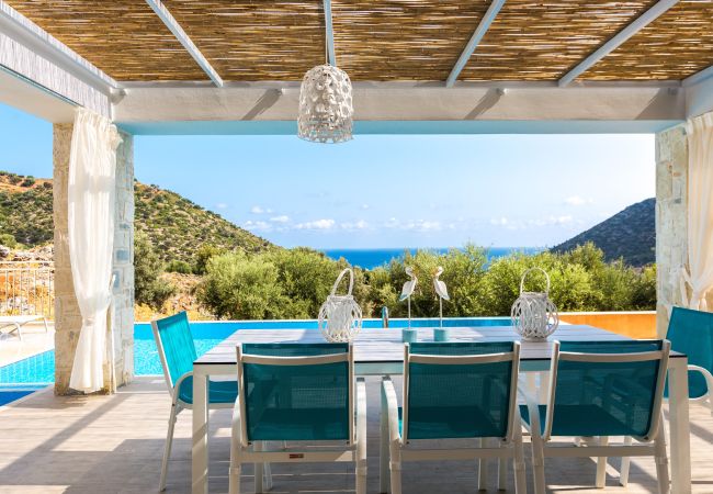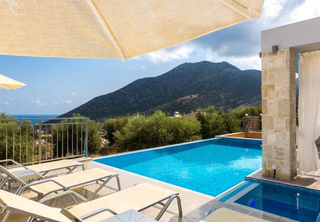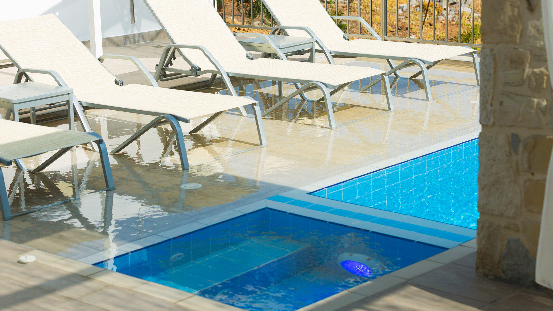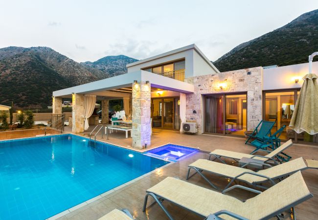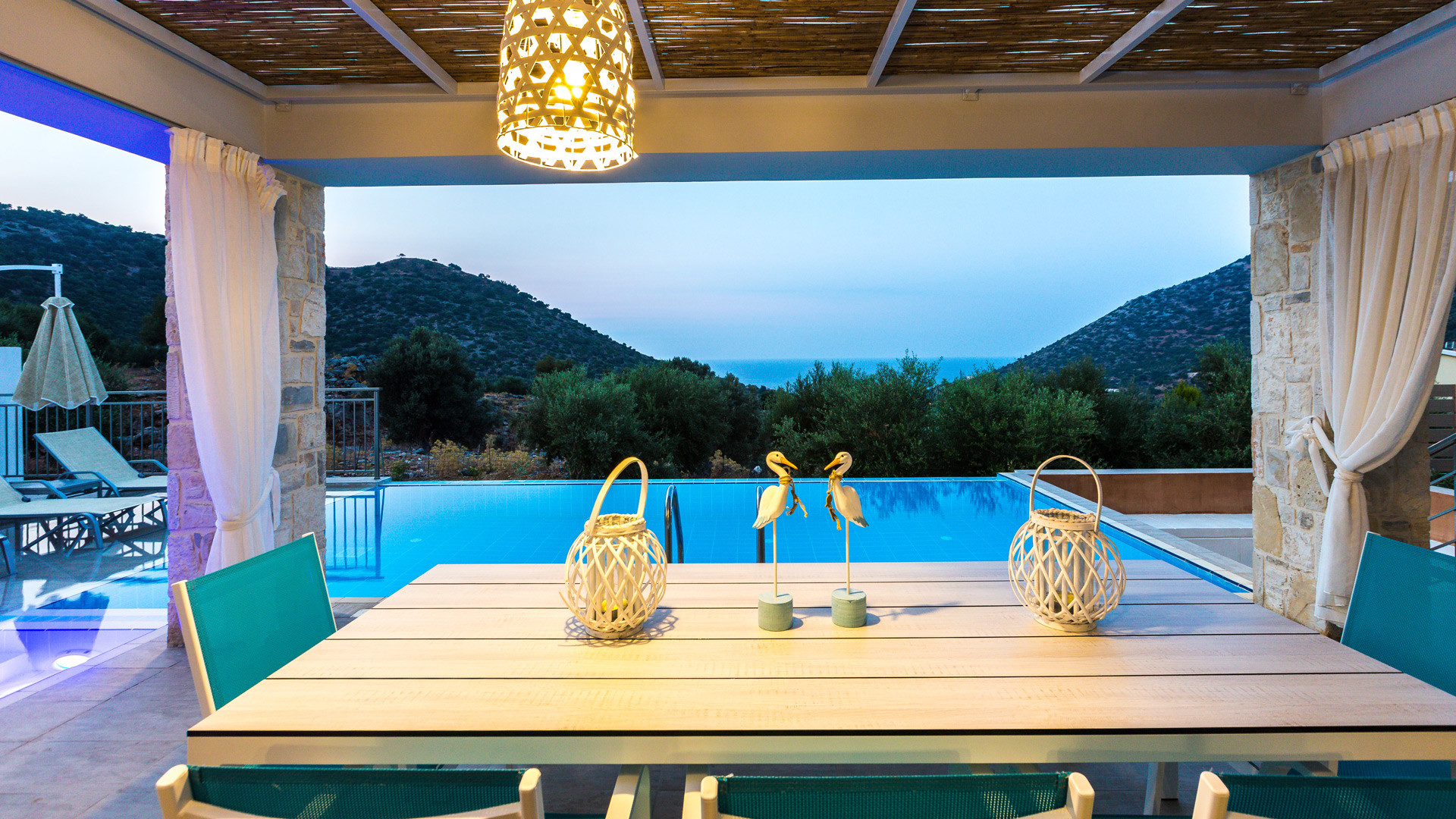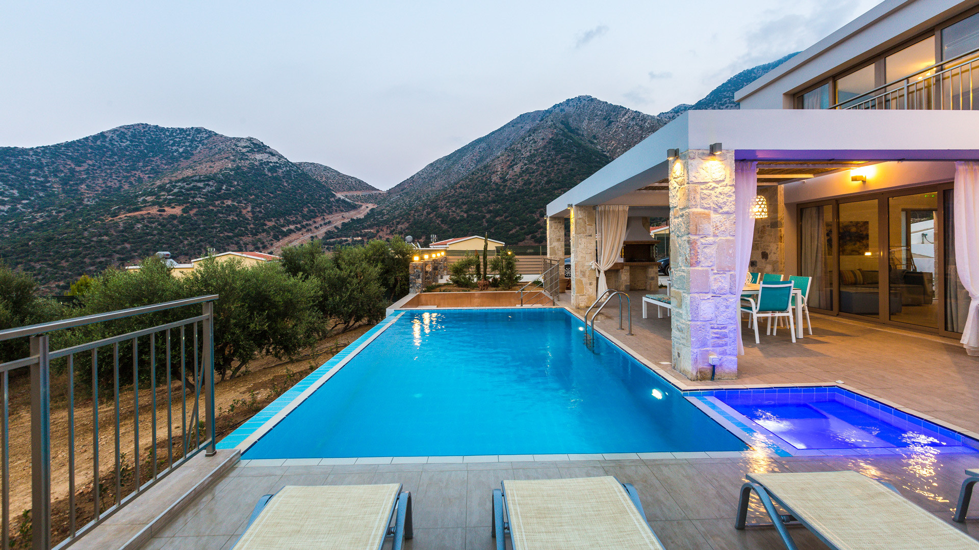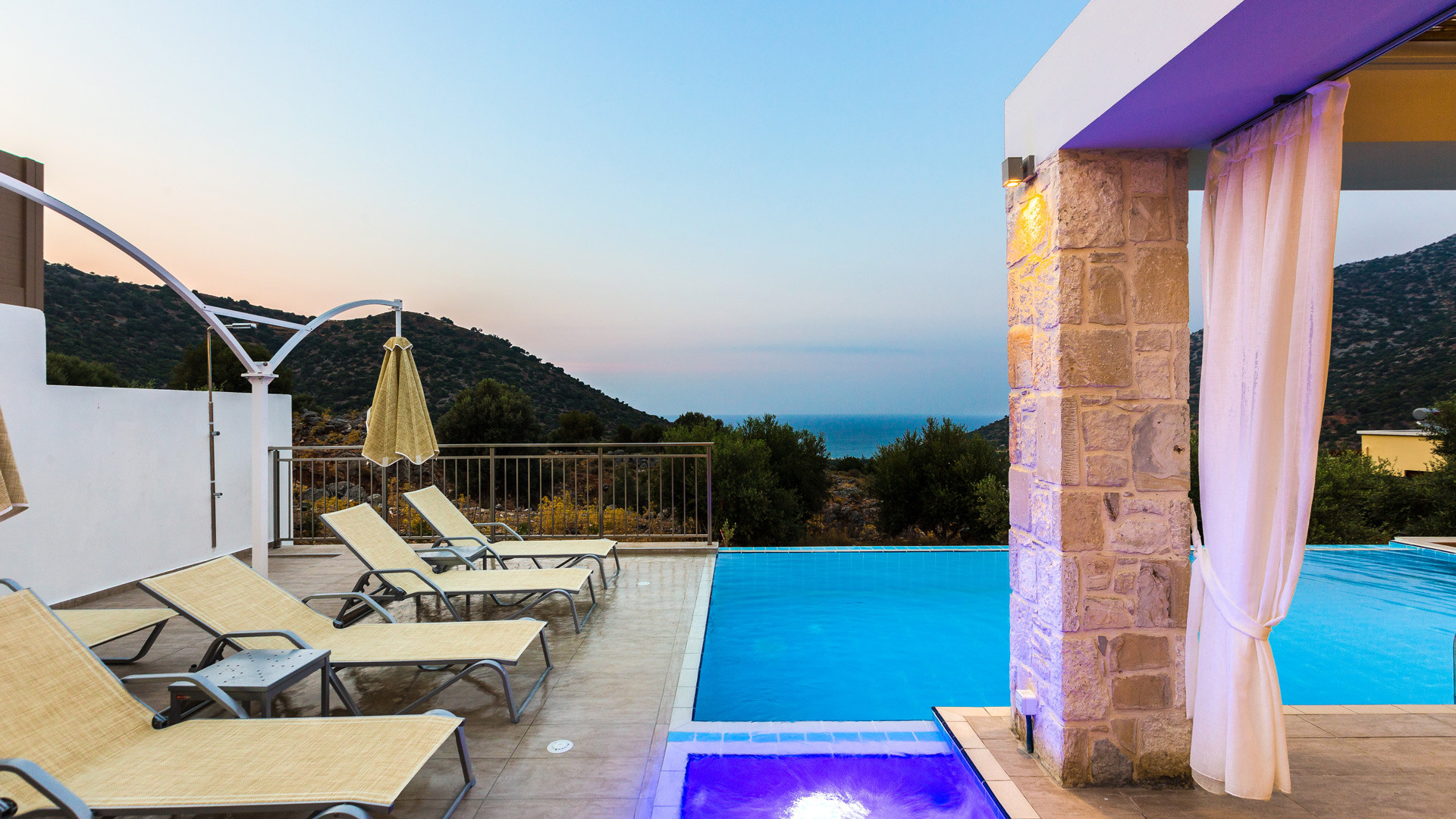 Outdoors, a spacious terrace hosts a 35 m² private swimming pool with a built-in Jacuzzi, sunbeds and parasols, offering panoramic views of the Cretan sea and countryside. Guests can enjoy al fresco dining under the shaded pergola with BBQ facilities and a large dining table – perfect for unforgettable family meals or friendly gatherings. At night, the illuminated pool and garden create a romantic and magical atmosphere.