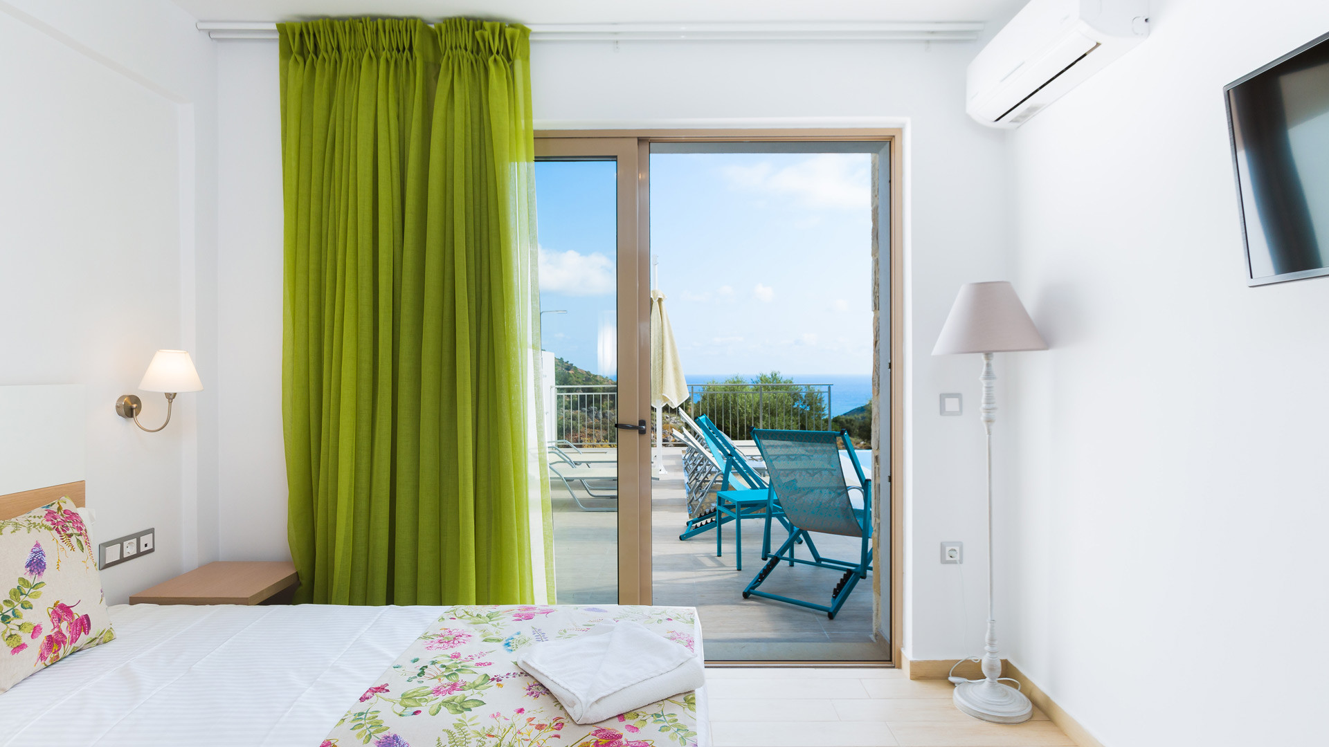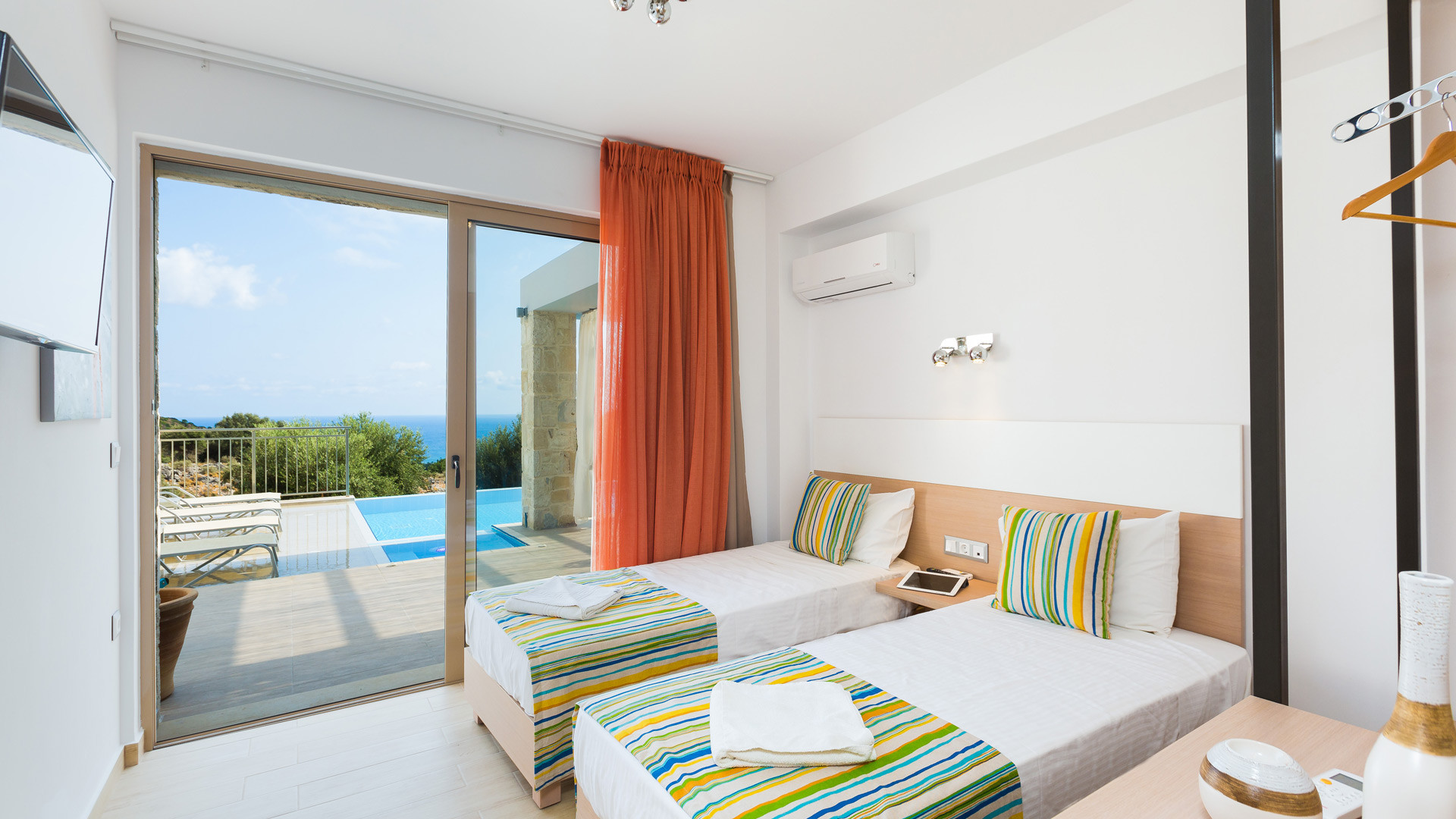 Ground Floor Bedrooms: Two double bedrooms (one with en suite bathroom) and one twin bedroom, all with direct access to the terrace and sea views. An additional family bathroom with glass shower cabin adds extra comfort.