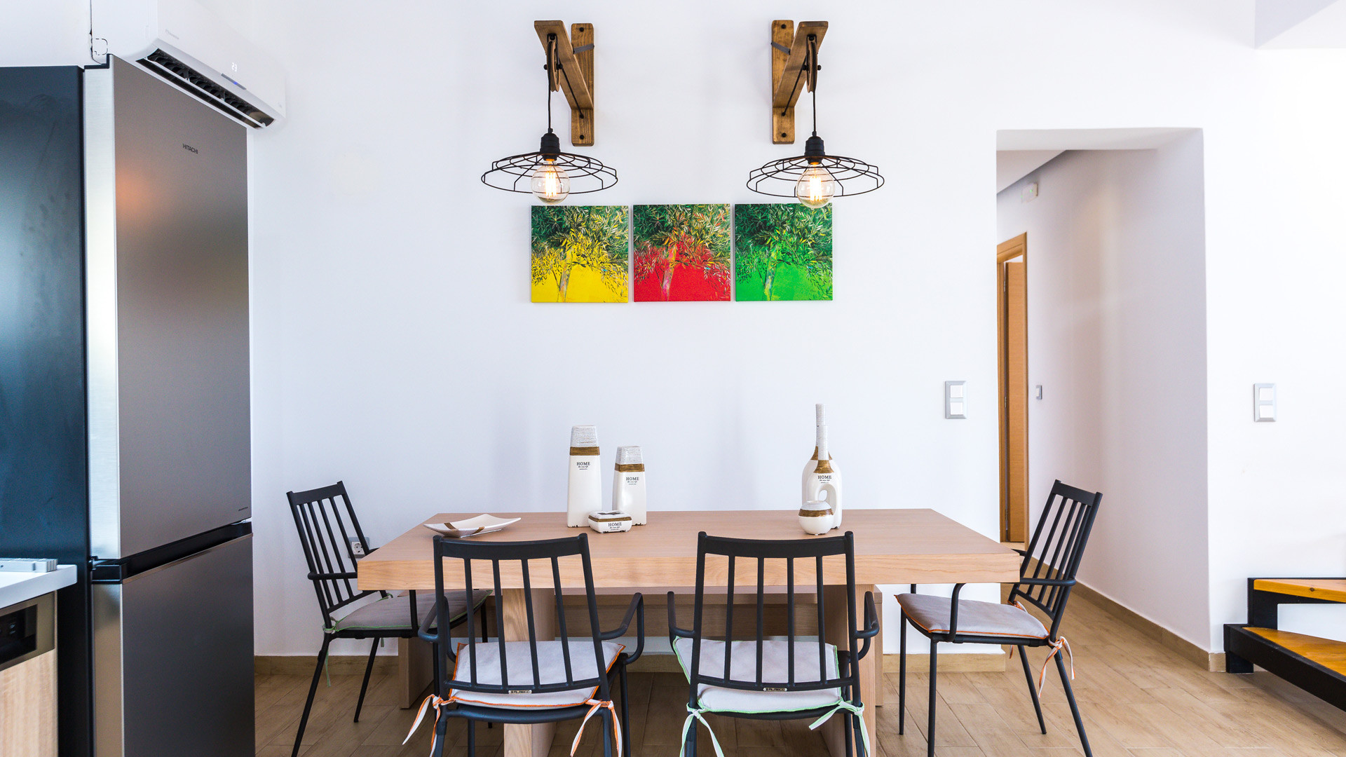 Kitchen & Dining: Fully equipped modern kitchen with wooden design details and a spacious dining area for 8 guests.