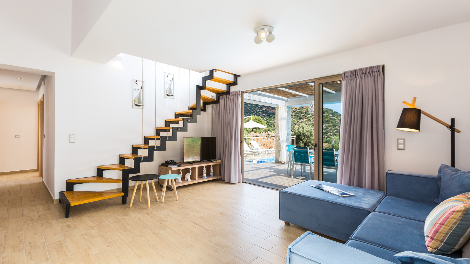 Living Room: Stylishly furnished with a comfortable sofa (convertible into a bed), Smart TV, and PlayStation (on request). Direct access to the pool terrace.
