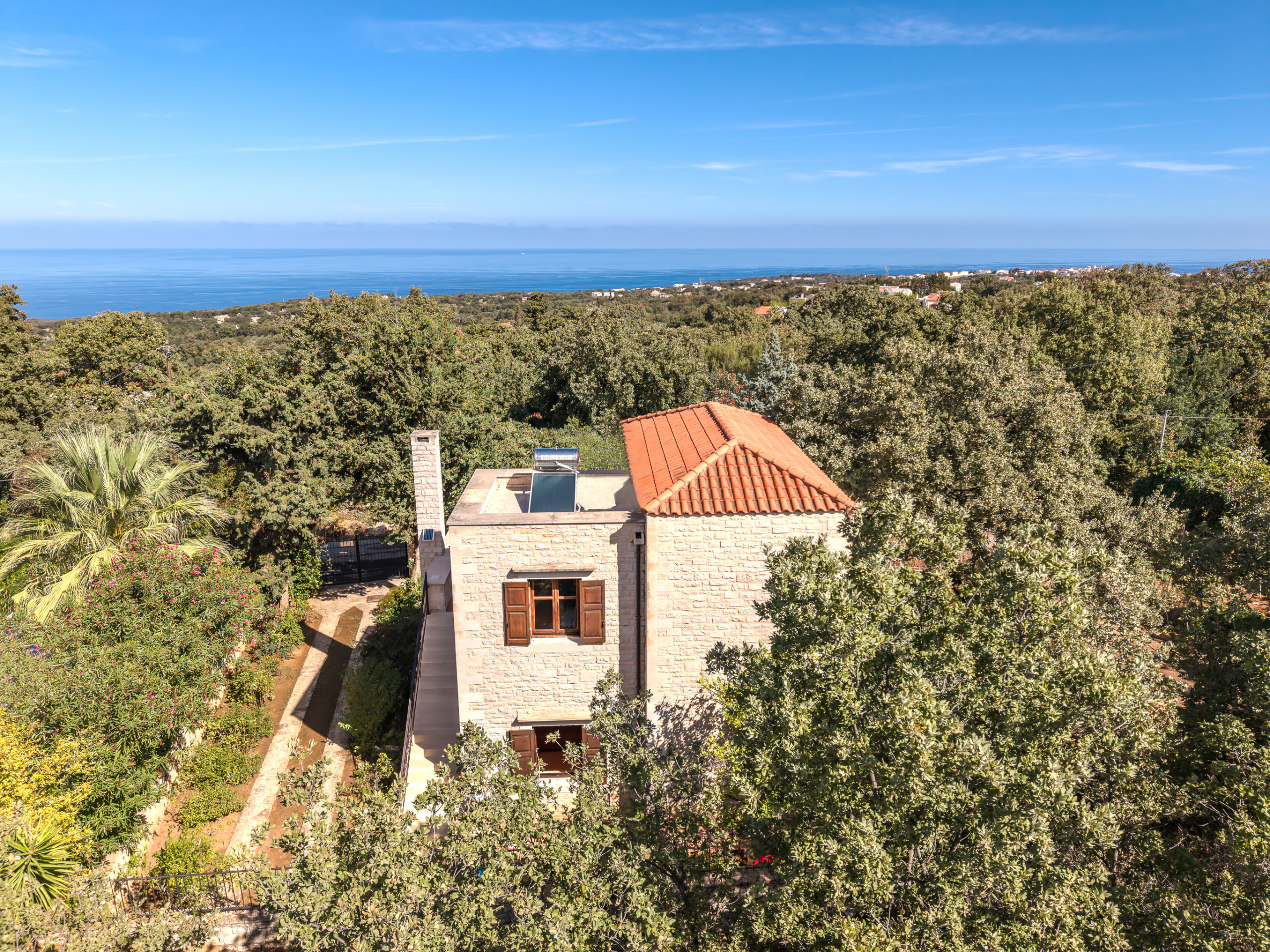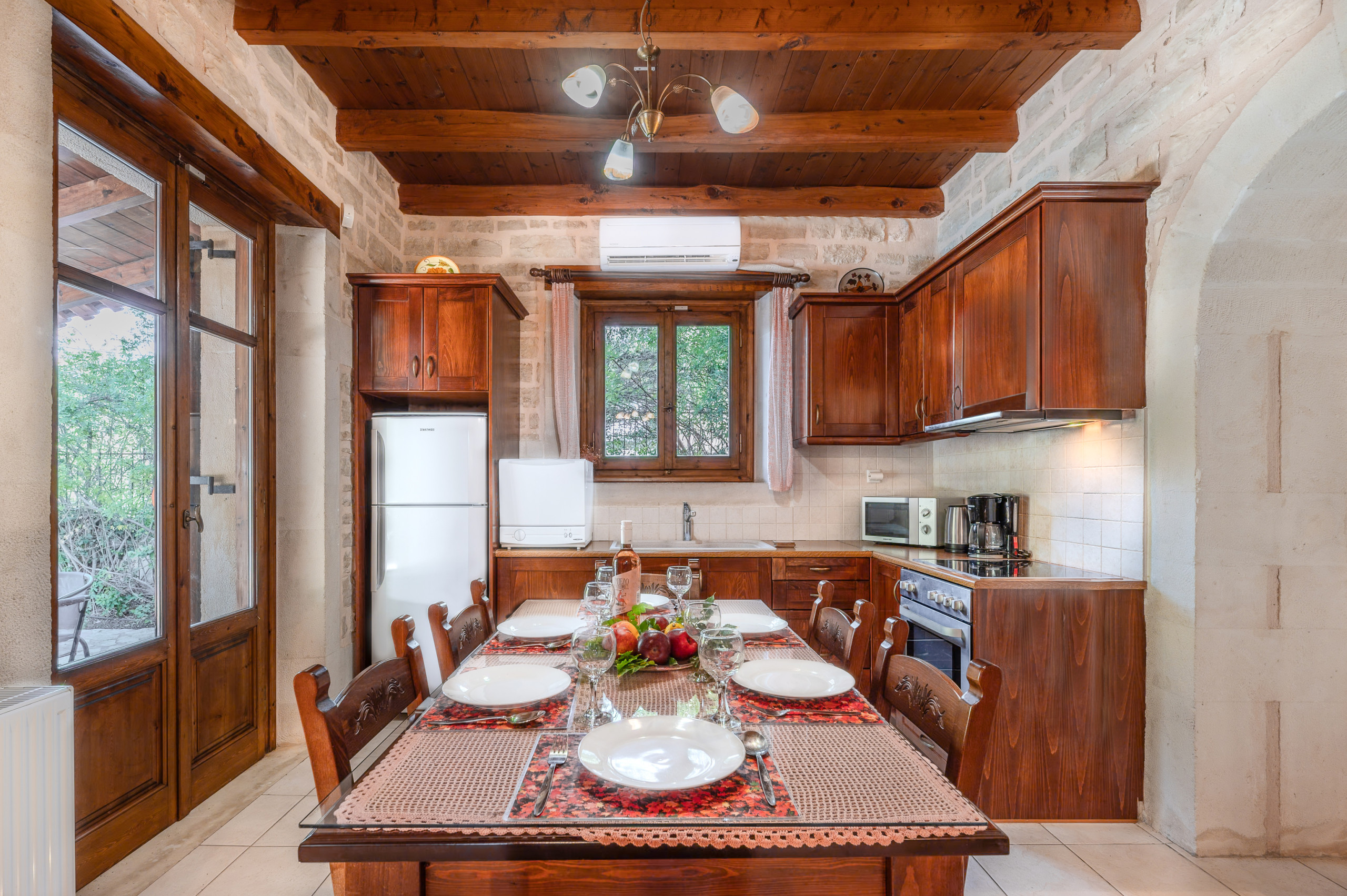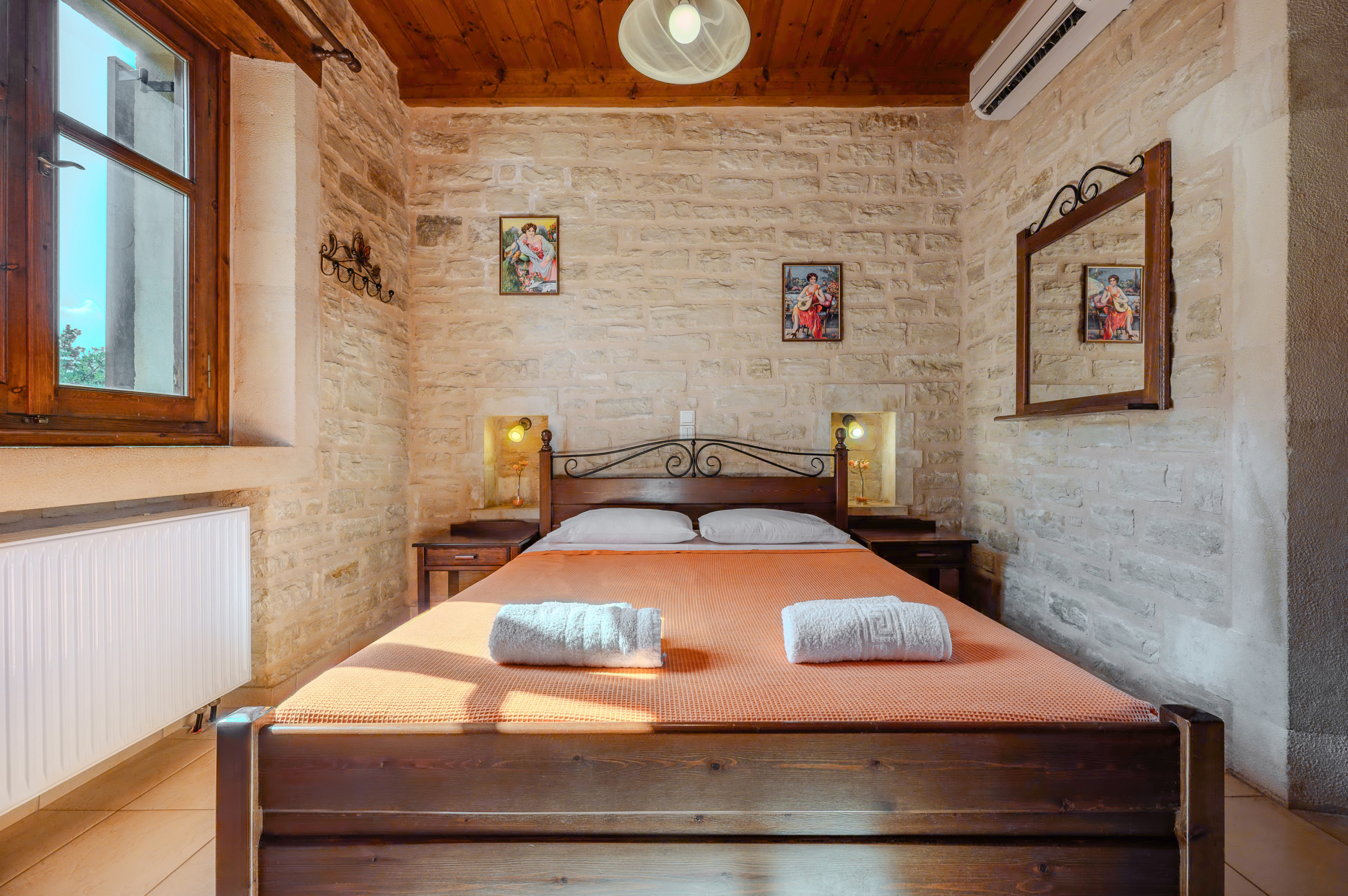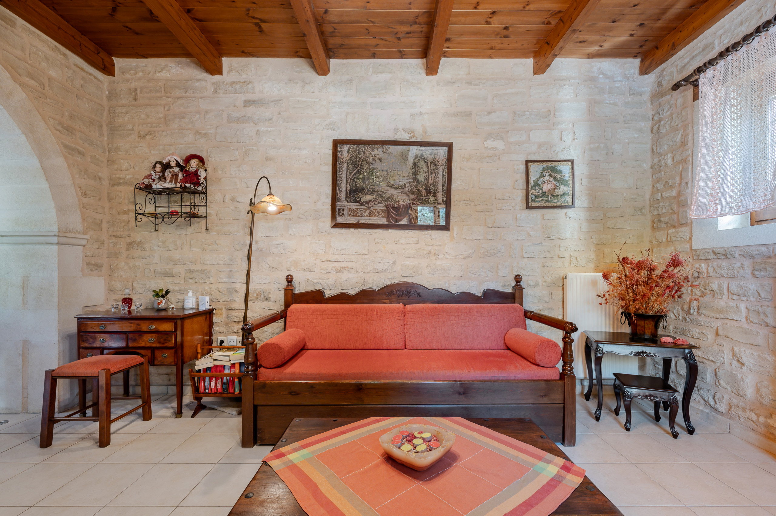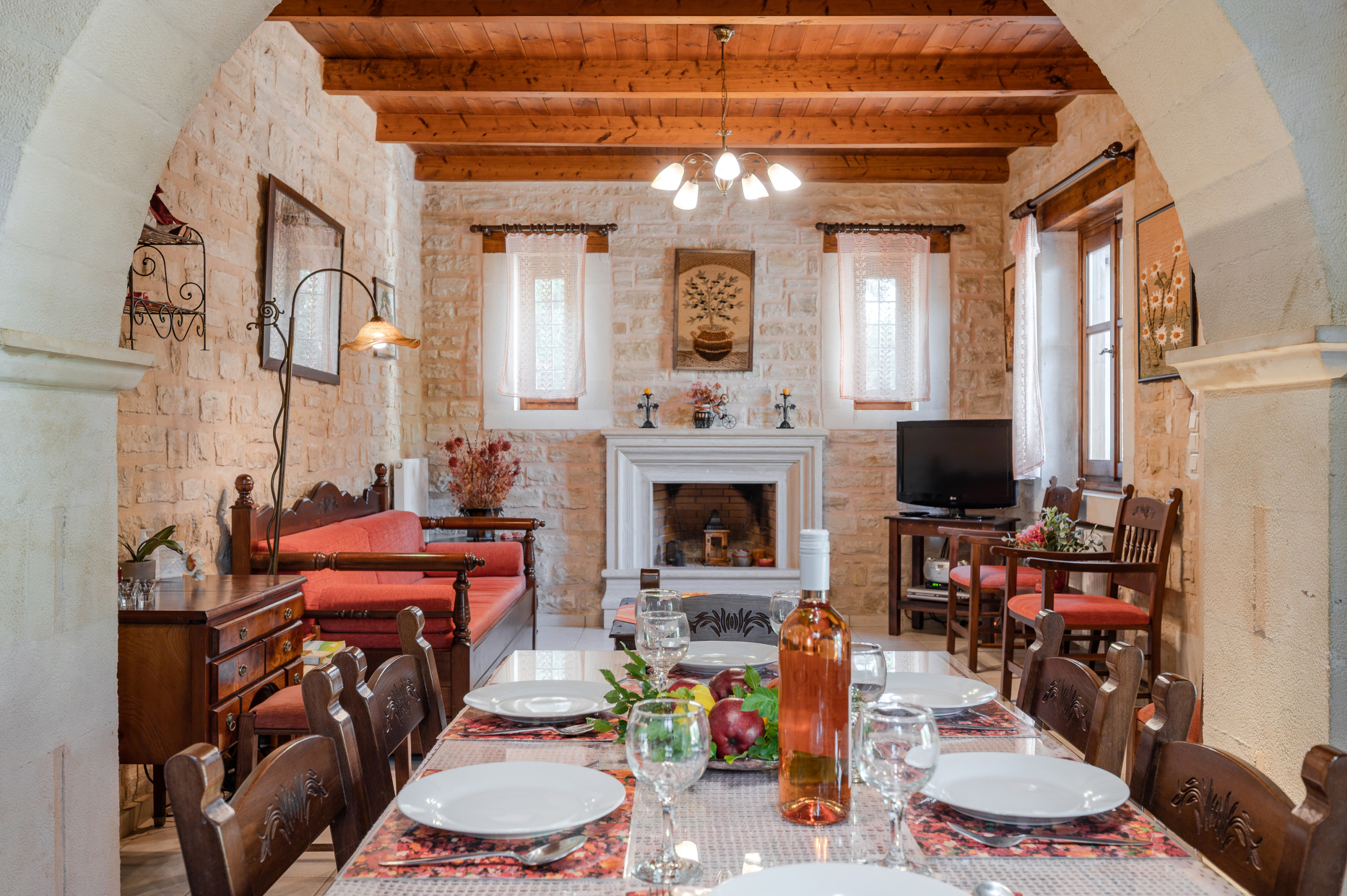Designed in the warm, rustic style of Crete, the villa features handcrafted wooden furniture and a cozy atmosphere throughout. The ground floor hosts a spacious living room with a fireplace and a sofa that can also be turned into a bed, comfortably accommodating two additional guests.