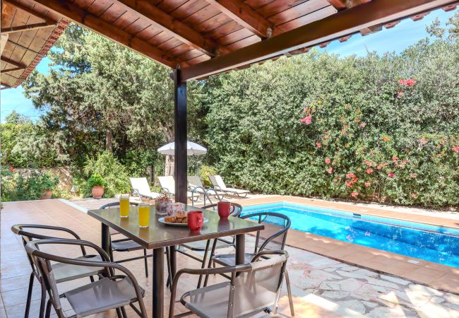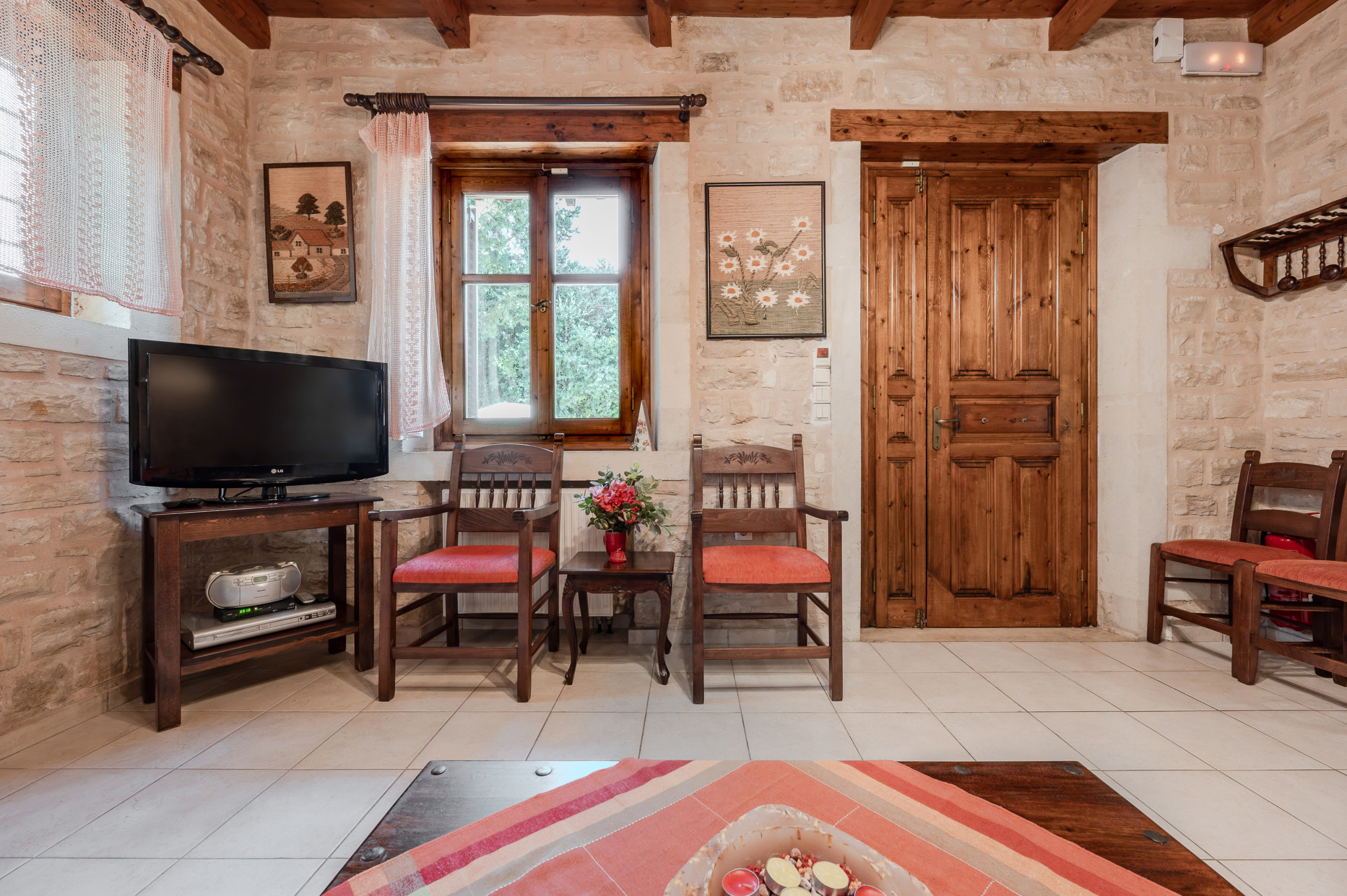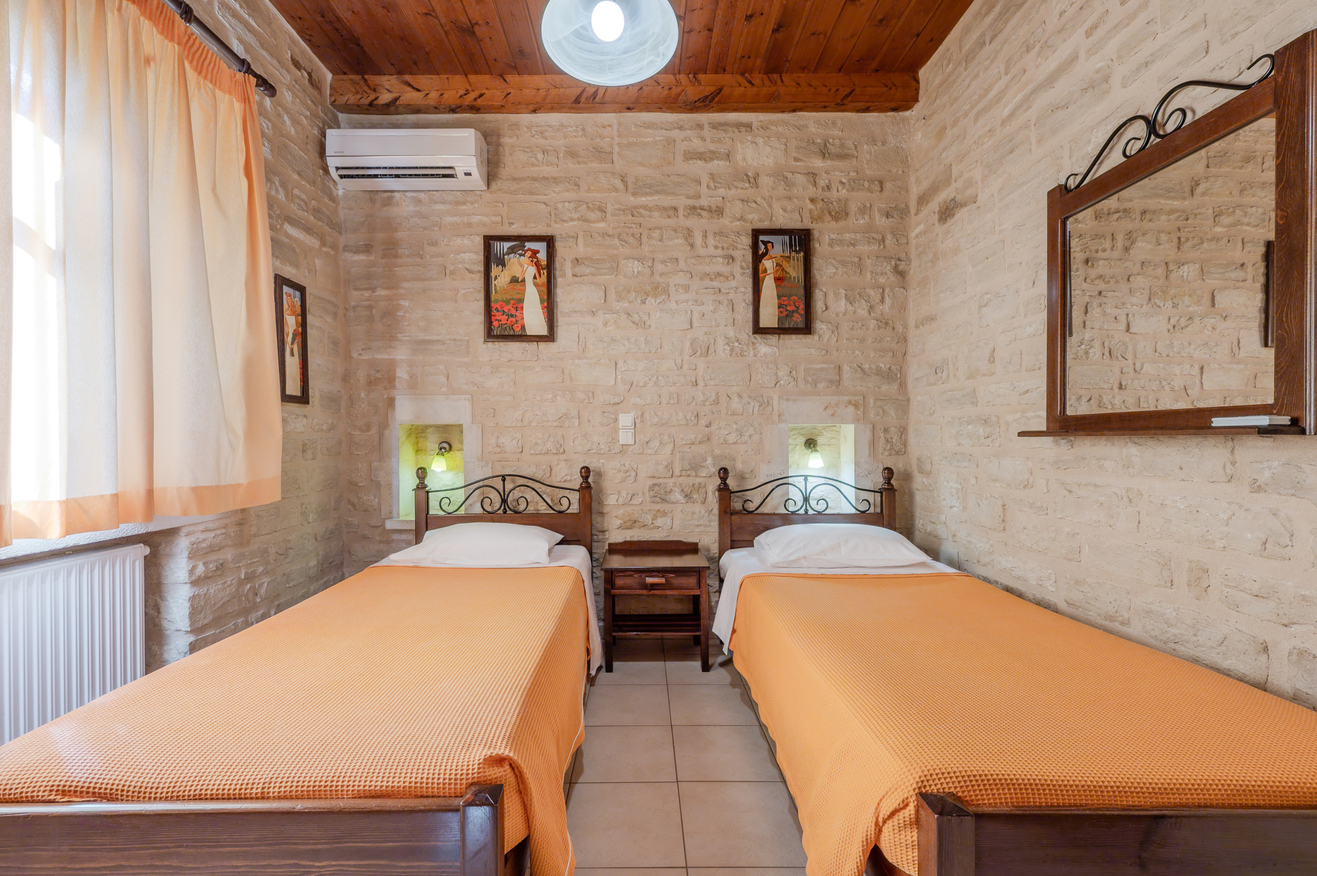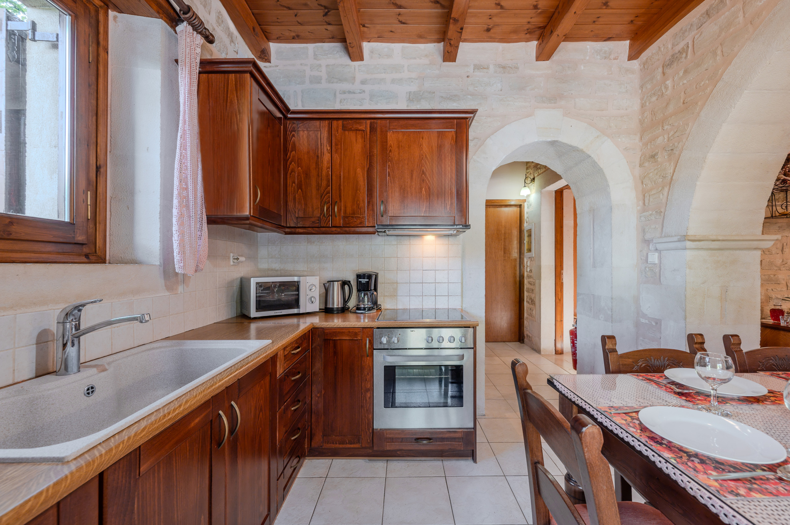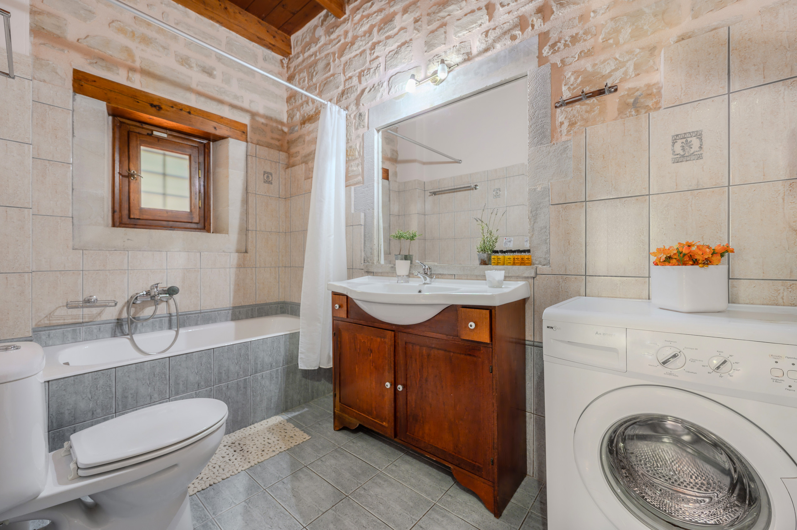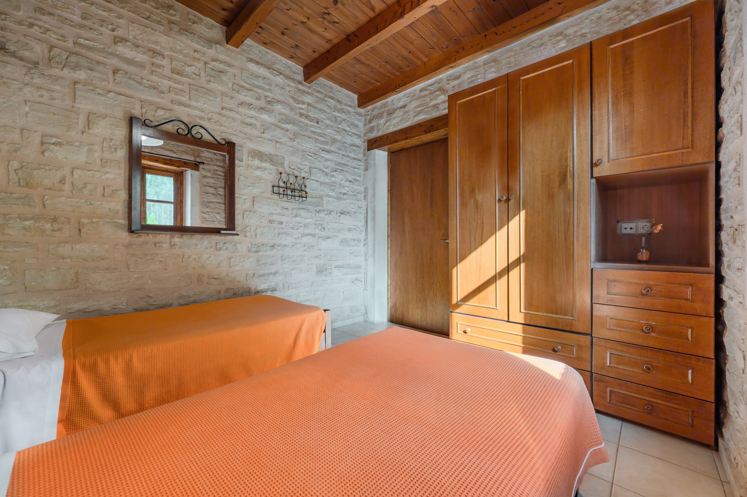 Designed in the warm, rustic style of Crete, the villa features handcrafted wooden furniture and a cozy atmosphere throughout. The ground floor hosts a spacious living room with a fireplace and a sofa that can also be turned into a bed, comfortably accommodating two additional guests.