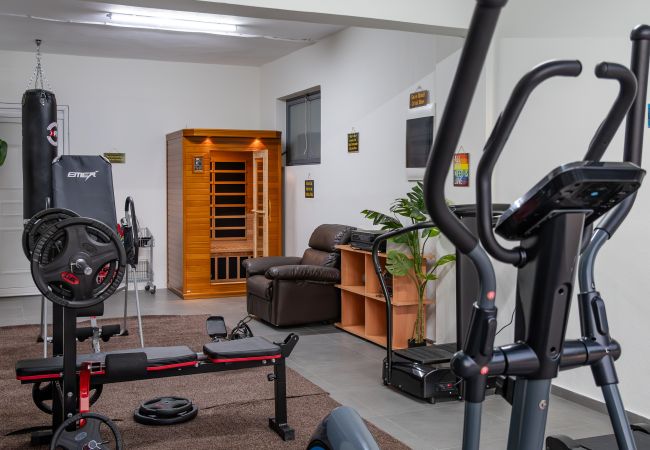 The villa’s exterior is just as impressive. At pool level, there are additional accommodations, including a studio with two single beds and a one-bedroom apartment with a double bed, both featuring a kitchenette for added convenience. The large swimming pool, along with a separate children's pool (both natural chlorinated with salt) , invites guests to cool off on warm days, while the surrounding terrace offers ample space to lounge and soak up the sun. For those seeking an active holiday, the villa also offers a well-equipped gym and a sauna, ensuring a balance of leisure and fitness. Children can enjoy various games in the garden area, while the adults can gather for an evening barbecue, making use of the garden’s outdoor furniture and facilities. The swimming pool can be heated on request, for months April, May and October.The extra charge for the heating is 100€ per day. For the months of November and December, pool heating is included in the rental rate.