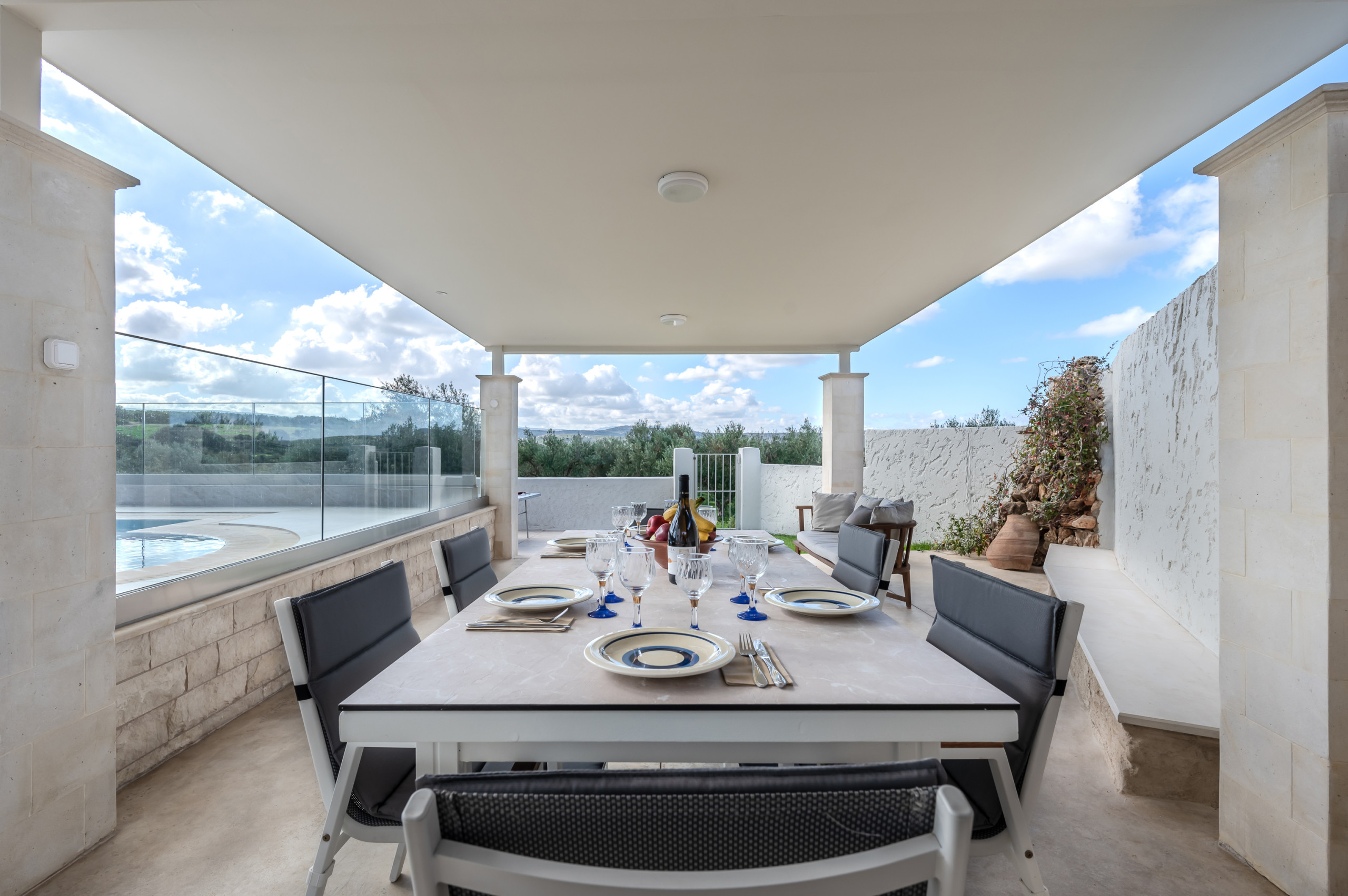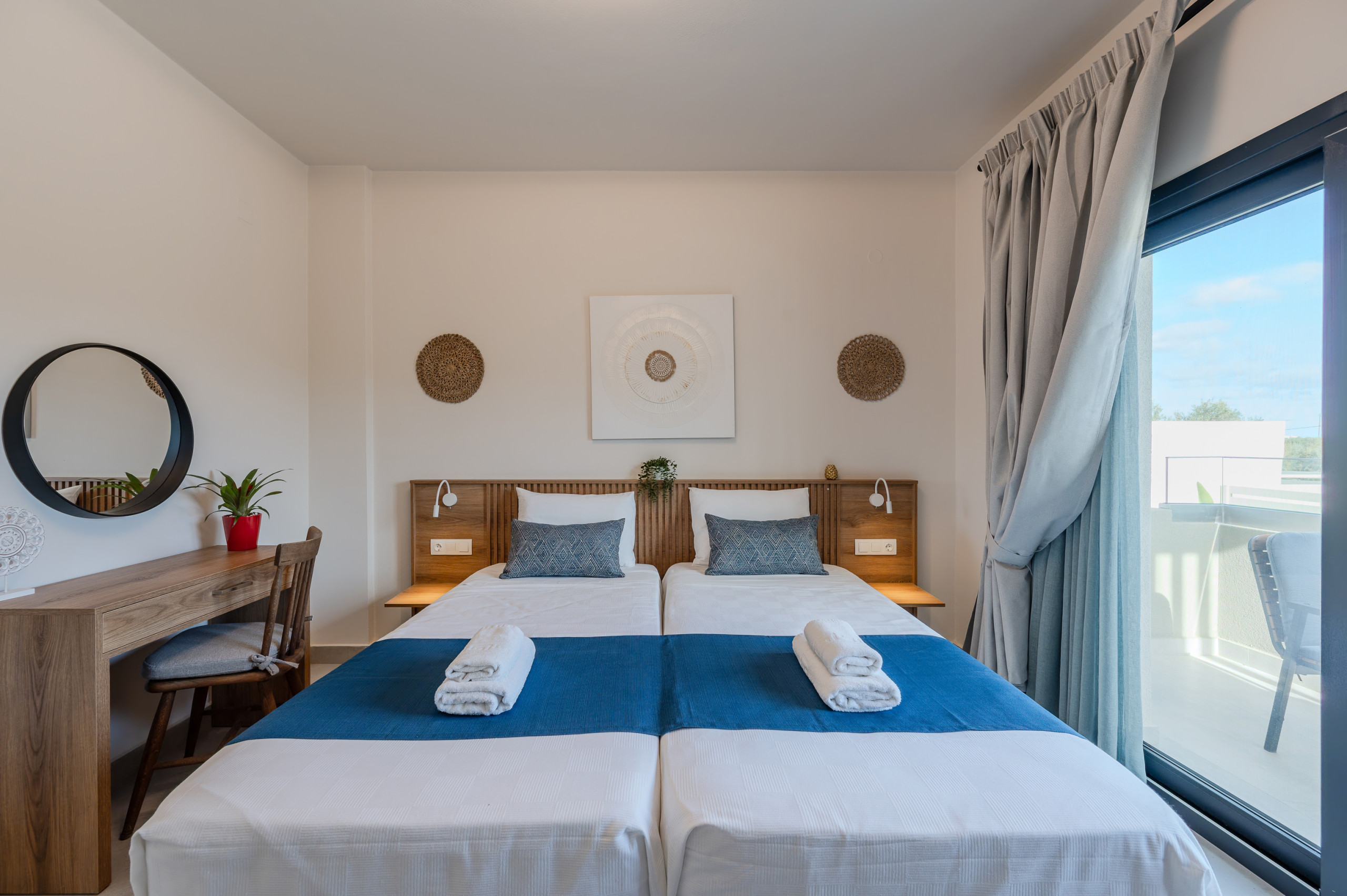 The villa comfortably accommodates up to 7 guests and is thoughtfully arranged over two levels.On the ground floor, guests will find a bright and stylish bedroom with two single beds and en-suite facilities, ideal for easy access. The same level features a fully equipped open-plan kitchen, modern and functional, seamlessly connected to a comfortable living area with a large TV. The sofa can accommodate one additional guest, making the space flexible for families or groups.