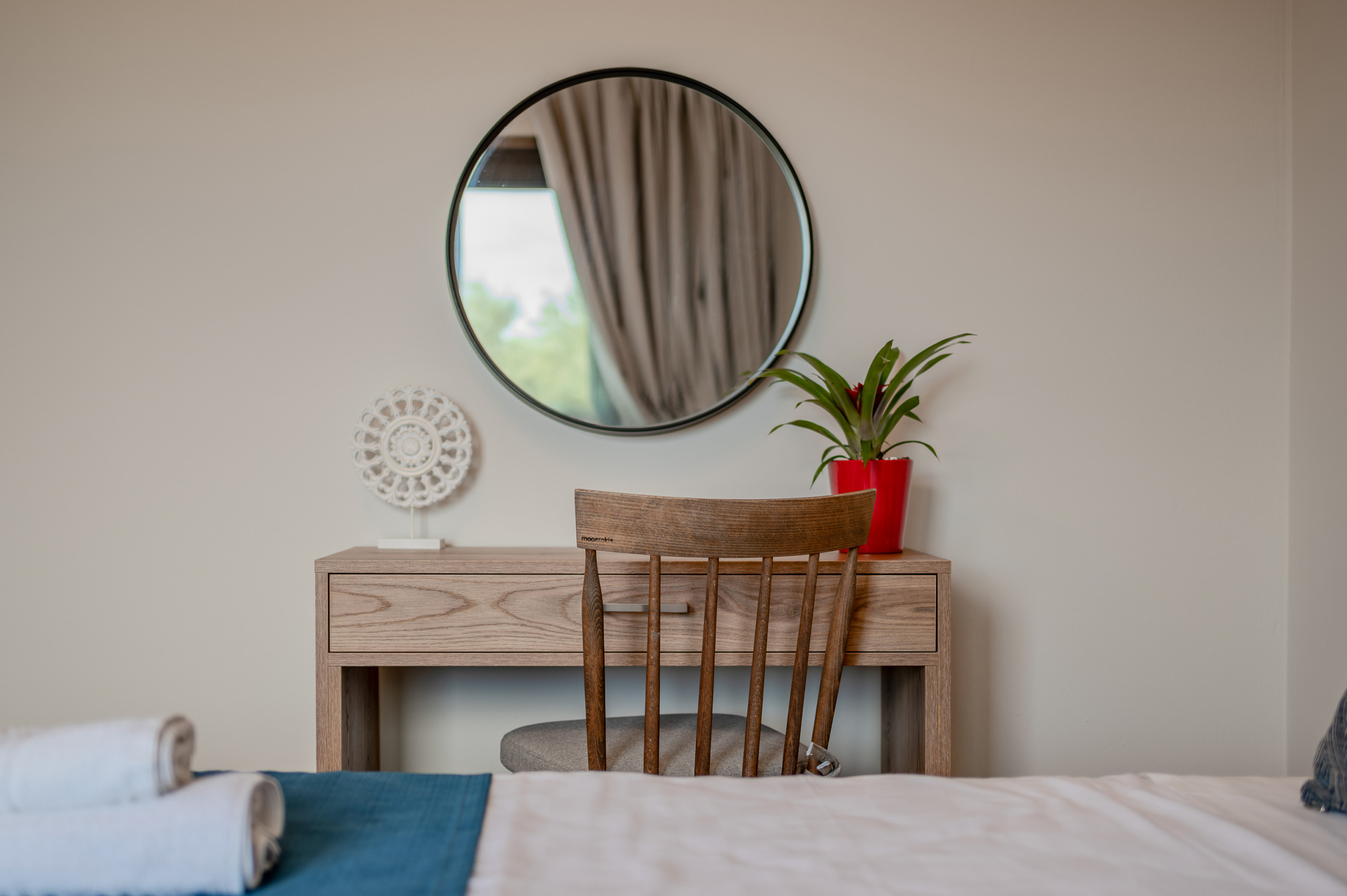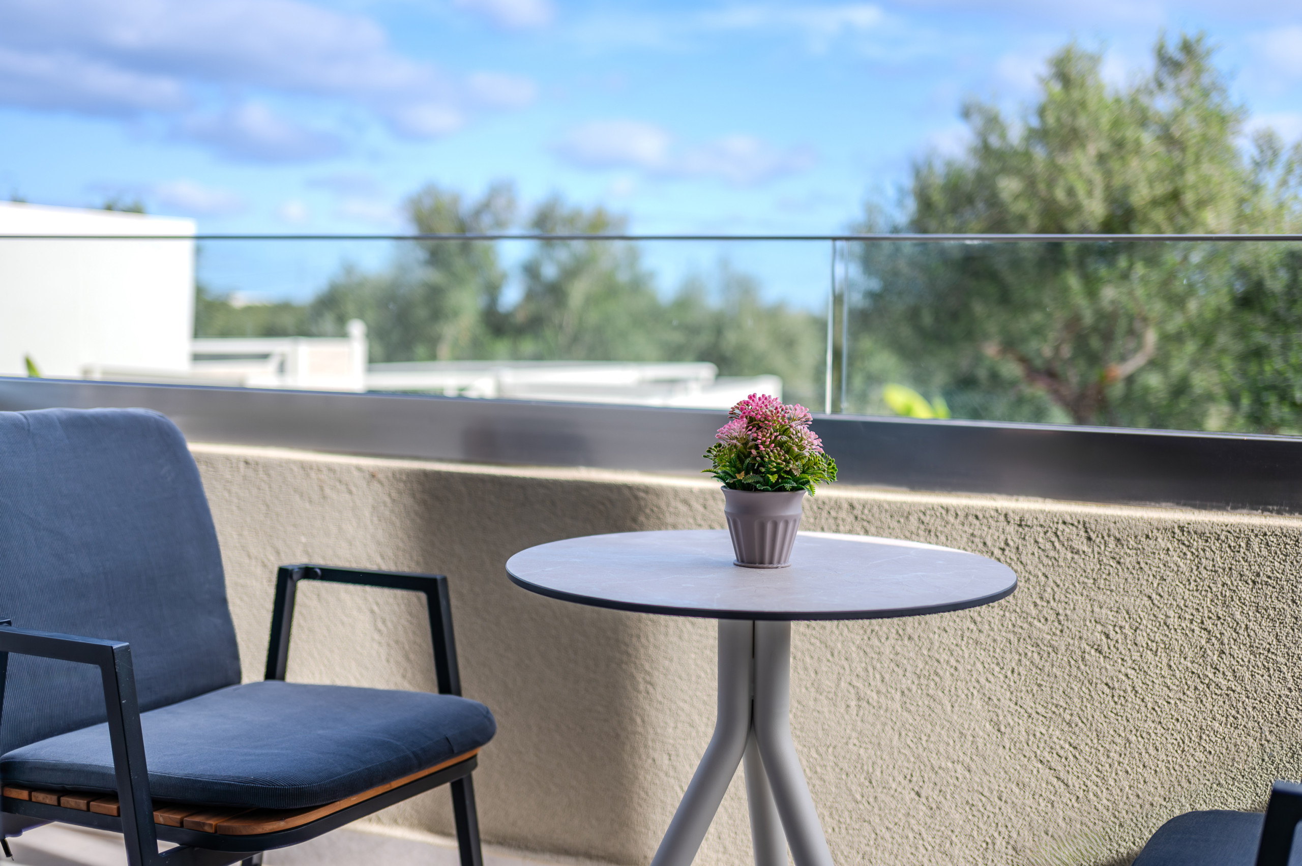 An internal staircase leads to the upper floor, where there are two additional bedrooms, each with en-suite bathrooms. One bedroom features a queen-size bed, while the other offers two single beds. Both bedrooms open onto private balconies furnished with outdoor seating, perfect for relaxing moments with countryside views.
