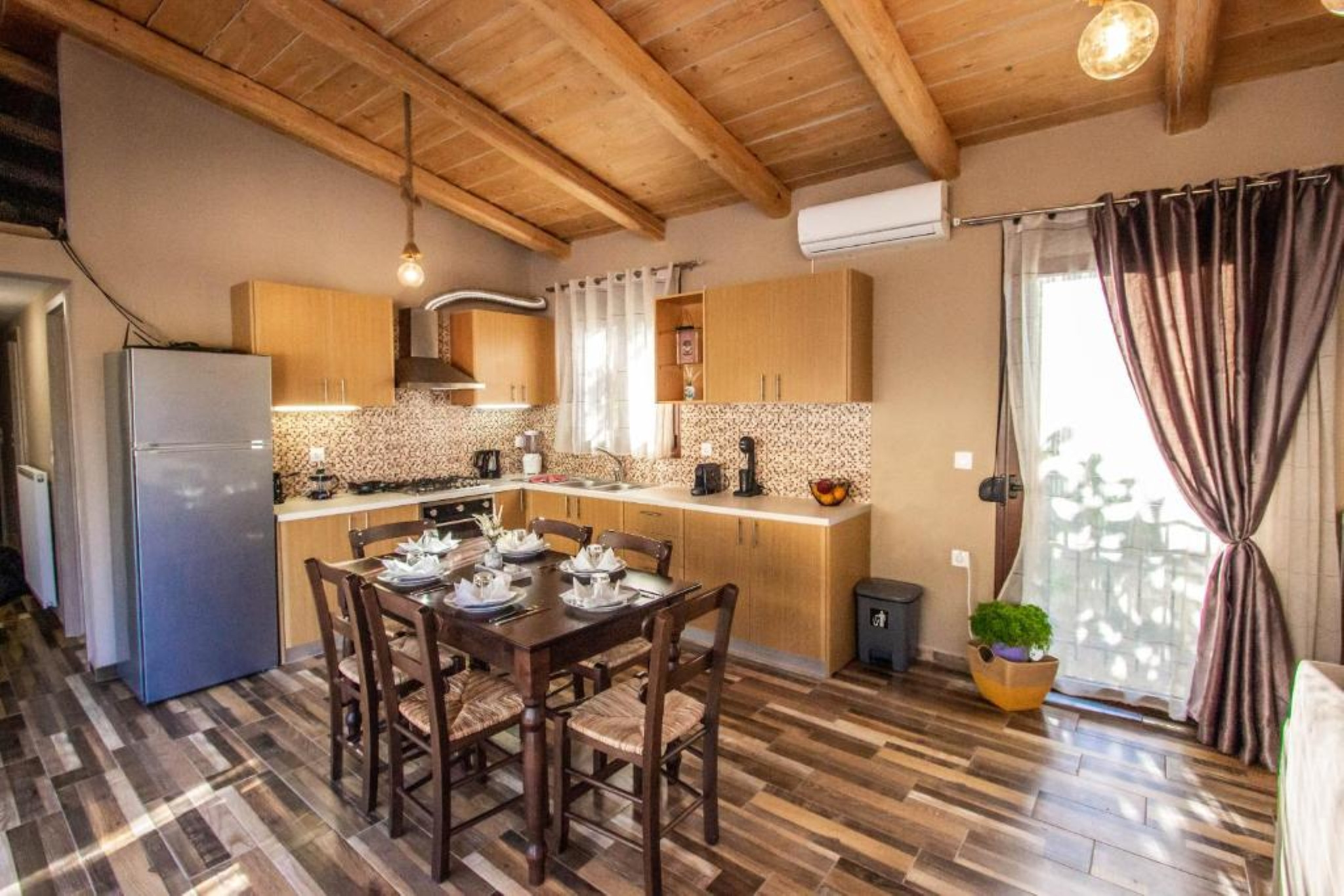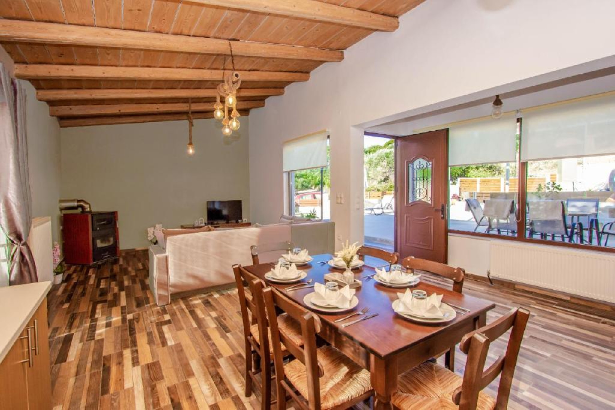 The bright open-plan living and dining area is decorated with wooden ceilings and elegant furnishings, creating a warm and welcoming atmosphere. The fully equipped kitchen includes a refrigerator, oven, freezer, espresso coffee machine, kettle, toaster, cookware, and complete dining sets, allowing guests to prepare meals with ease. A dining table with seating for six guests is also available indoors.