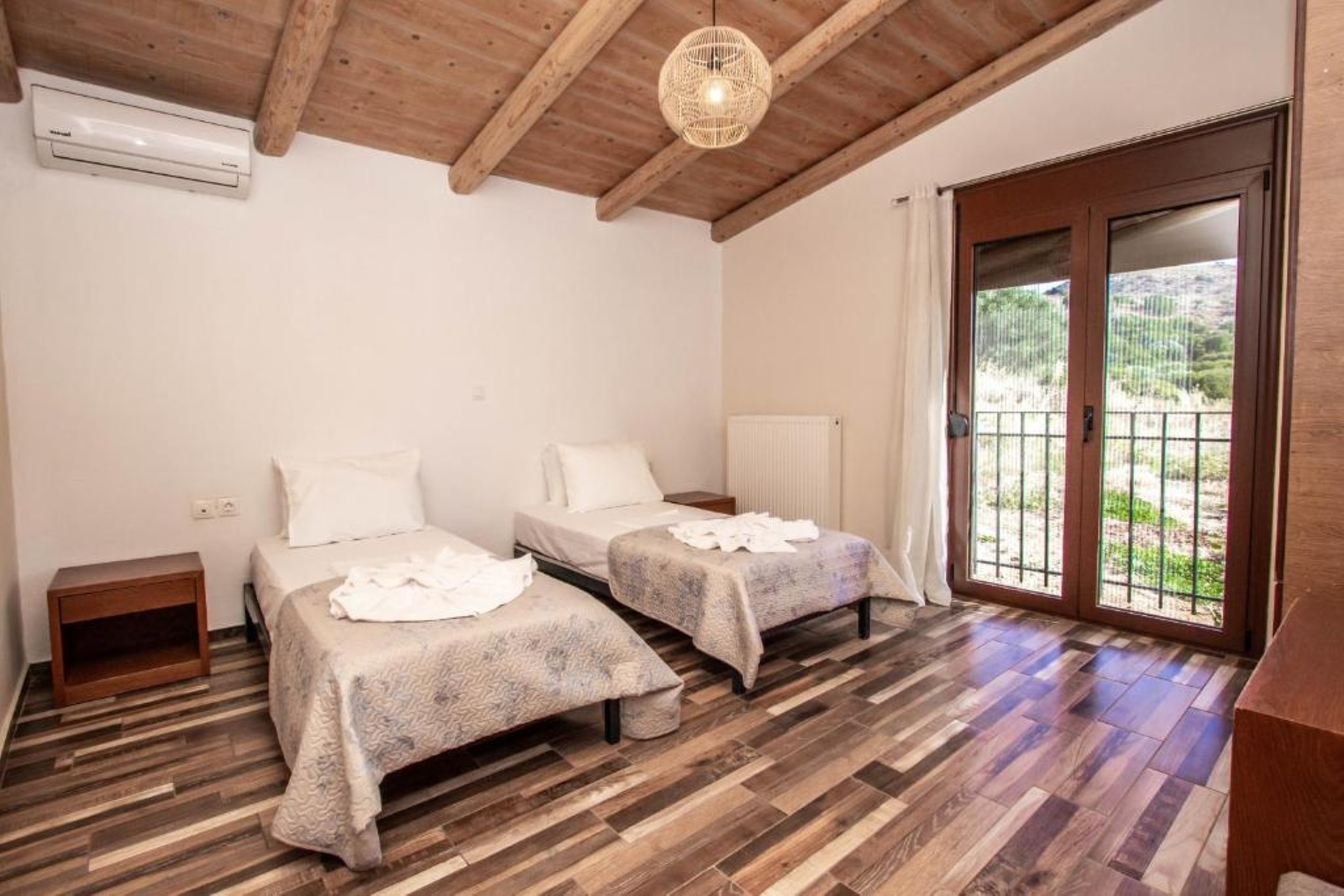 The property features three tastefully designed bedrooms, each equipped with two single beds that can be joined to form double beds, spacious wardrobes, air conditioning, and high-quality linens. In addition, a sofa bed in the living area provides accommodation for one extra guest, allowing the villa to comfortably host up to seven guests.