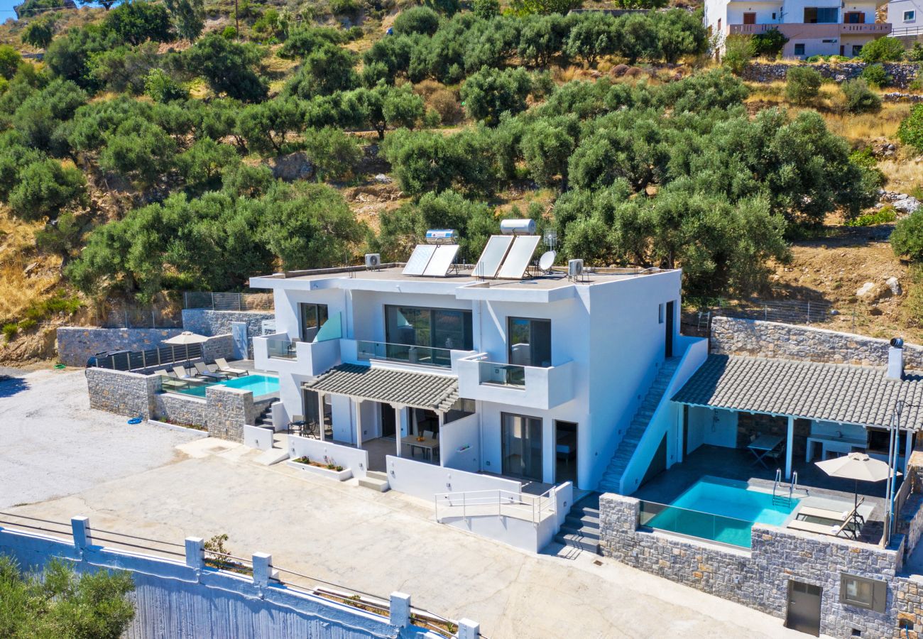 Petasos Villa boasts a generous 80 sqm of space, comprising 2 bedrooms and 2 bathrooms. On the ground floor, you'll discover a double bedroom with twin beds that can be converted into a double-bed, along with an en-suite bathroom featuring a large shower and WC. An external staircase leads to the upper floor, where a second bedroom, a spacious shower/WC, and a lovely open-plan living and dining area seamlessly connect to a fully equipped modern kitchen. This level features large French windows that open to a spacious veranda, complete with patio furniture and breathtaking views of the Libyan Sea and the surrounding area.